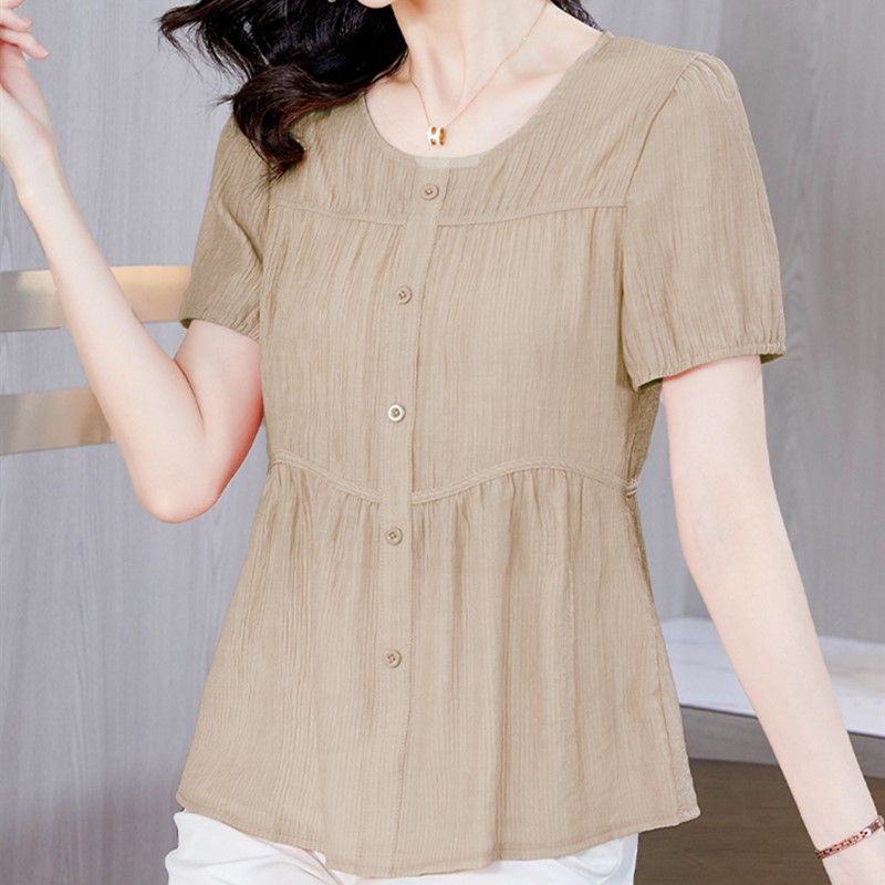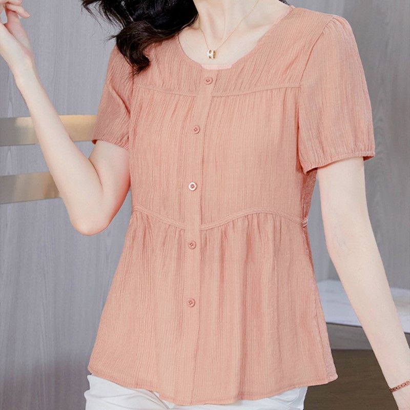 여성 셔츠 반팔 티셔츠 2025 여름 새로운 스타일 탑 라운드 넥 셔츠 패션 세련된 절묘한 작은 셔츠 탑스토어 가기