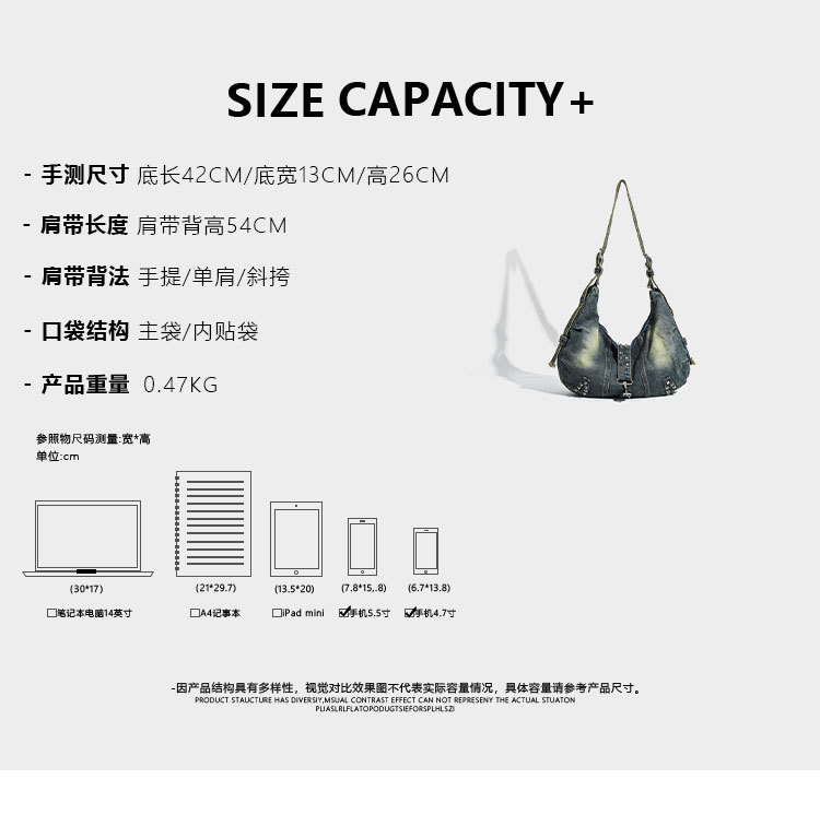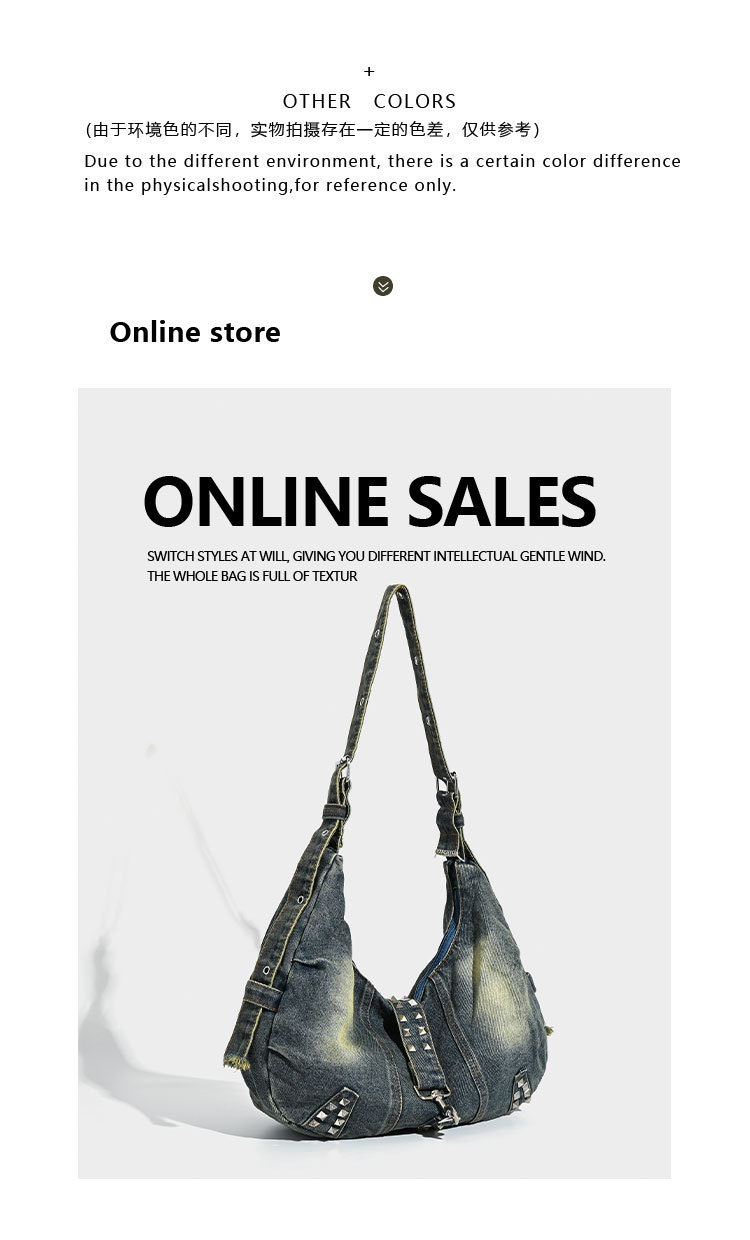 2025 새로운 대용량 세탁 데님 가방 토트 백 리벳 아메리칸 스타일 Ins 스타일 여성 가방 스타일 어깨 가방 크로스 테두리스토어 가기