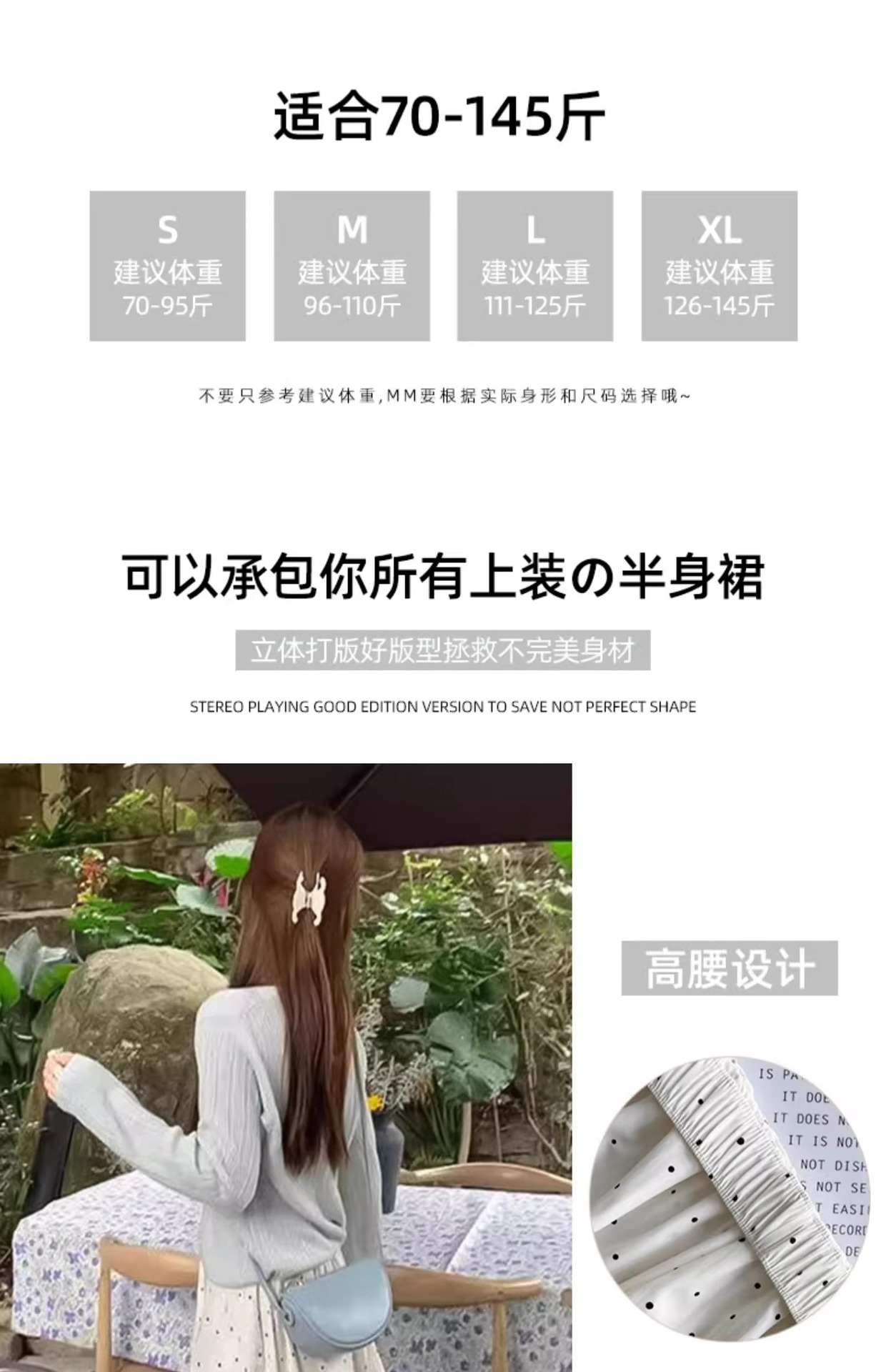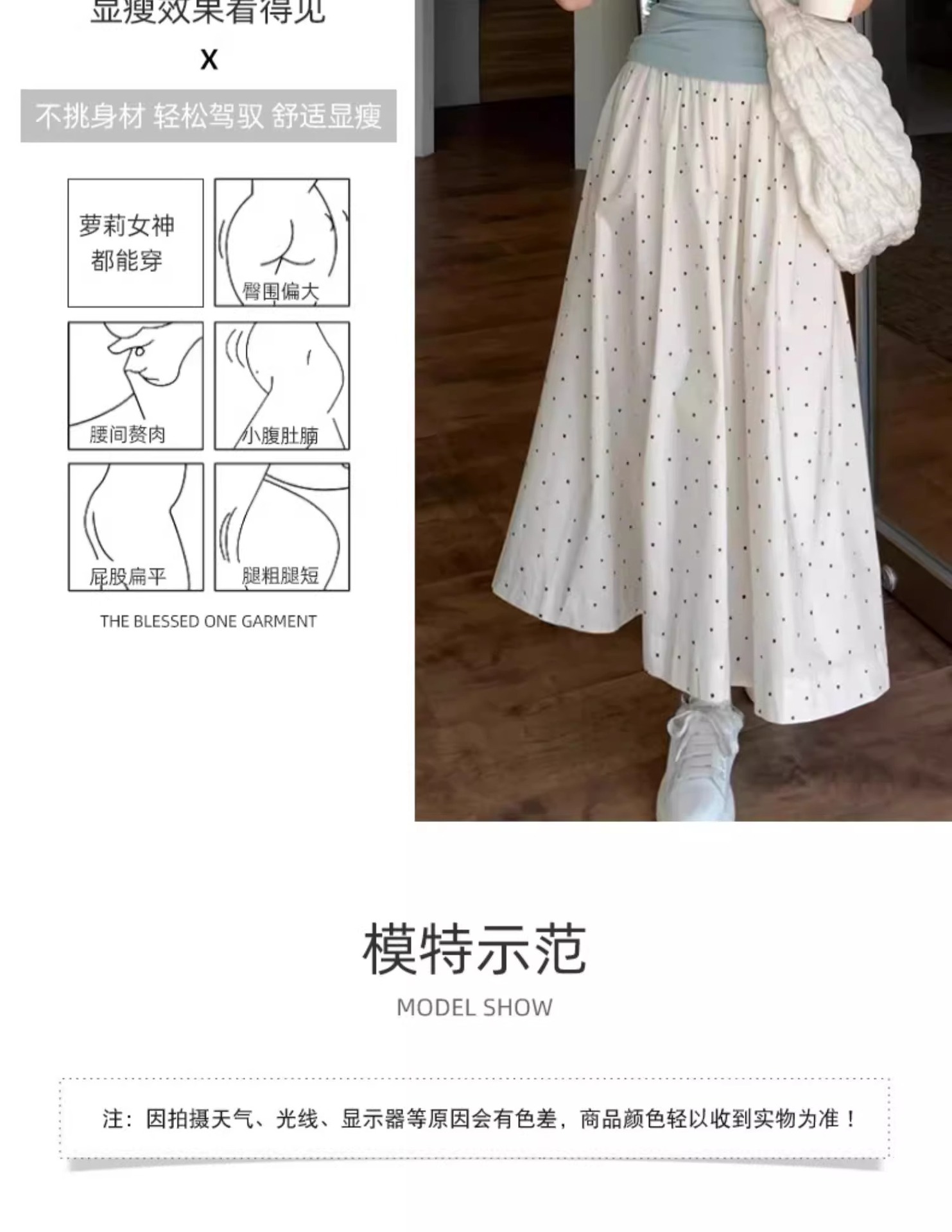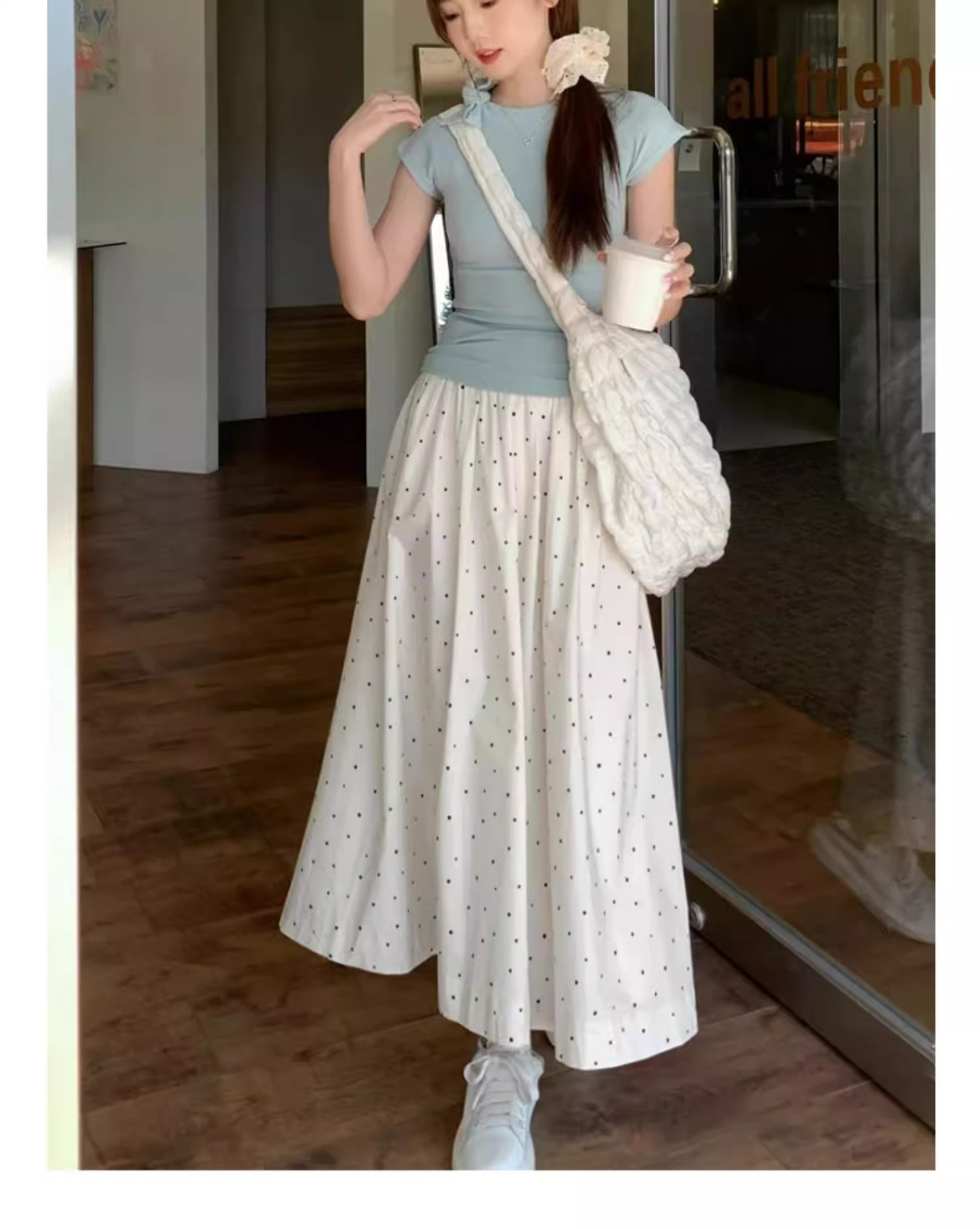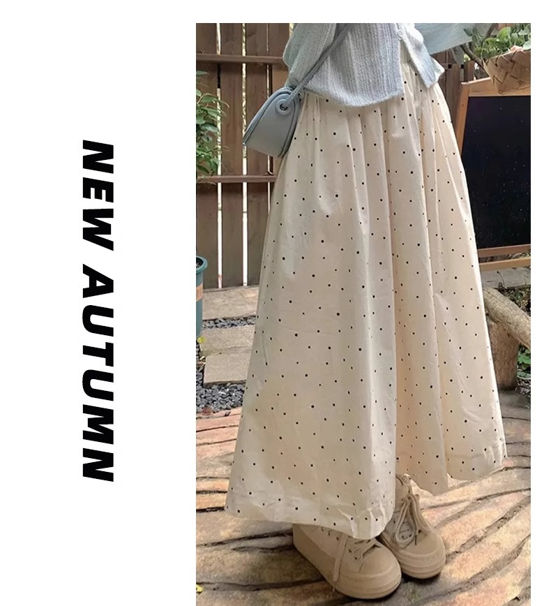 화이트 웨이브 도트 스커트 여성의 봄과 여름 2025 새로운 높은 허리 엉덩이 커버 슬리밍 A 라인 스커트 부드러운 스타일 대형 우산 스커트스토어 가기