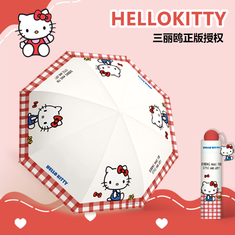 정품 공인 산리오 헬로 키티 매뉴얼 3 배 우산 햇빛과 비 이중 목적 반 태양 만화 귀여운 휴대용 접는 우산