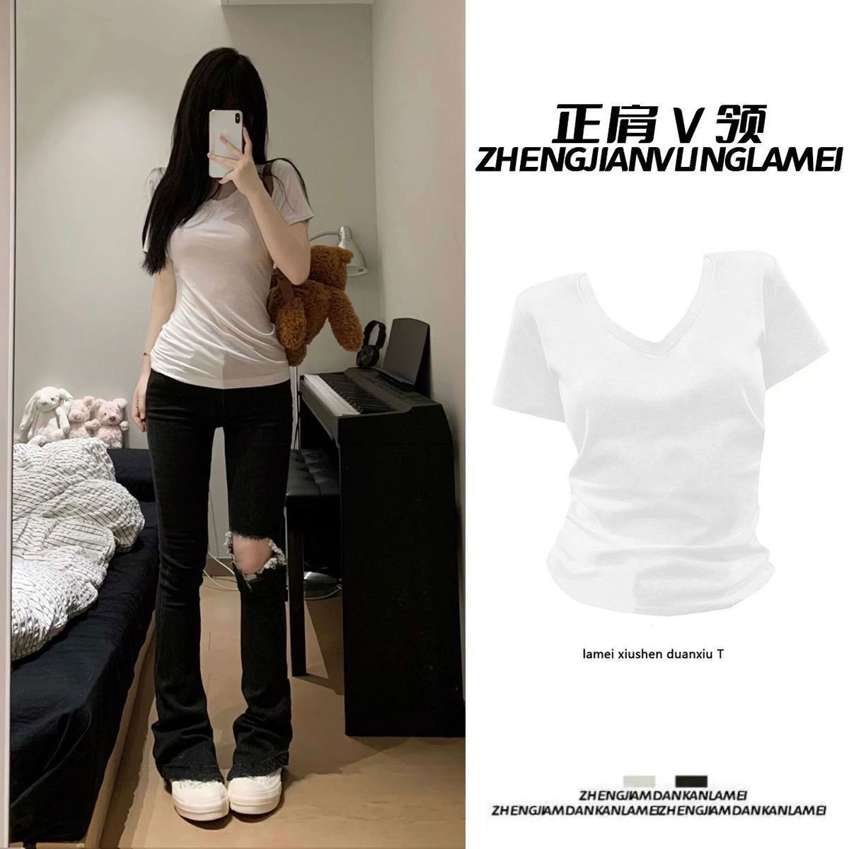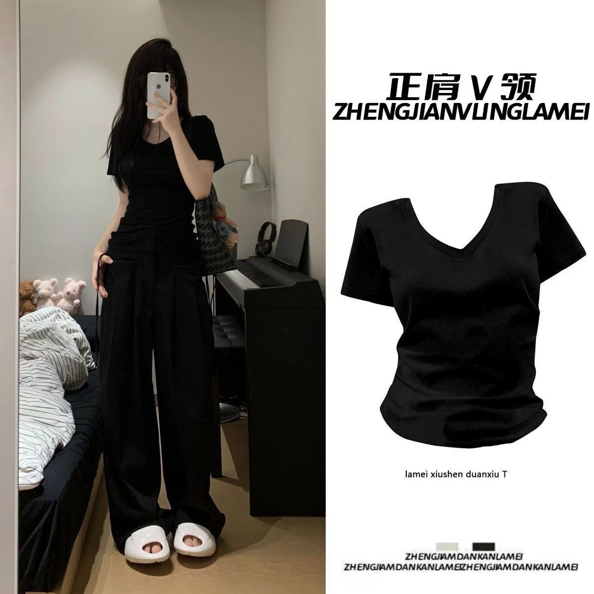 여름 여성용 아메리칸 레트로 오른쪽 어깨 브이넥 티셔츠 얇은 순수한 욕망 슬림핏 허리 반팔 셔츠와 짧은 탑스토어 가기