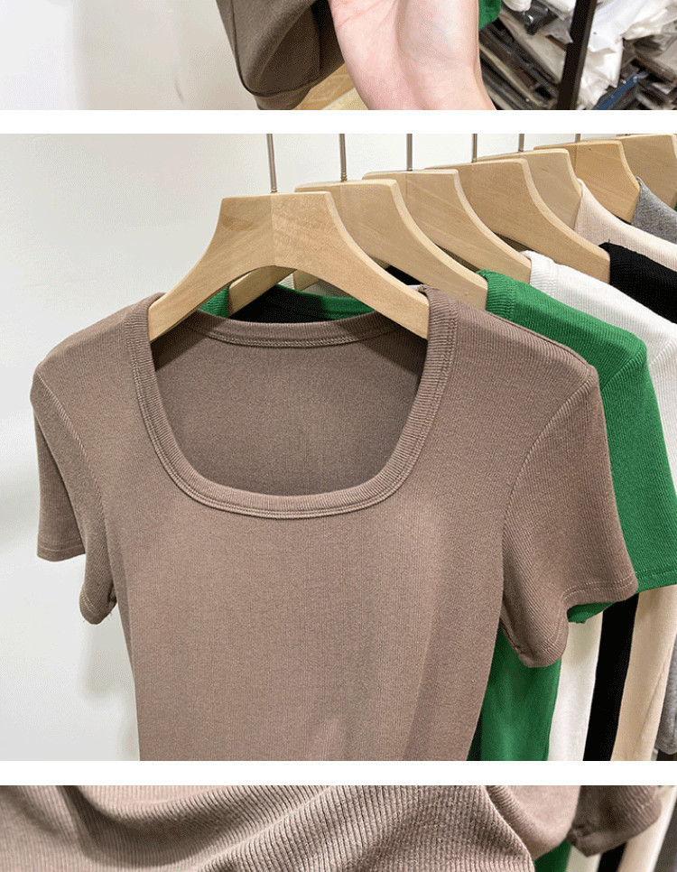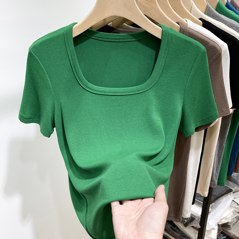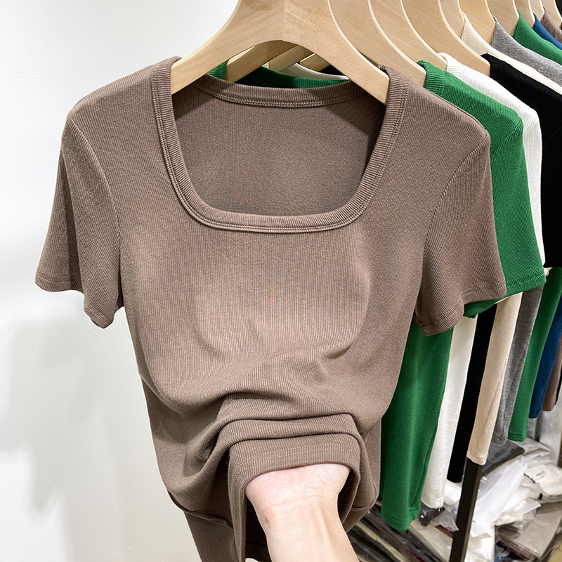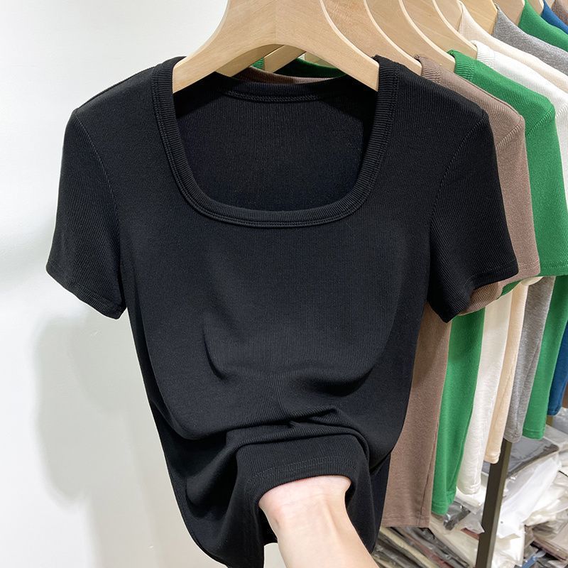 플러스 사이즈 스퀘어 칼라 반팔 티셔츠 여성 의류 통통한 mm2025 여름 새로운 로우 컷 쇄골 스레드 티셔츠 U-칼라 탑스토어 가기