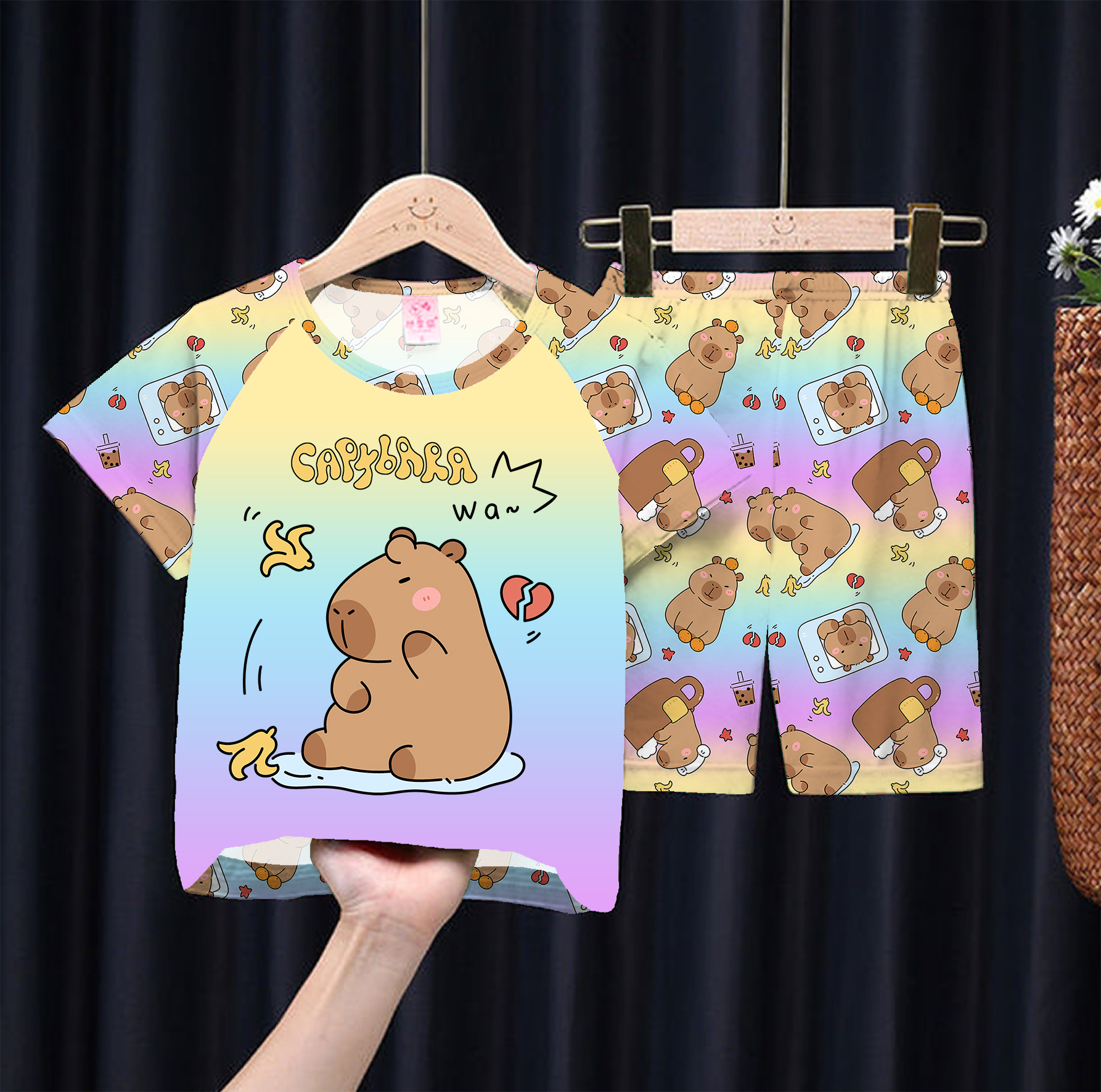 대외 무역 소년 잠옷 반팔 여름 스타일 소녀 아기 귀여운 얇은 여름 만화 정장 큰 어린이를위한 가정 옷