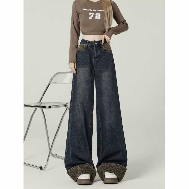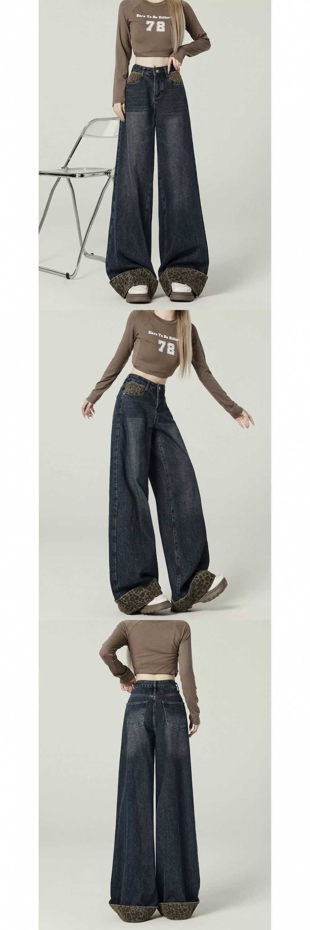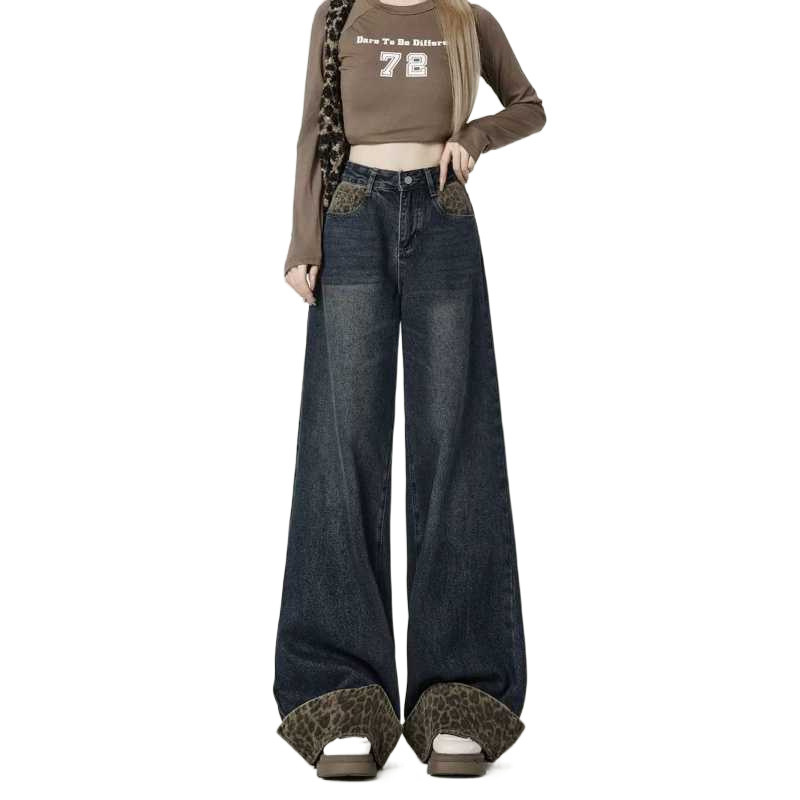 아메리칸 레트로 디자인 레오파드 프린트 커프스 와이드 레그 청바지 여성용 신상 하이웨이스트 루즈 슬리밍 바닥 길이 바지스토어 가기