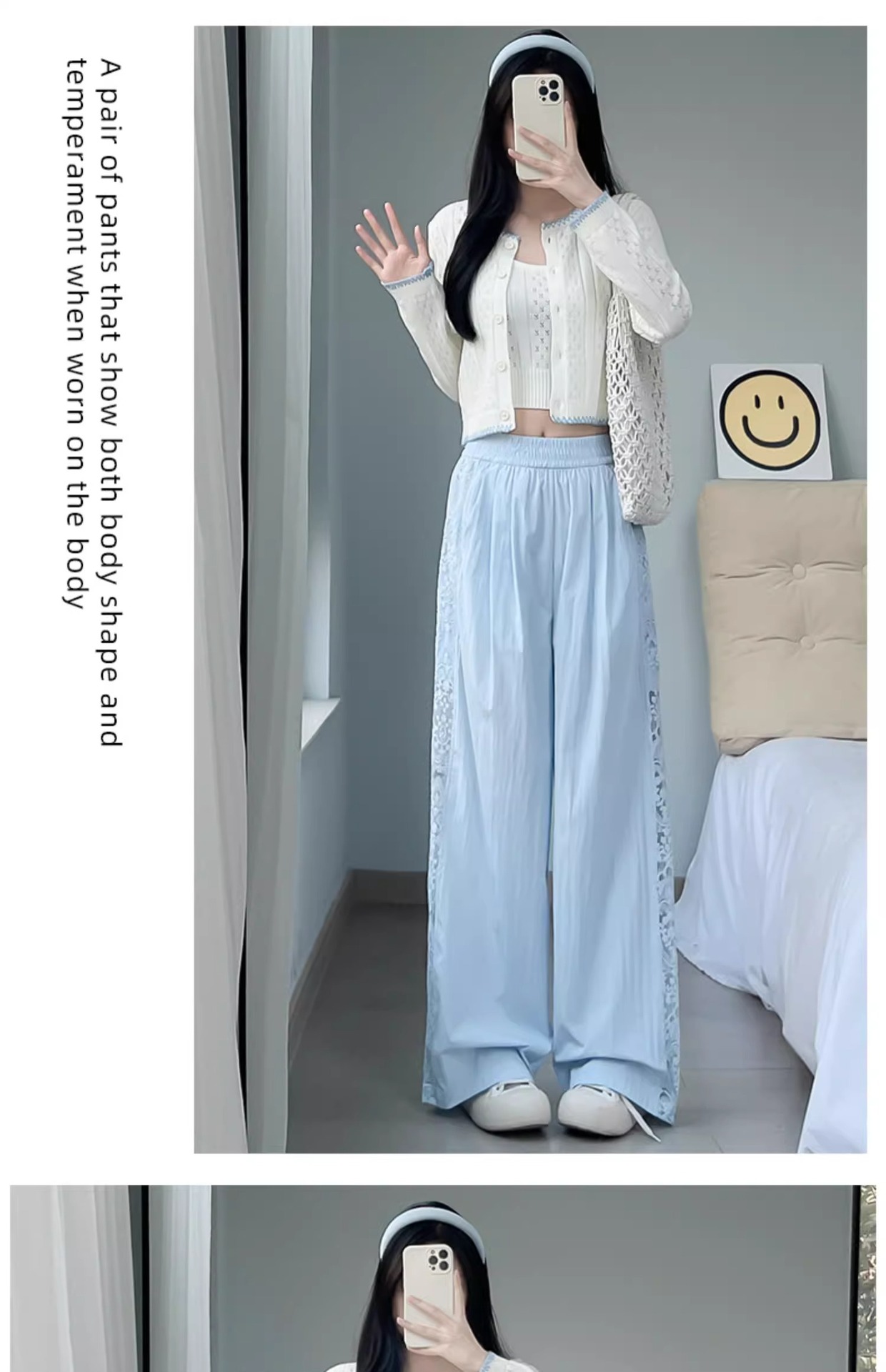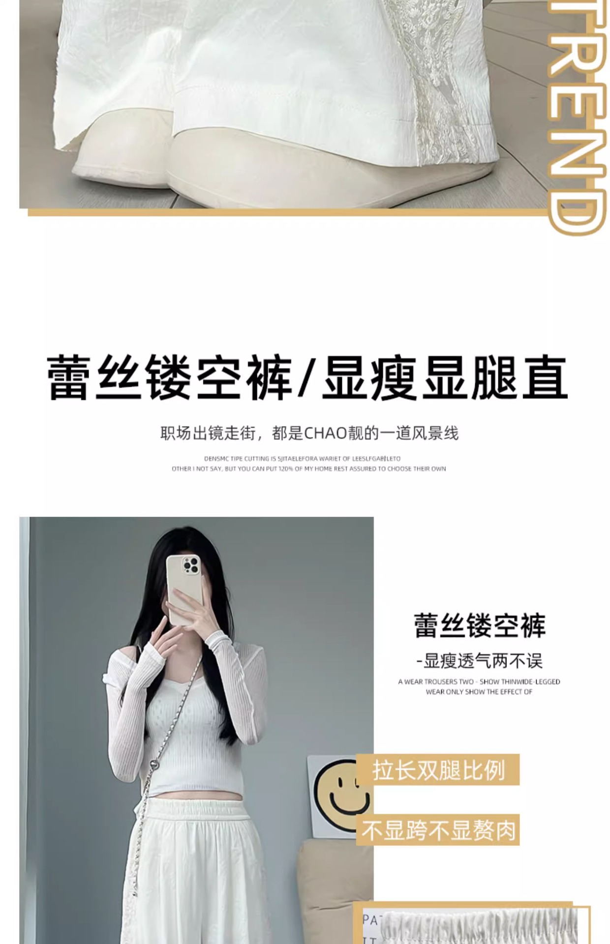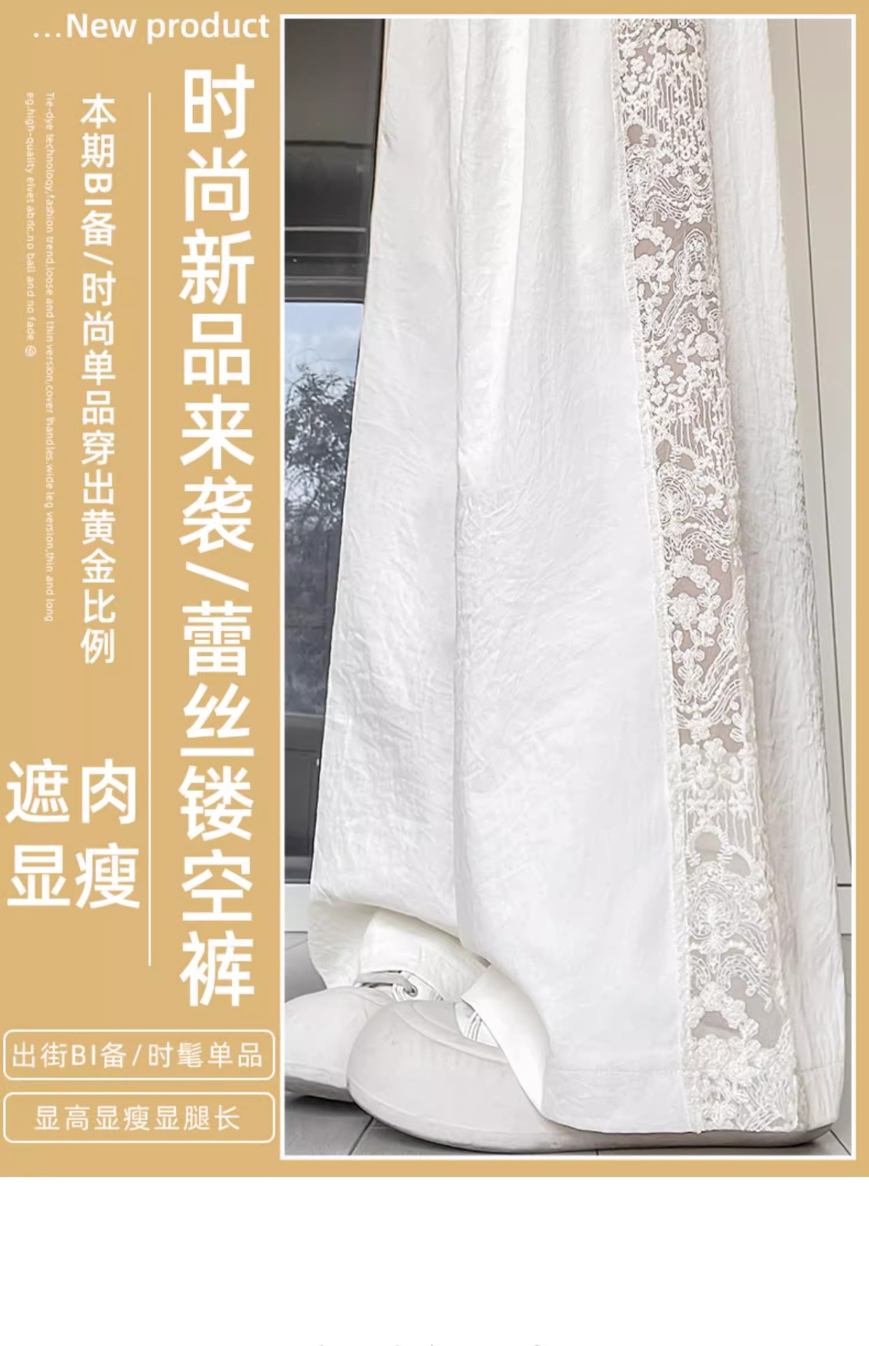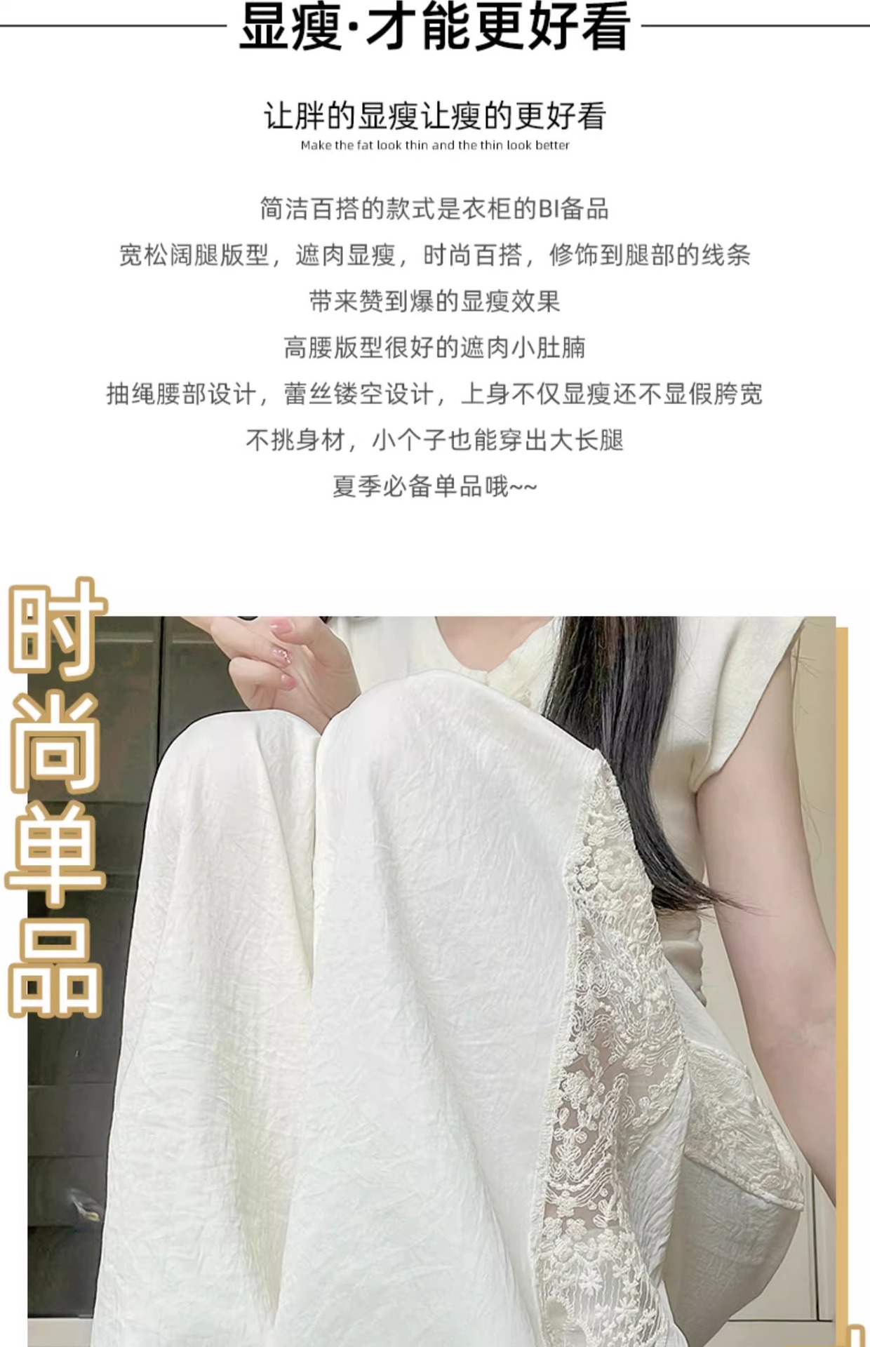 레이스 와이드 레그 바지 여성용 여름 얇은 2025 새로운 하이 웨이스트 캐주얼 새로운 중국 스타일 국가 스타일 할로우 아이스 실크 쿨 바지스토어 가기