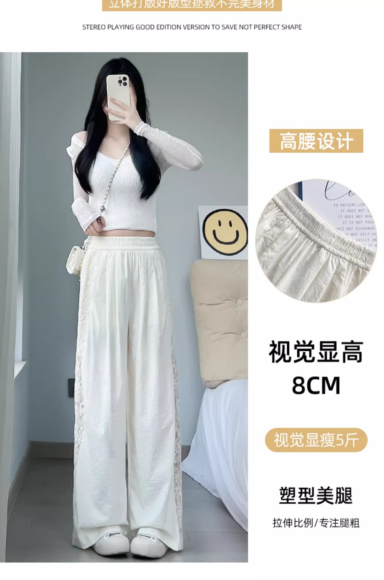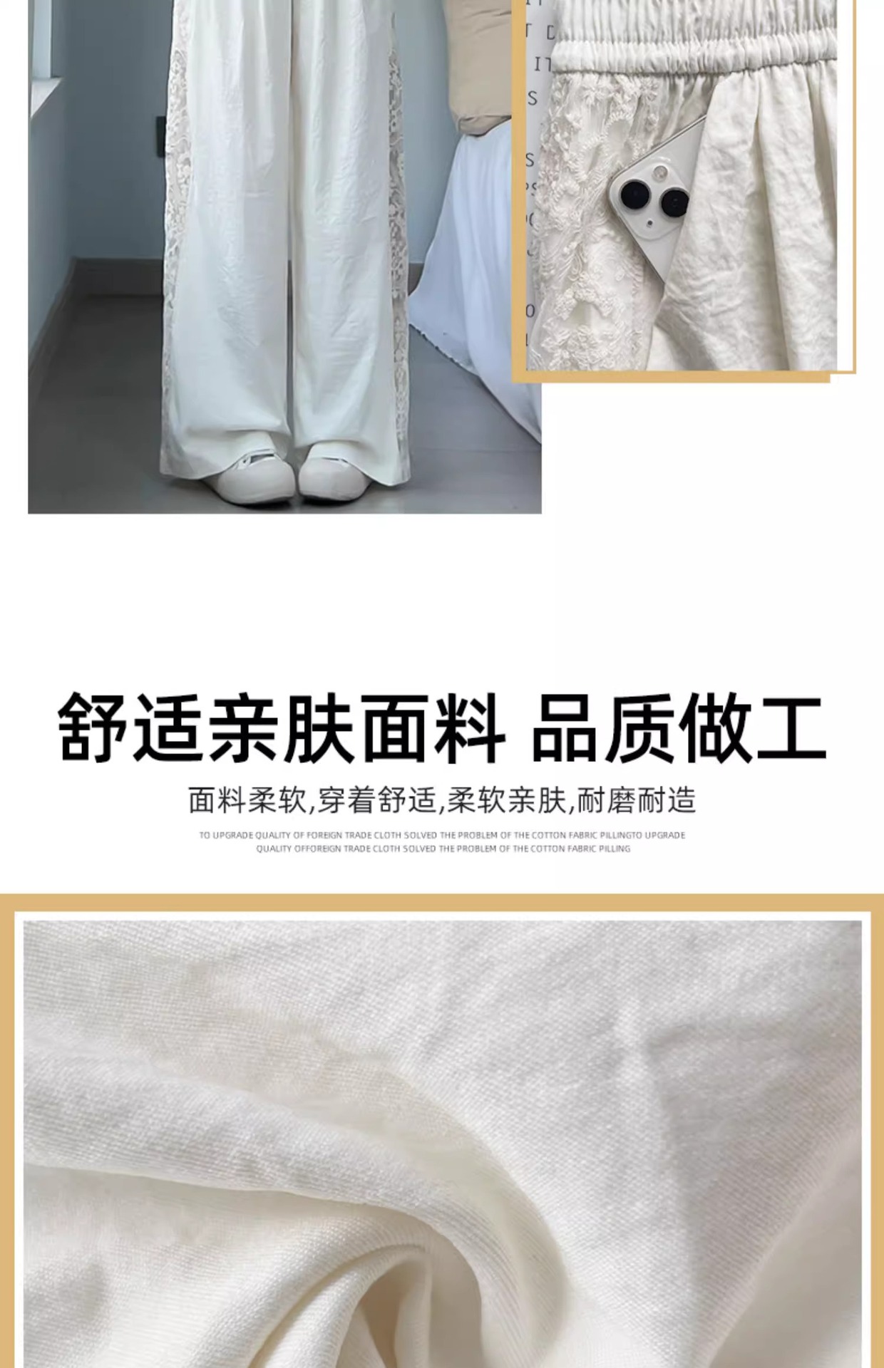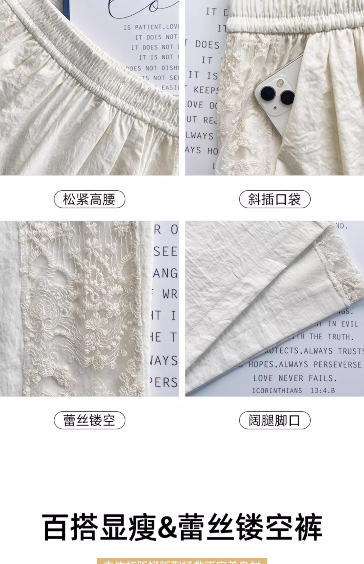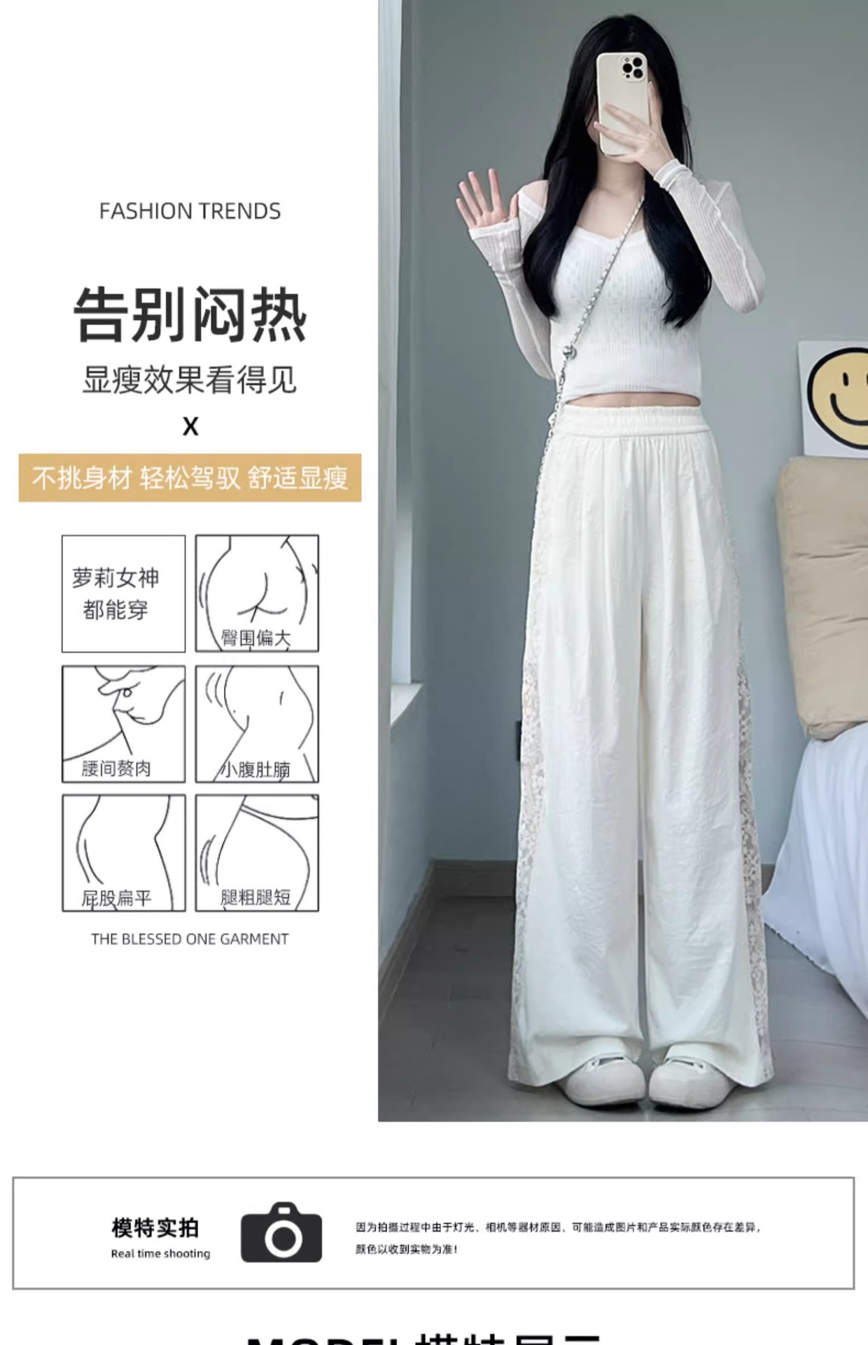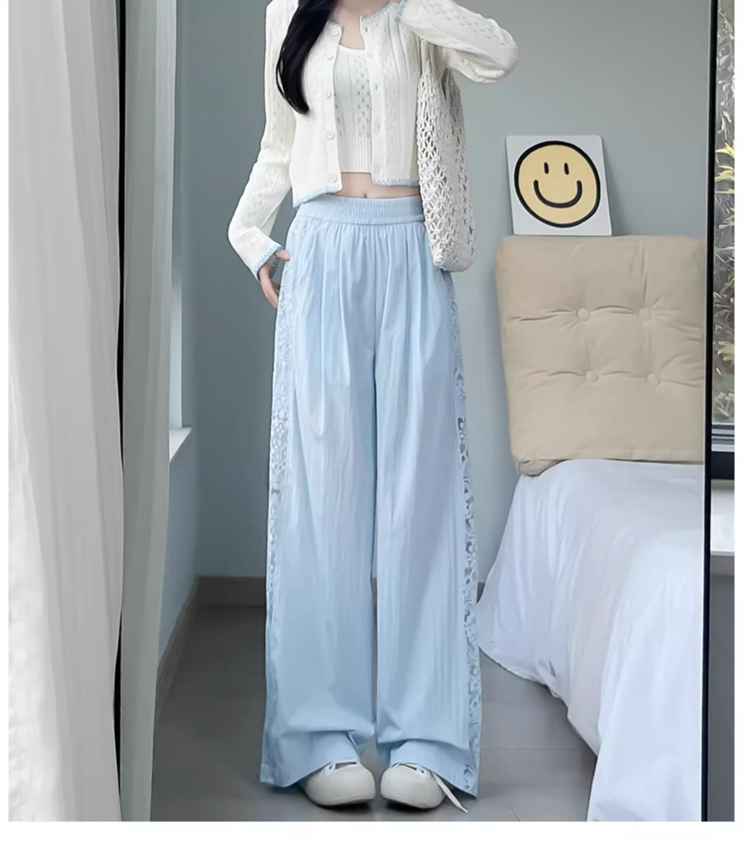 레이스 와이드 레그 바지 여성용 여름 얇은 2025 새로운 하이 웨이스트 캐주얼 새로운 중국 스타일 국가 스타일 할로우 아이스 실크 쿨 바지스토어 가기