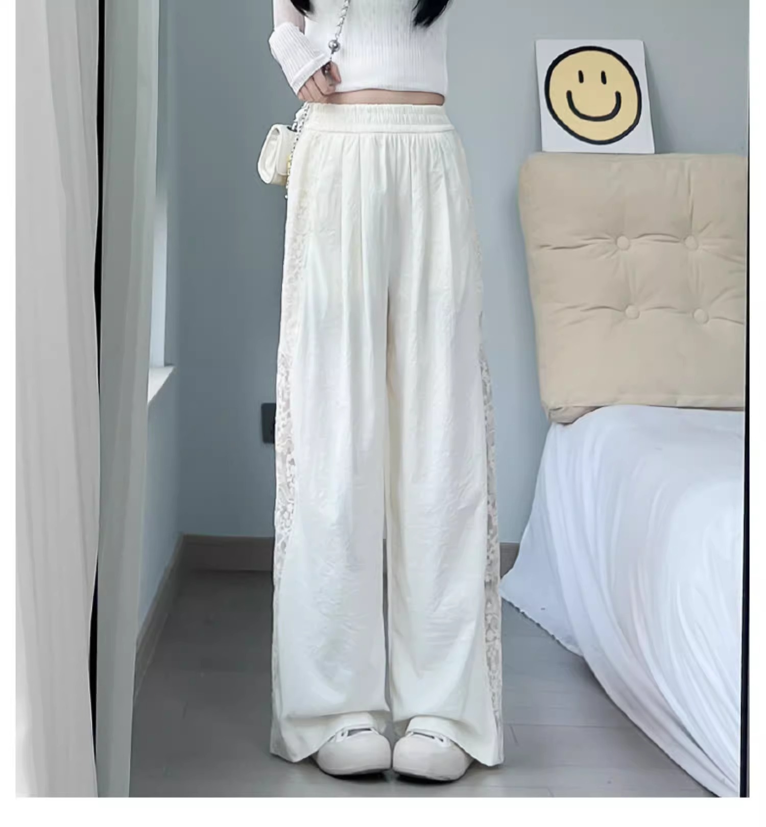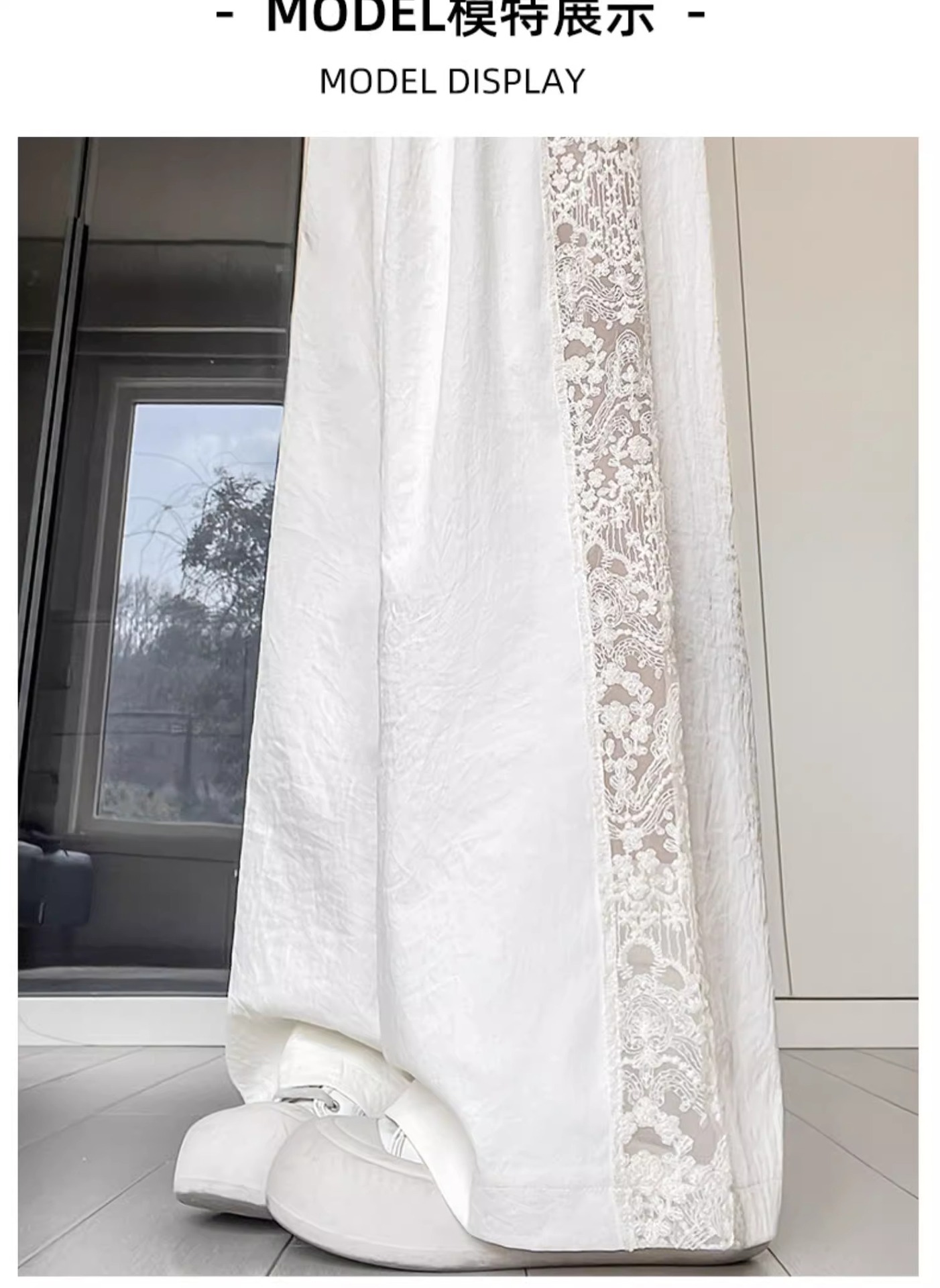레이스 와이드 레그 바지 여성용 여름 얇은 2025 새로운 하이 웨이스트 캐주얼 새로운 중국 스타일 국가 스타일 할로우 아이스 실크 쿨 바지