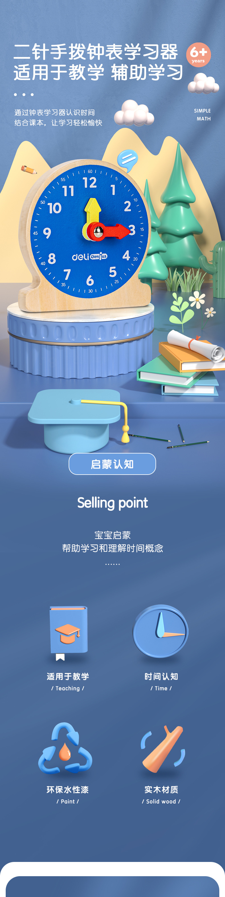 델리 YX447 초등학생을위한 나무 시계 학습기 1 학년 및 2 학년 시계 교육 보조 어린이 시계 모델