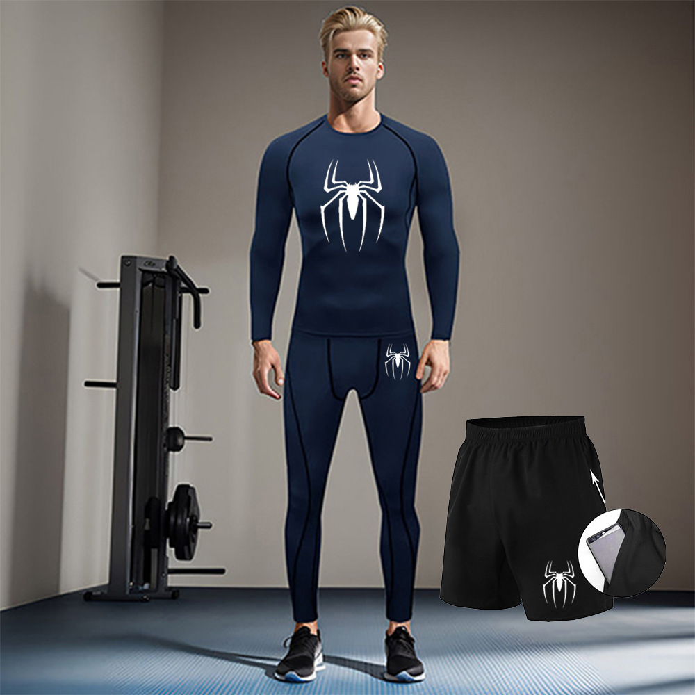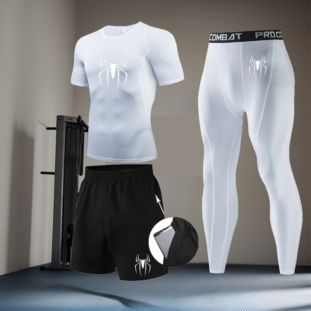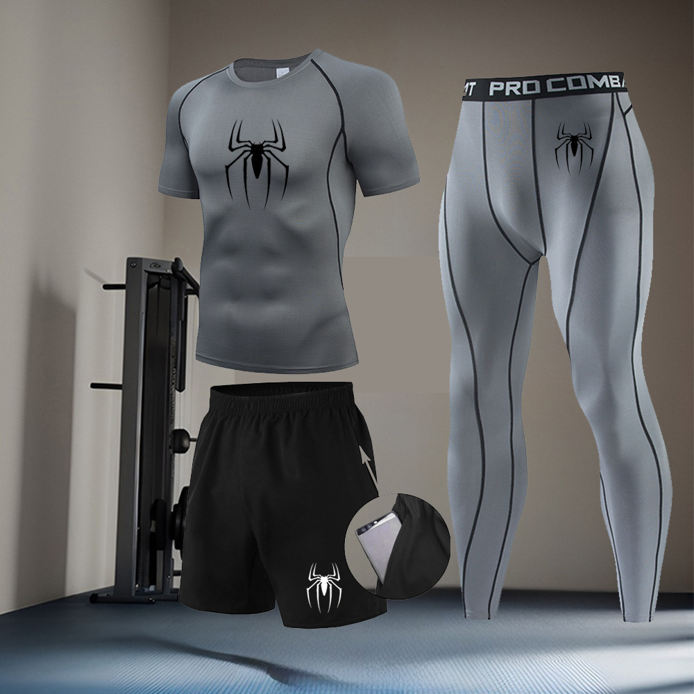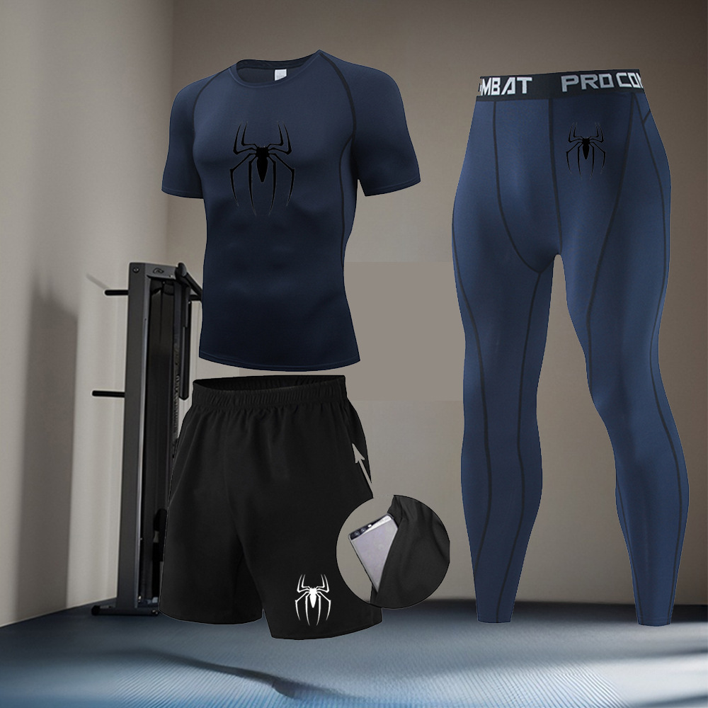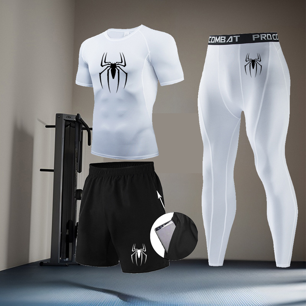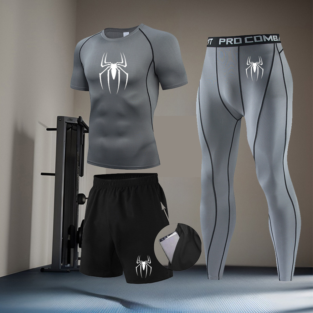 패션 남자 압축 스파이더 맨 3 피스 세트 빠른 건조 긴 소매 스타킹 러닝 스포츠 정장 농구 훈련 양복