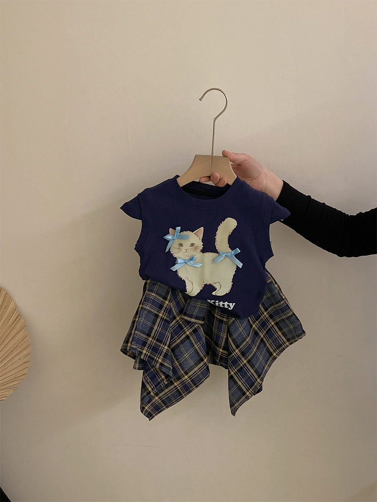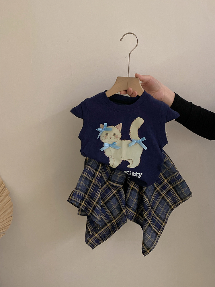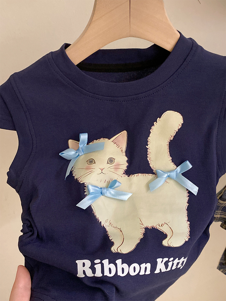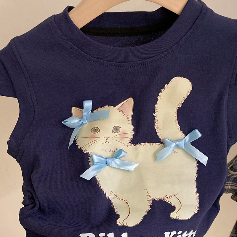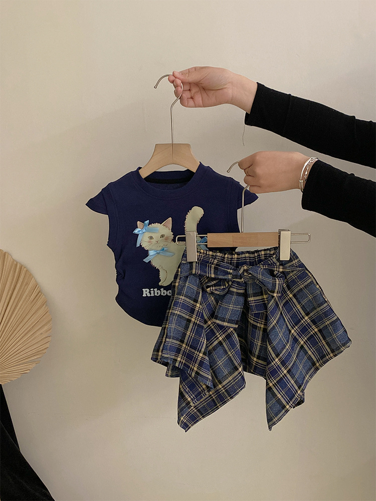 여자 여름 2025 새로운 새끼 고양이 인쇄 만화 반팔 최고 불규칙한 활 스커트 투피스 세트스토어 가기