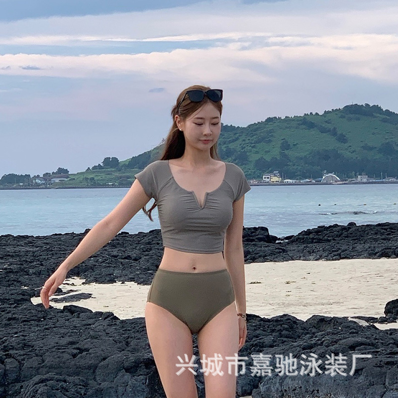 크로스보더 한국 인스 스타일 복고풍 심플 반팔 큰 가슴 스플릿 하이웨이스트 배 커버 보수적인 수영복 여성 수영복스토어 가기