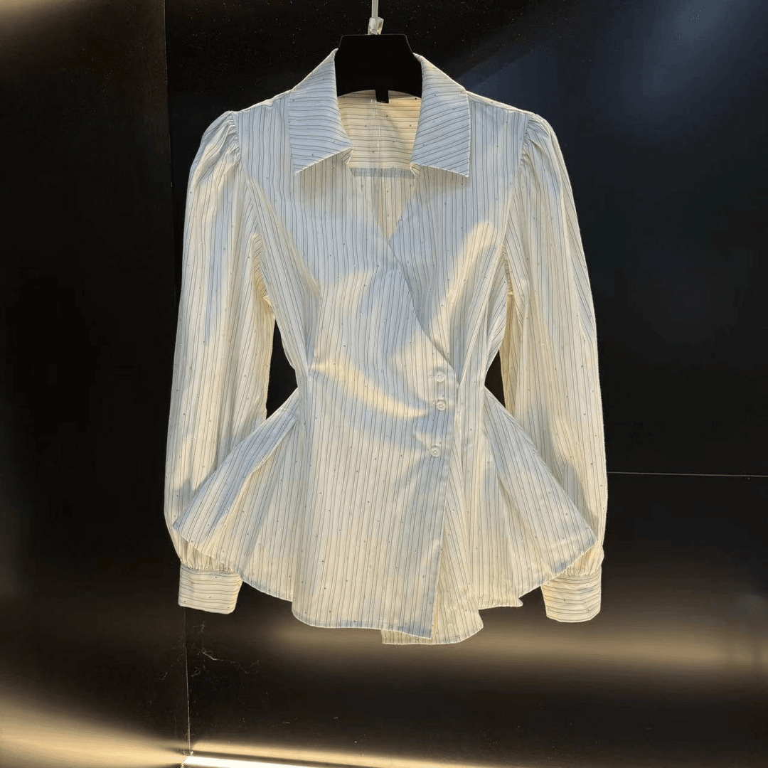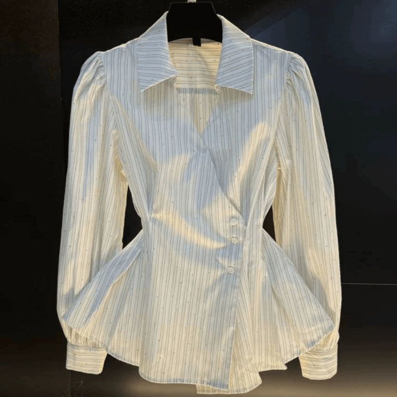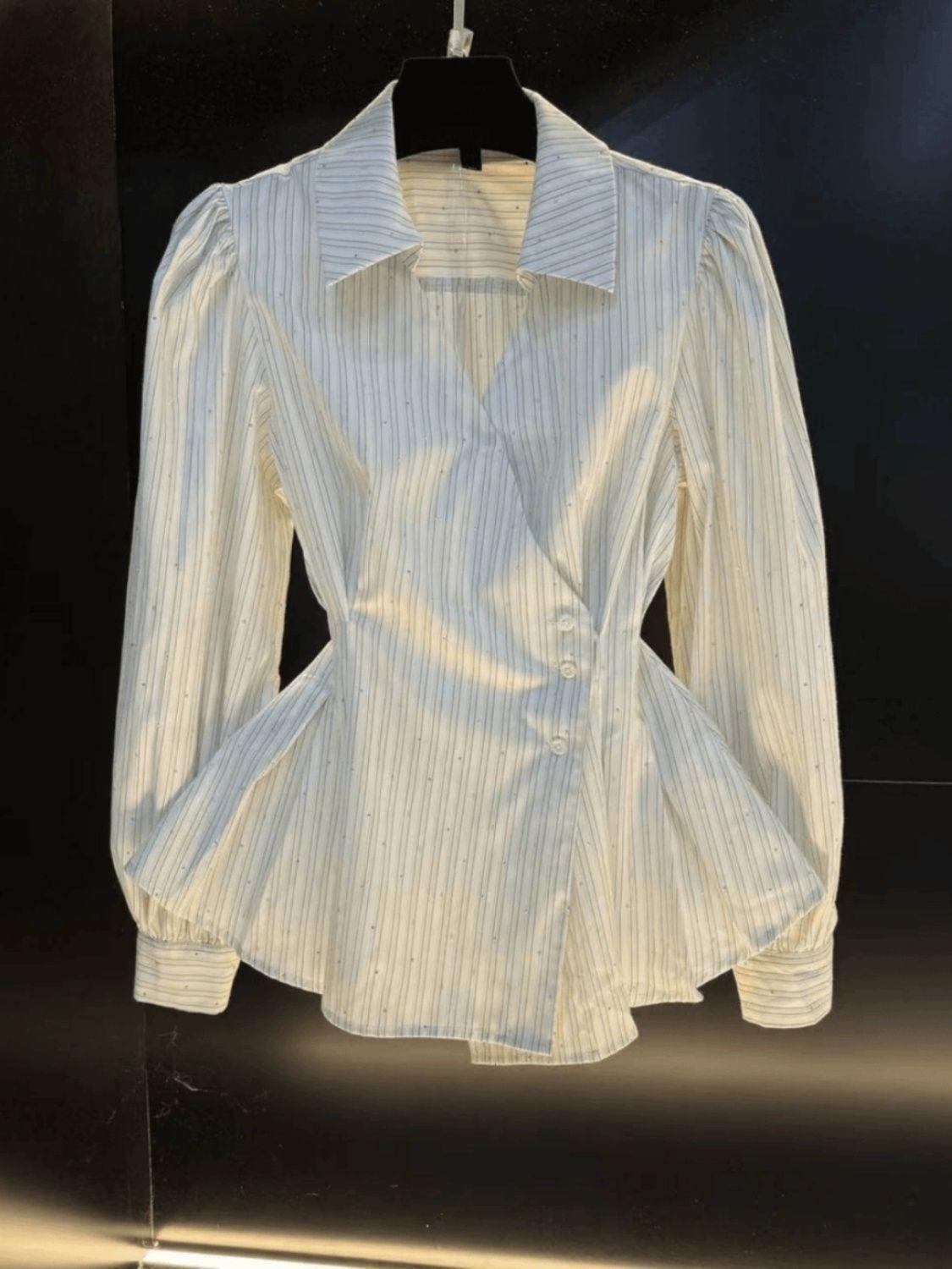 여성을위한 세련되고 독특한 허리 슬리밍 셔츠 봄 새로운 패션 디자인 감각 대비 색상 스트라이프 긴 소매