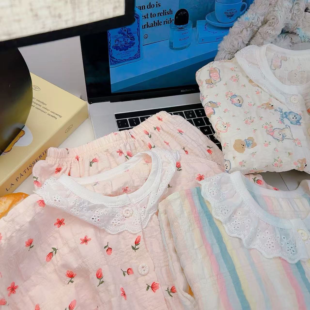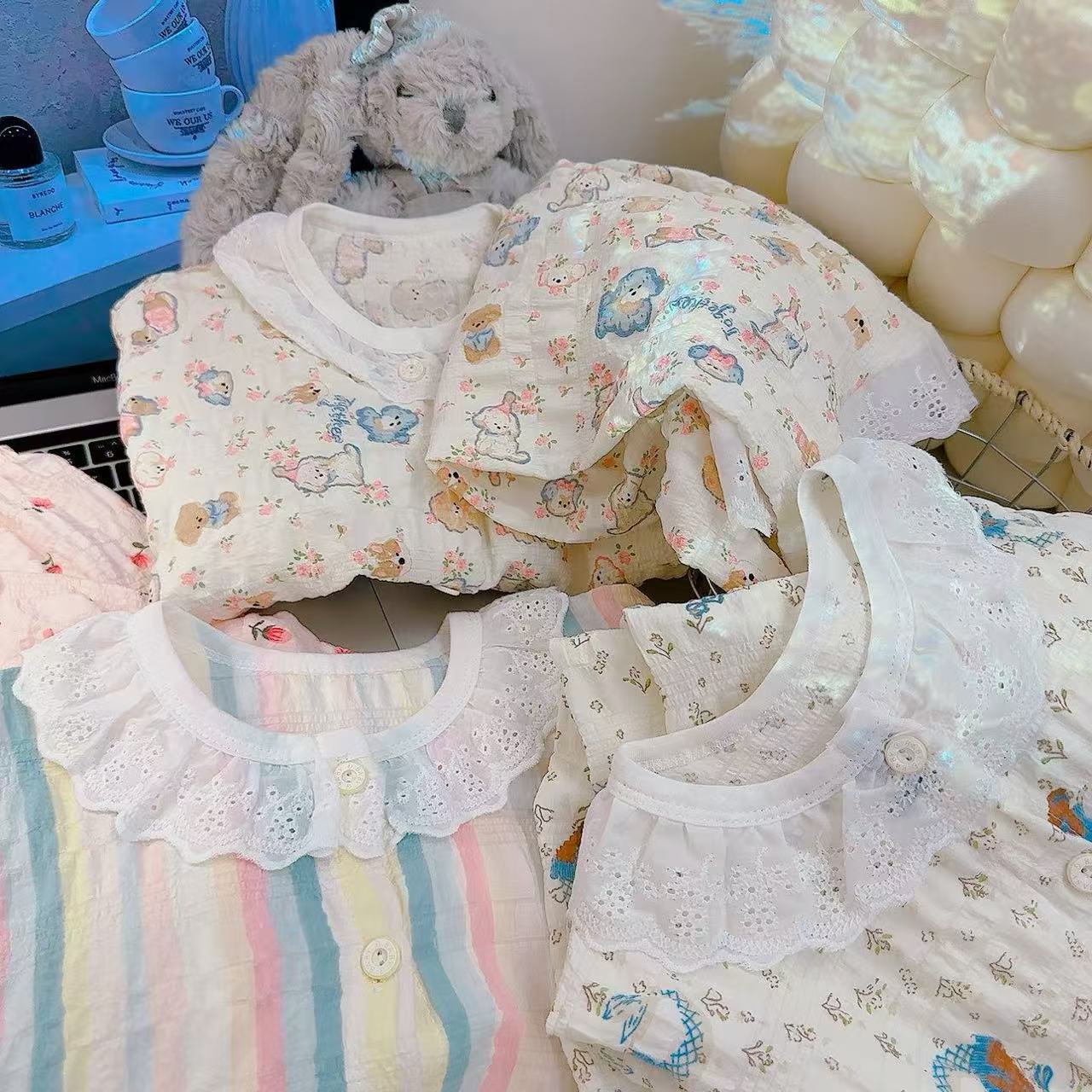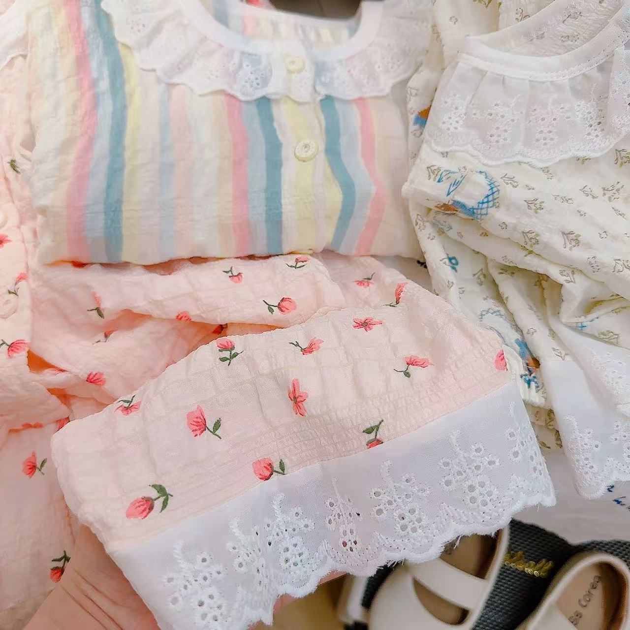 아동 잠옷 세트 봄 여름 소녀 레이스 면사 부모-자식 가정복 아기 에어컨 옷 카디건 아동복스토어 가기