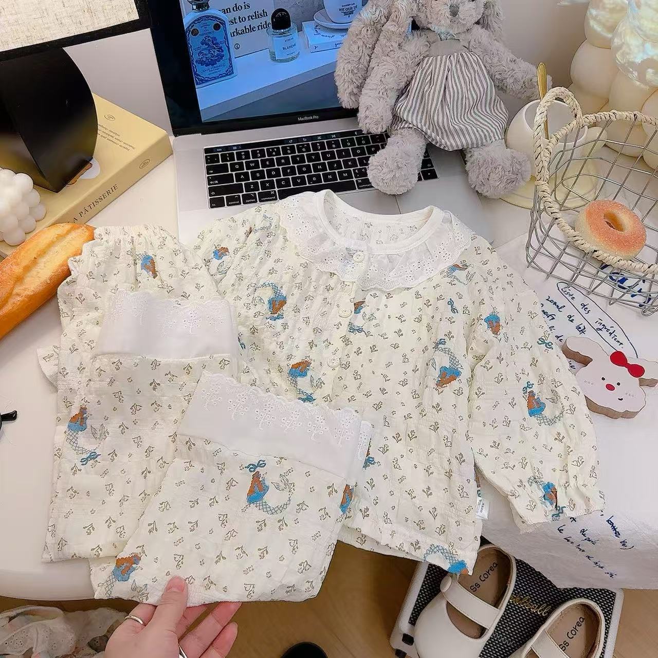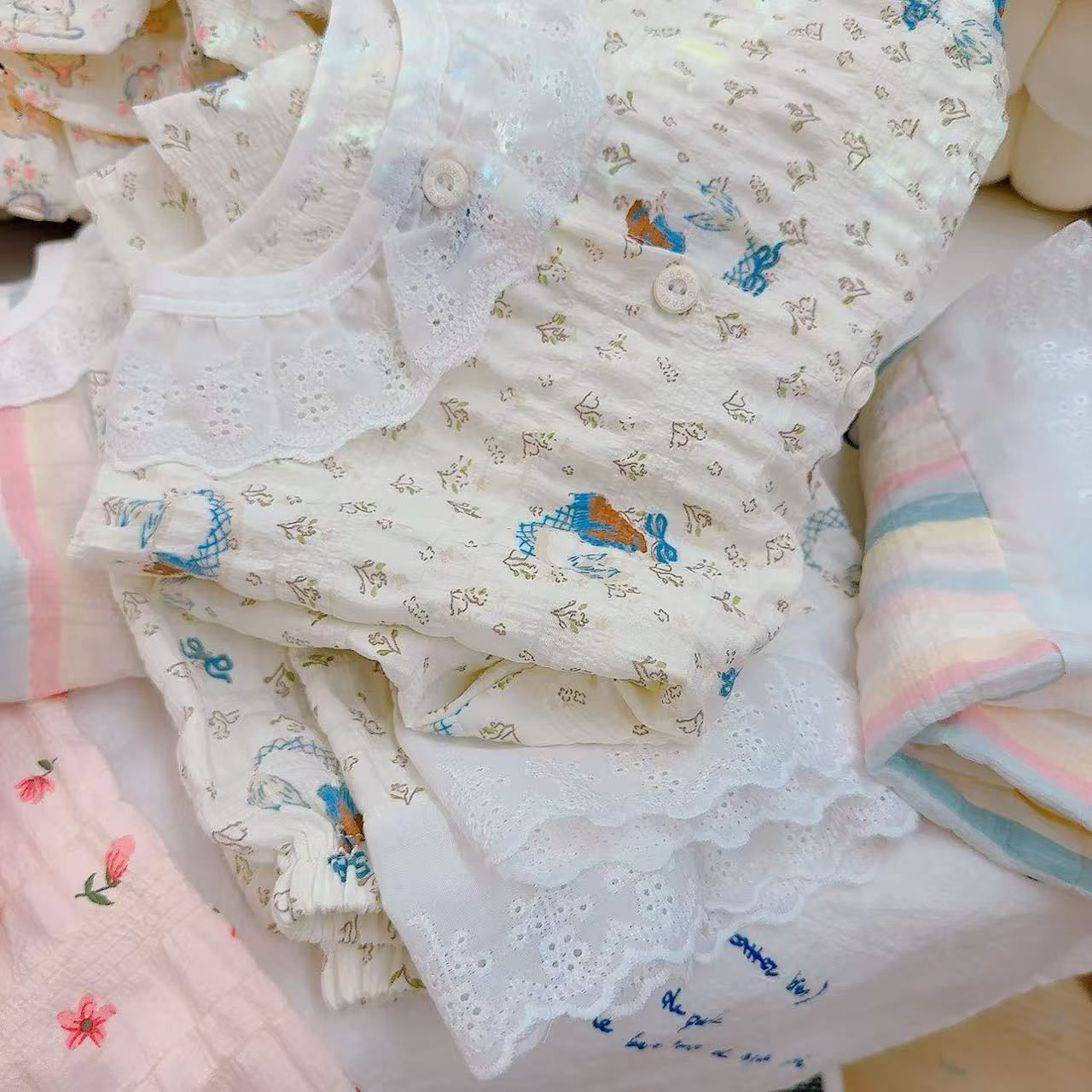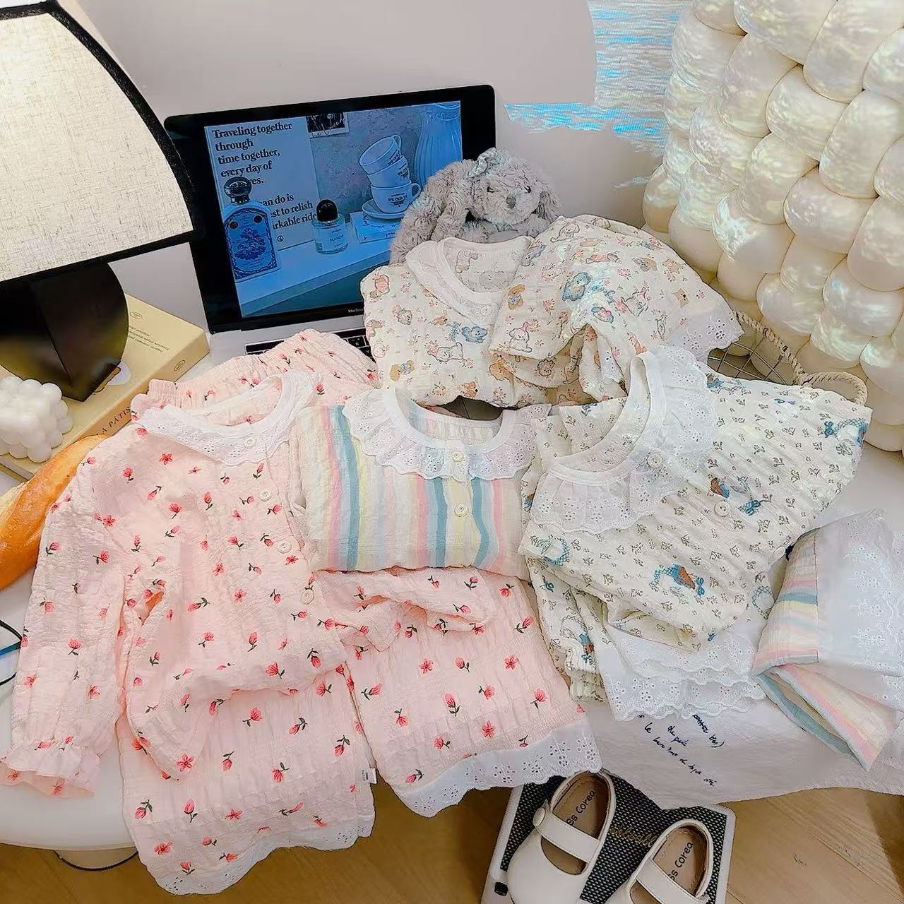 아동 잠옷 세트 봄 여름 소녀 레이스 면사 부모-자식 가정복 아기 에어컨 옷 카디건 아동복스토어 가기