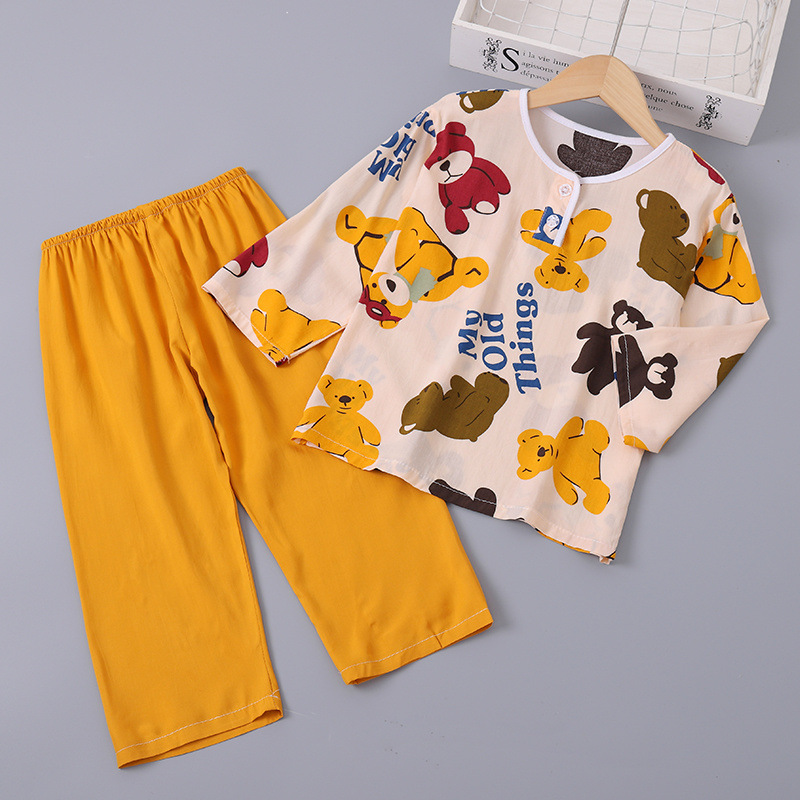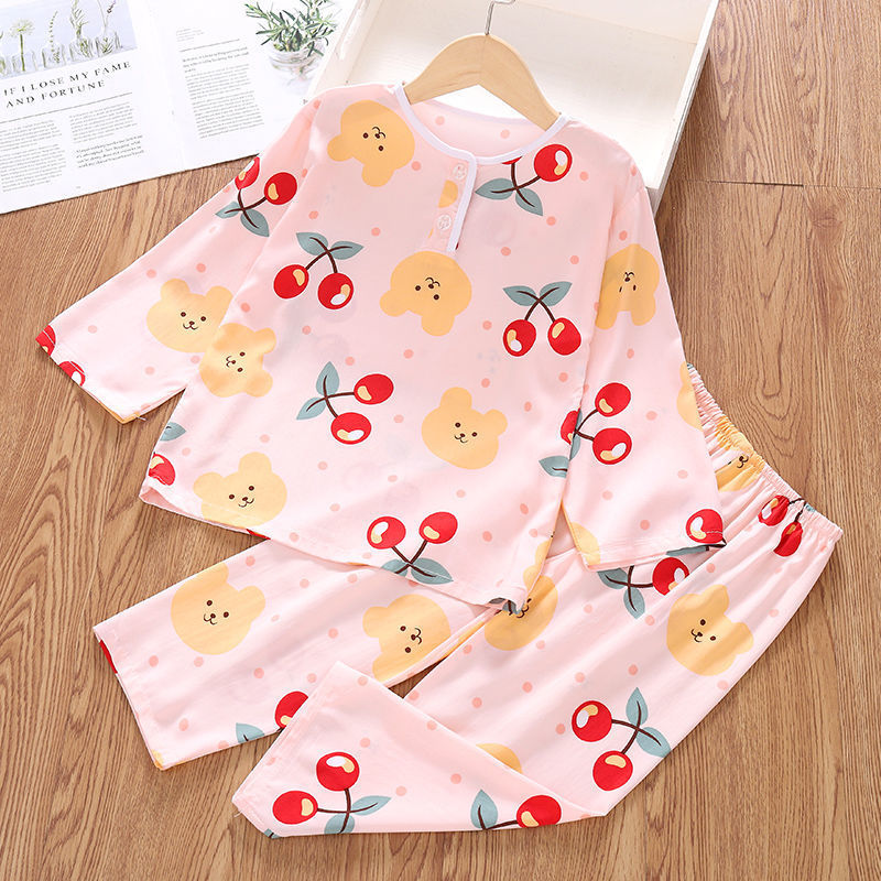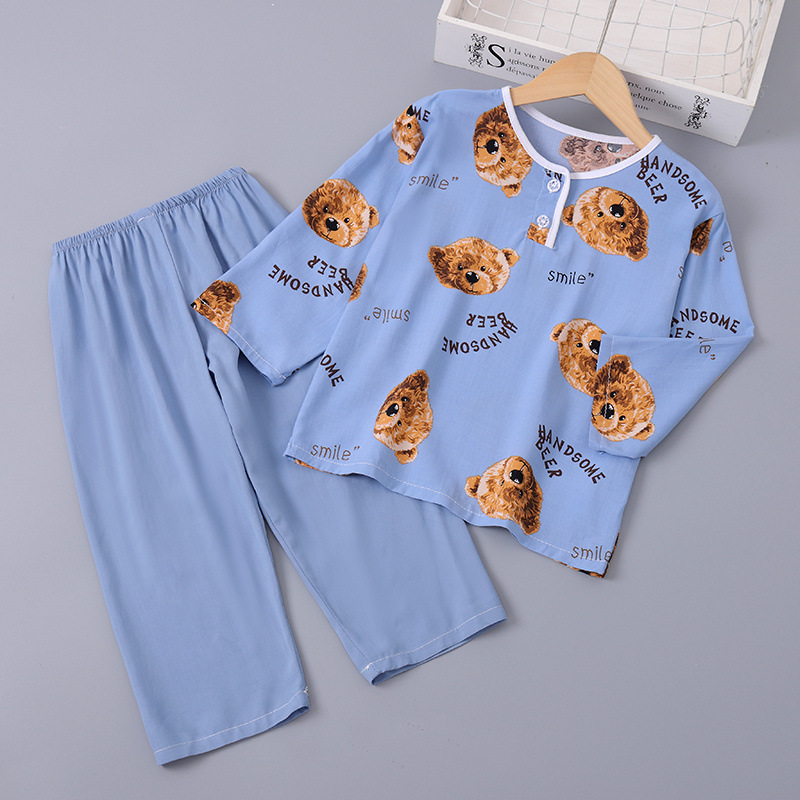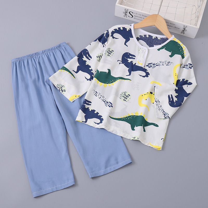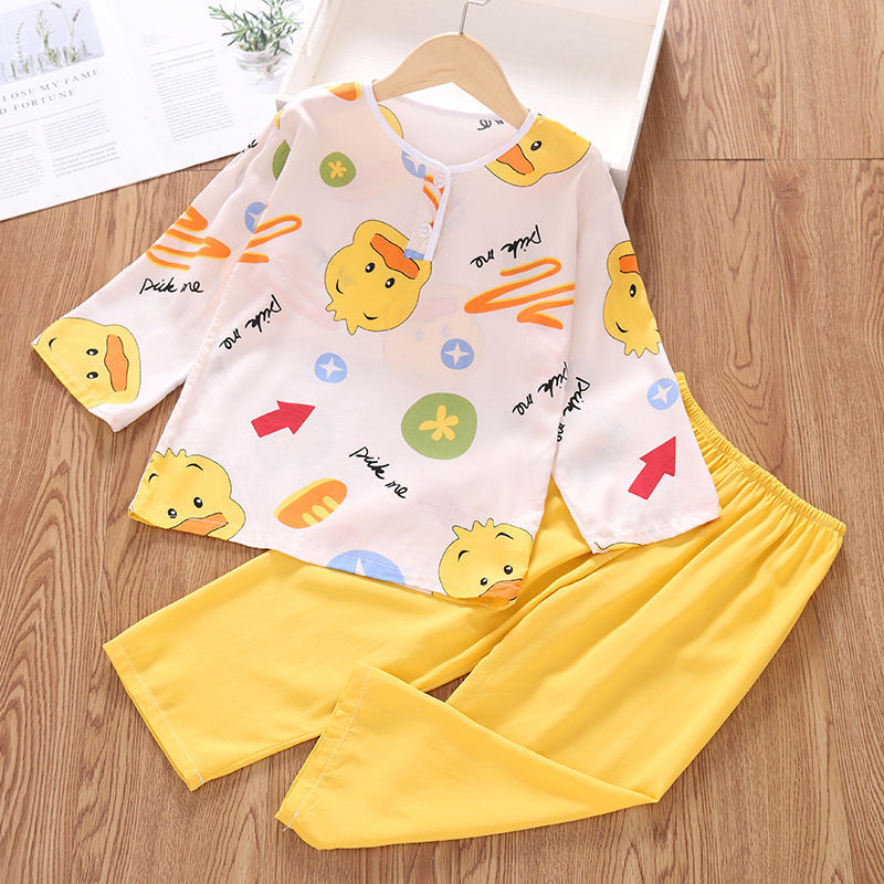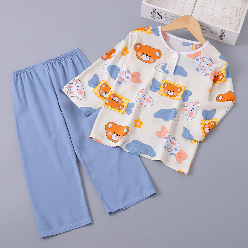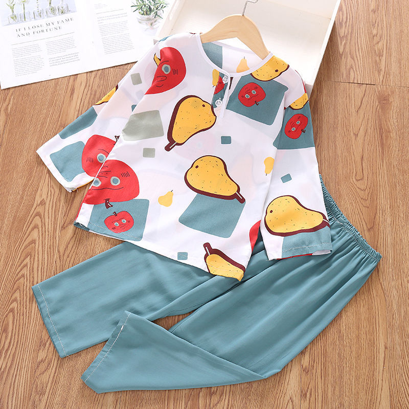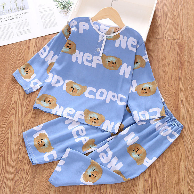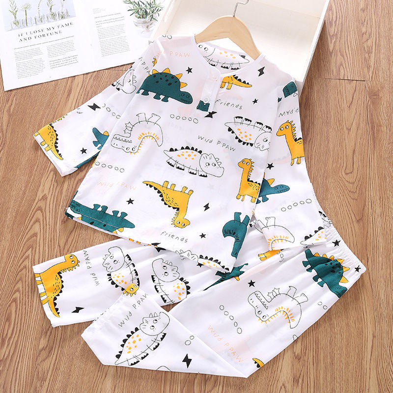 소년과 소녀를위한 여름 어린이 면화 실크 잠옷 아기 면화 실크 긴팔 여름 얇은 에어컨 옷 가정 의류 세트스토어 가기