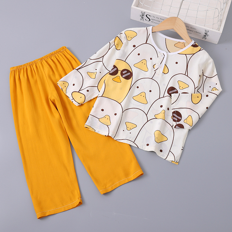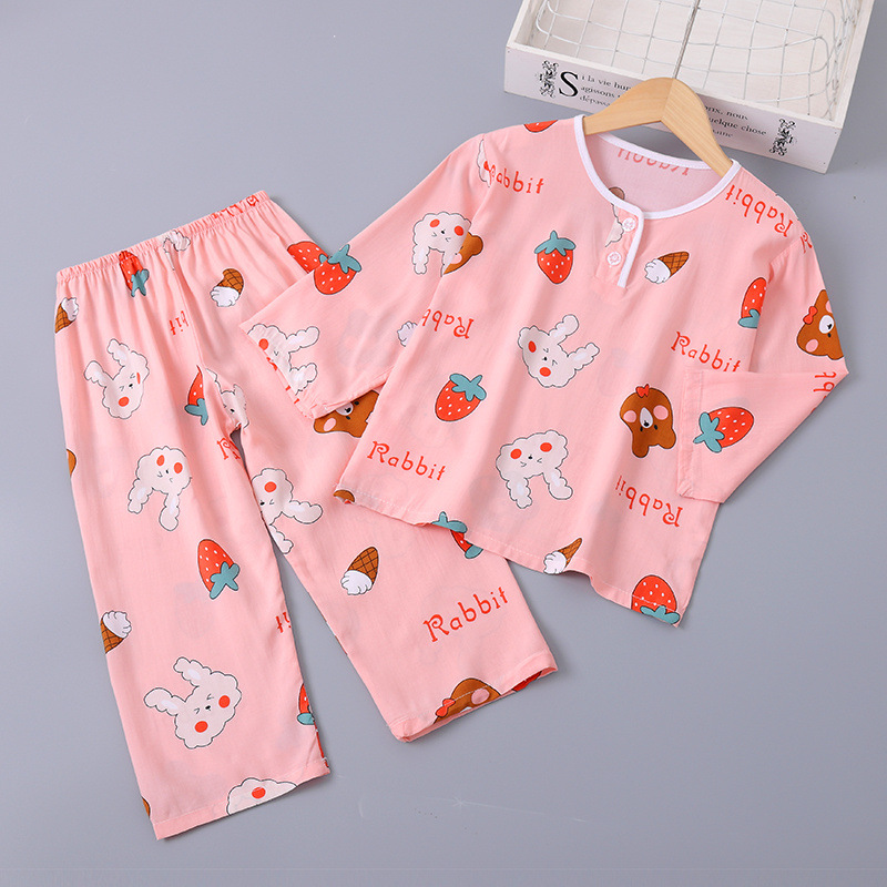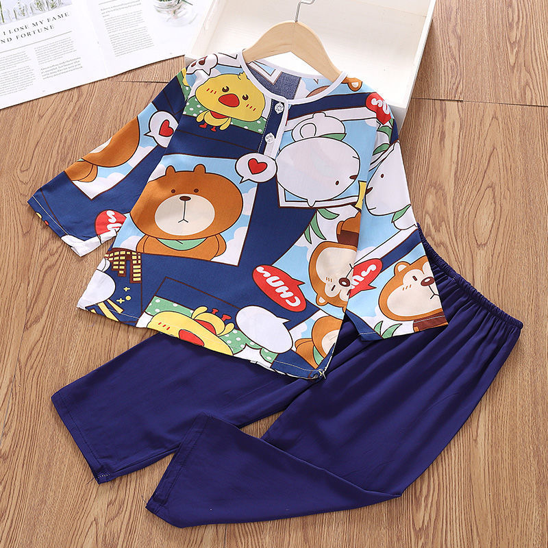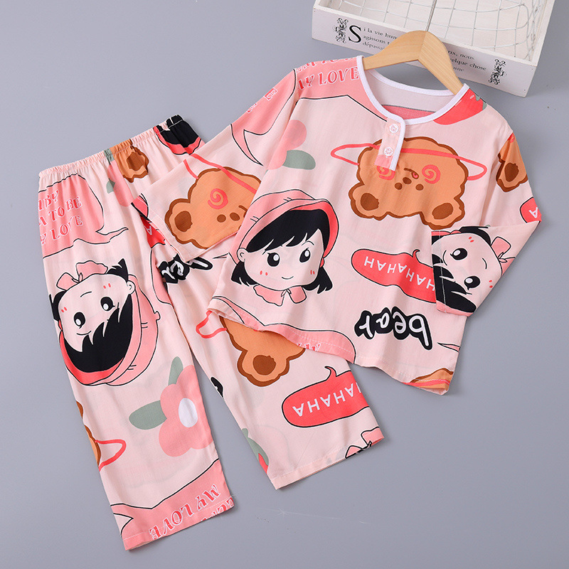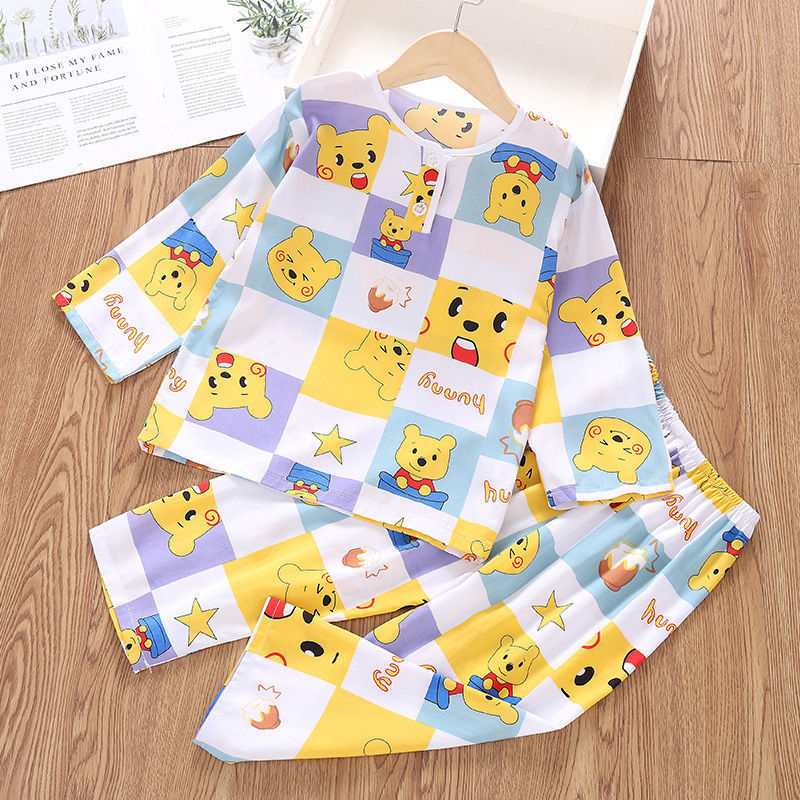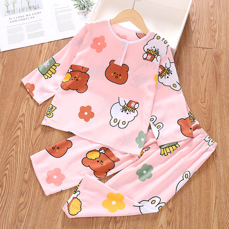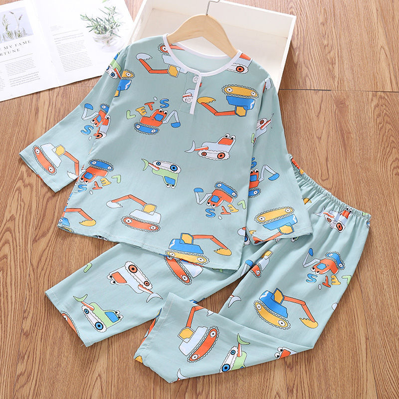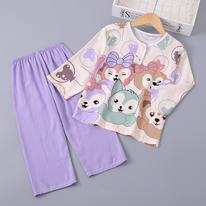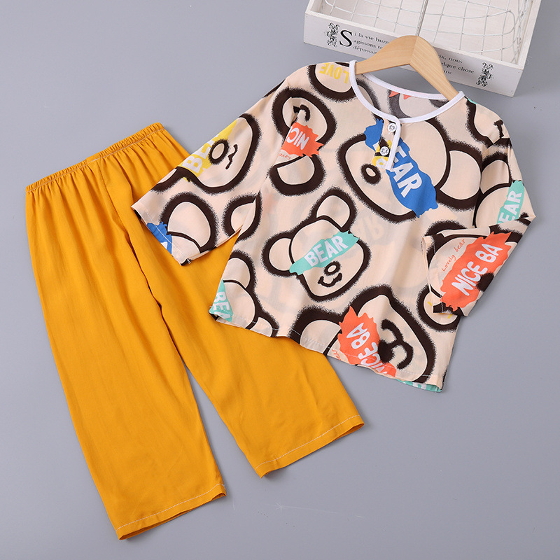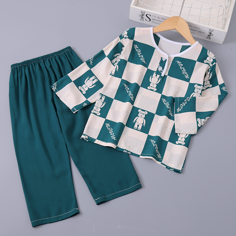소년과 소녀를위한 여름 어린이 면화 실크 잠옷 아기 면화 실크 긴팔 여름 얇은 에어컨 옷 가정 의류 세트스토어 가기