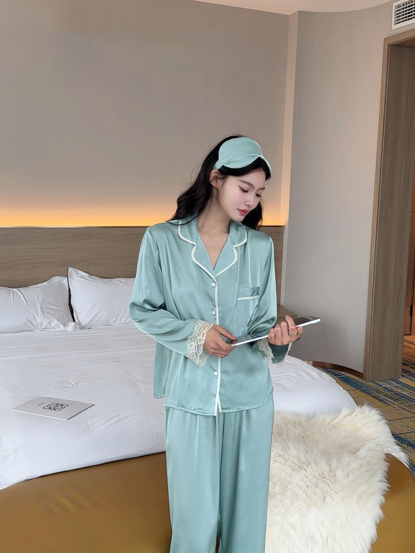 여성용 아이스 실크 잠옷 세트 여름 얇은 프렌치 레이스 홈웨어 안대 포함 즉시 배송