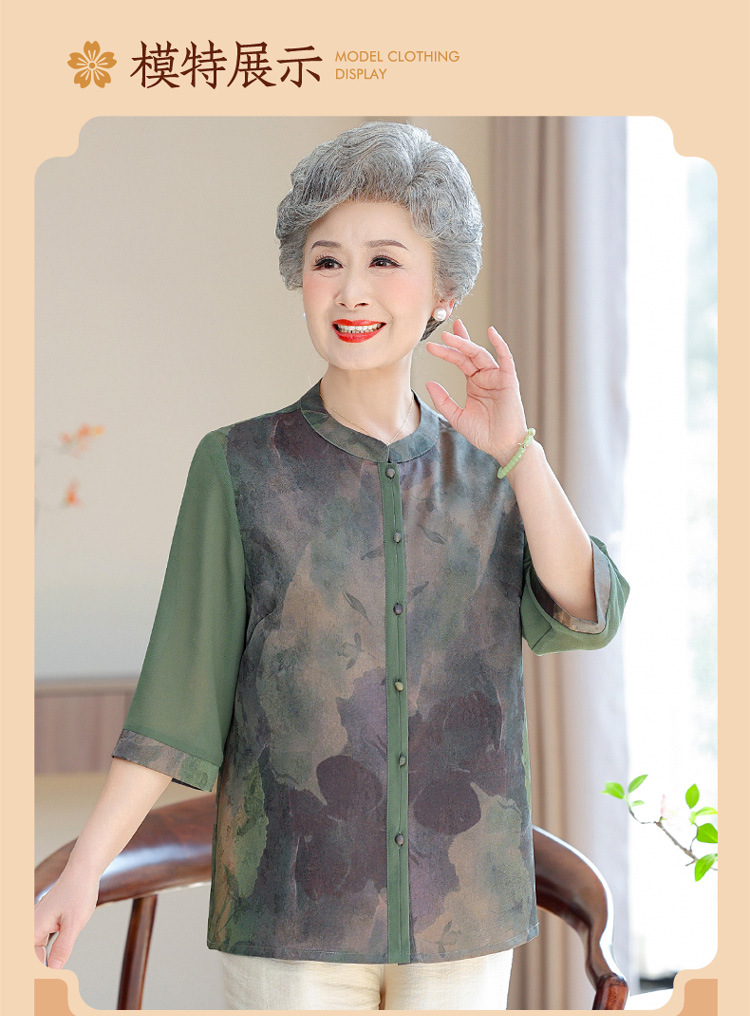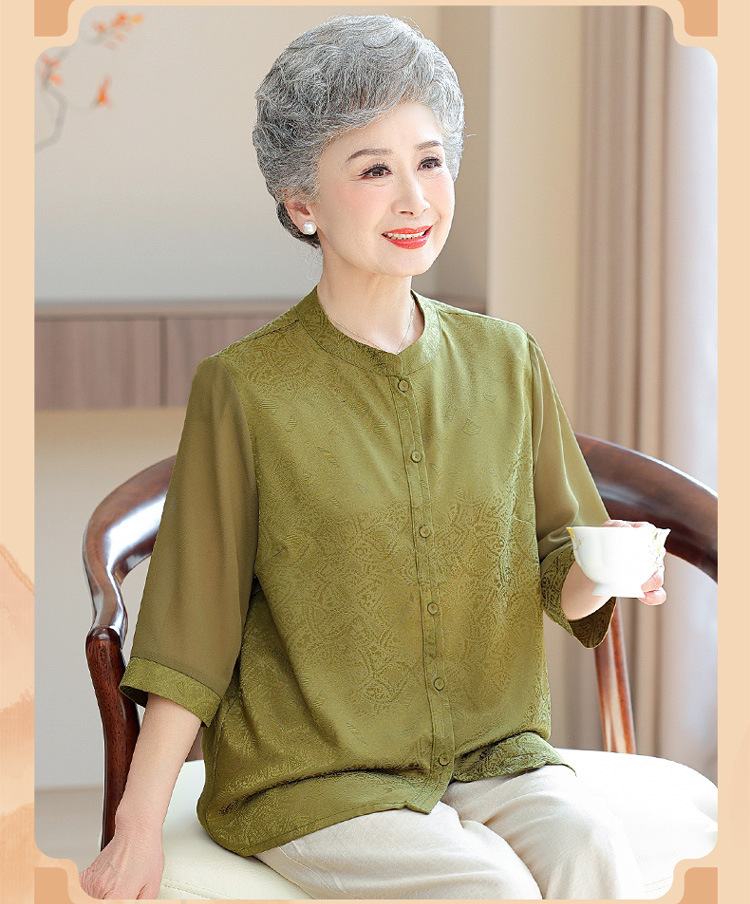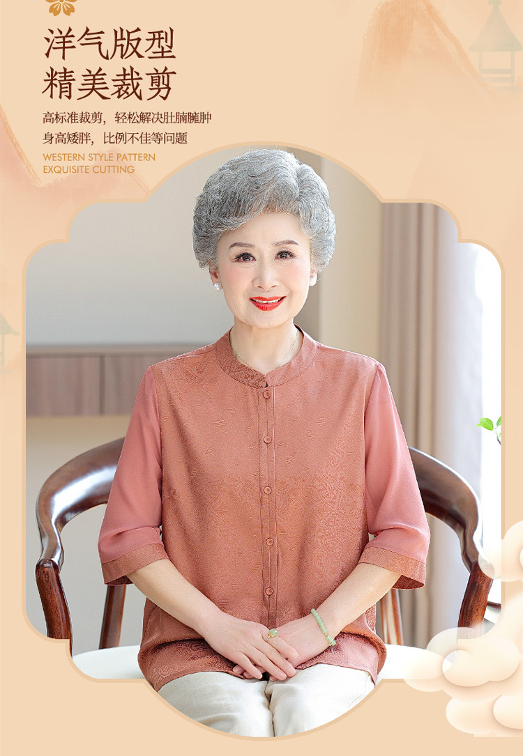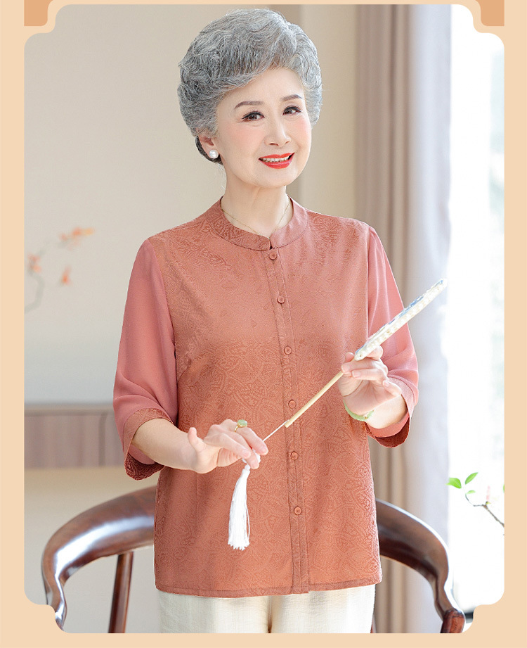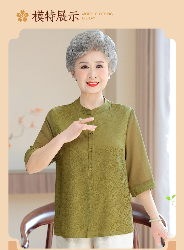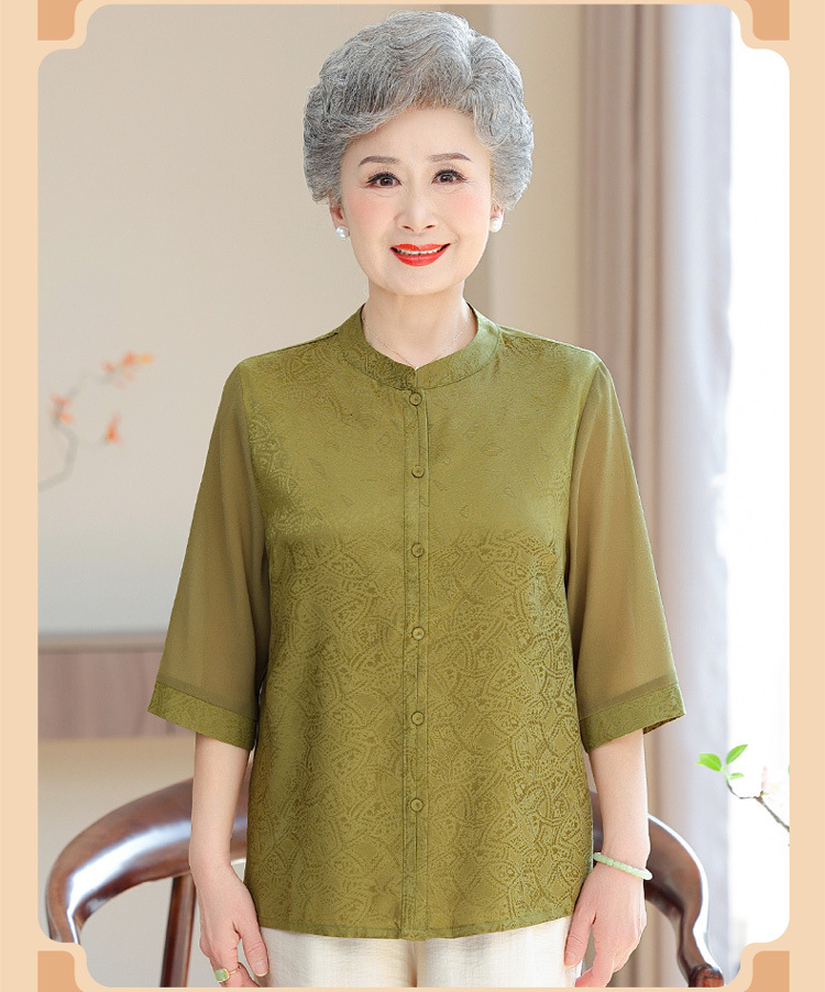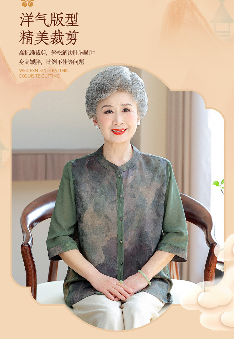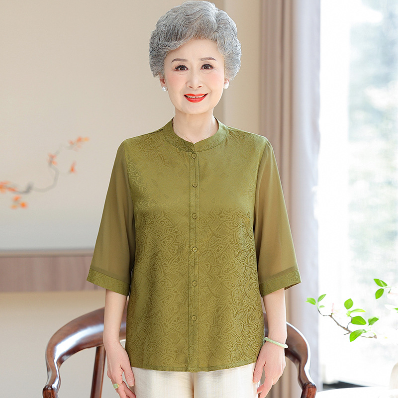 새로운 Guofeng 중년 및 노인 할머니의 7 점 소매 셔츠 카디건 봄과 여름 어머니의 여성 실크 셔츠 루즈 탑