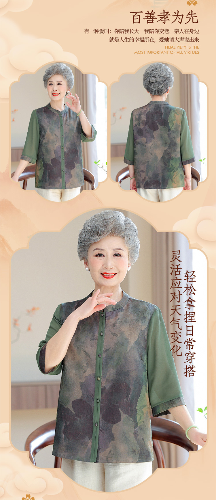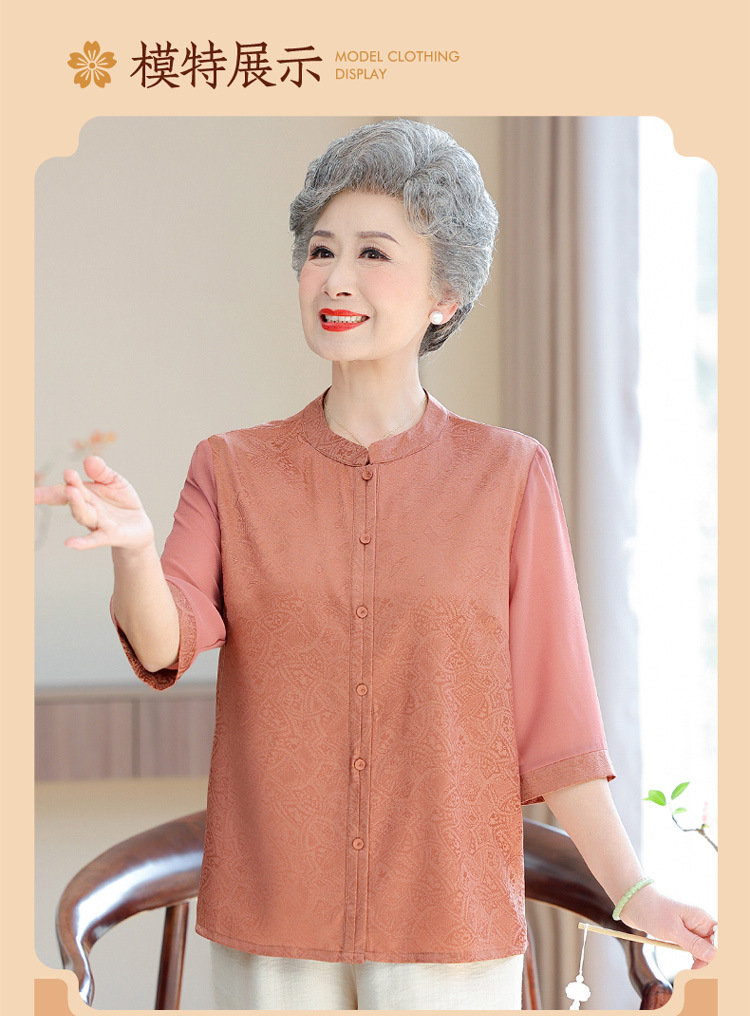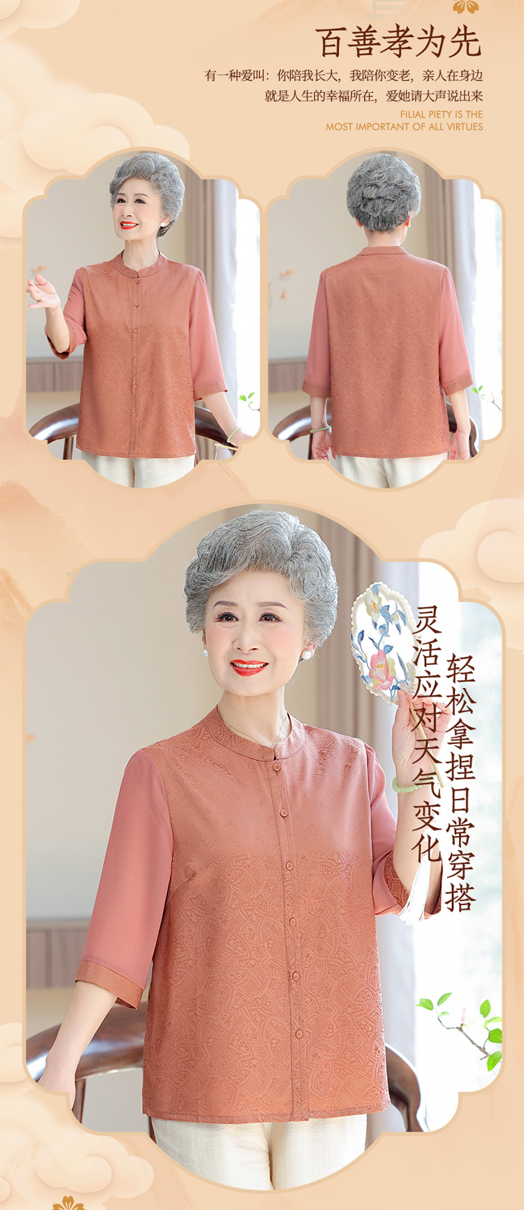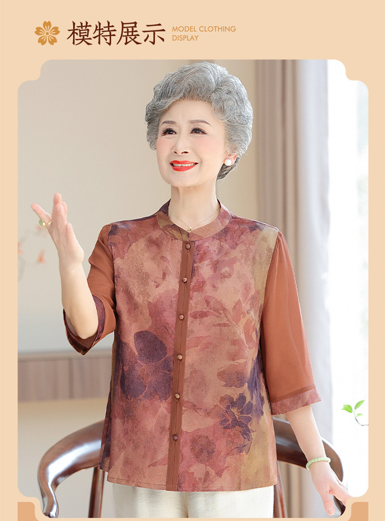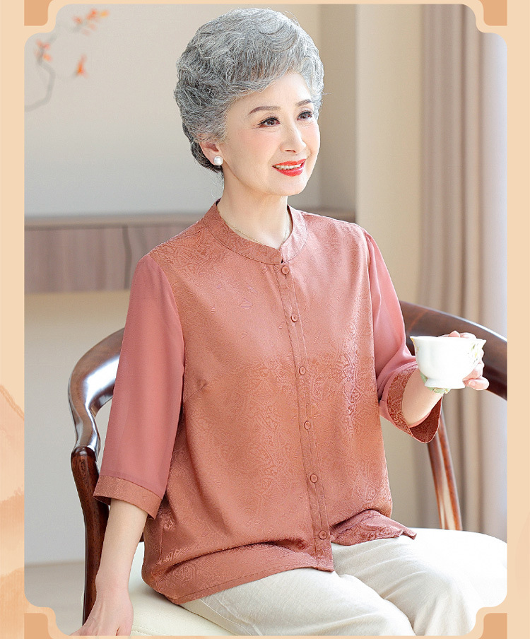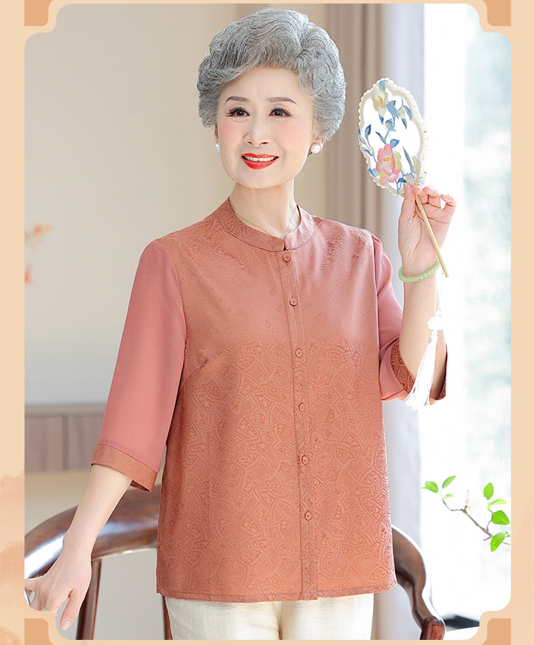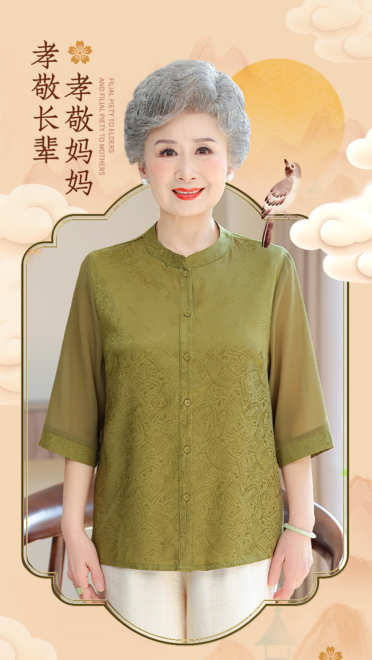 새로운 Guofeng 중년 및 노인 할머니의 7 점 소매 셔츠 카디건 봄과 여름 어머니의 여성 실크 셔츠 루즈 탑