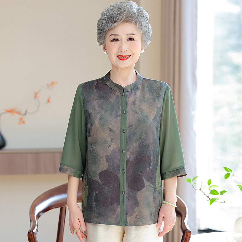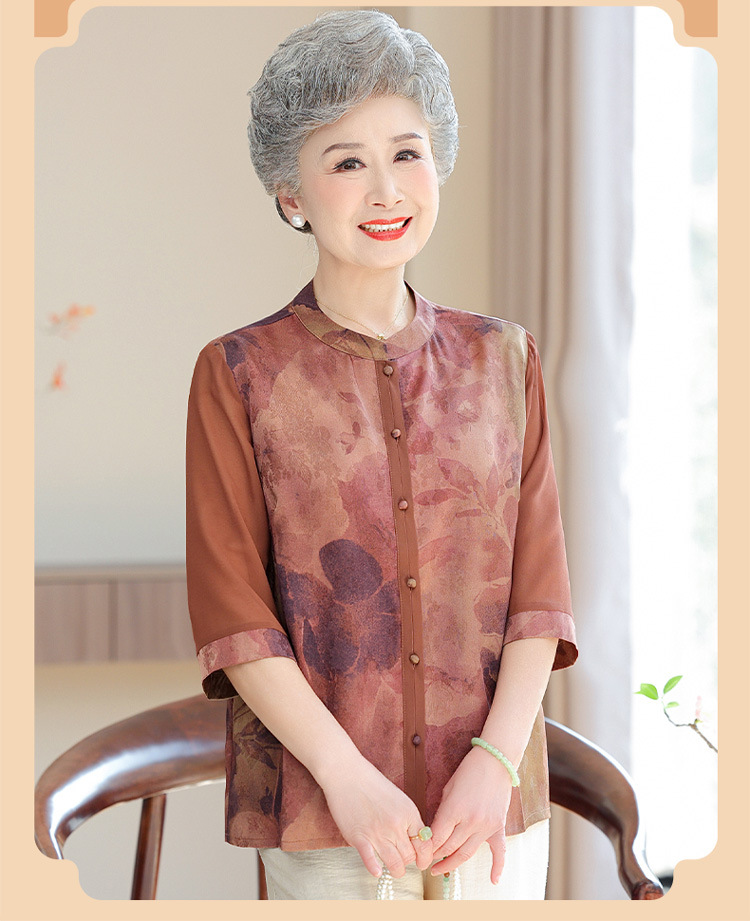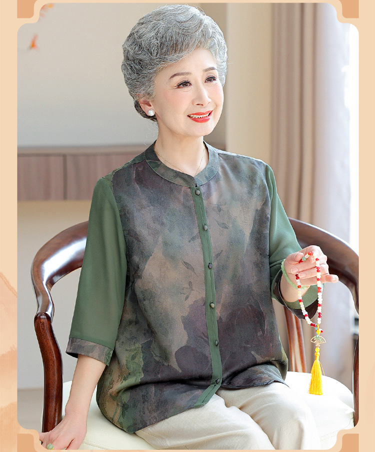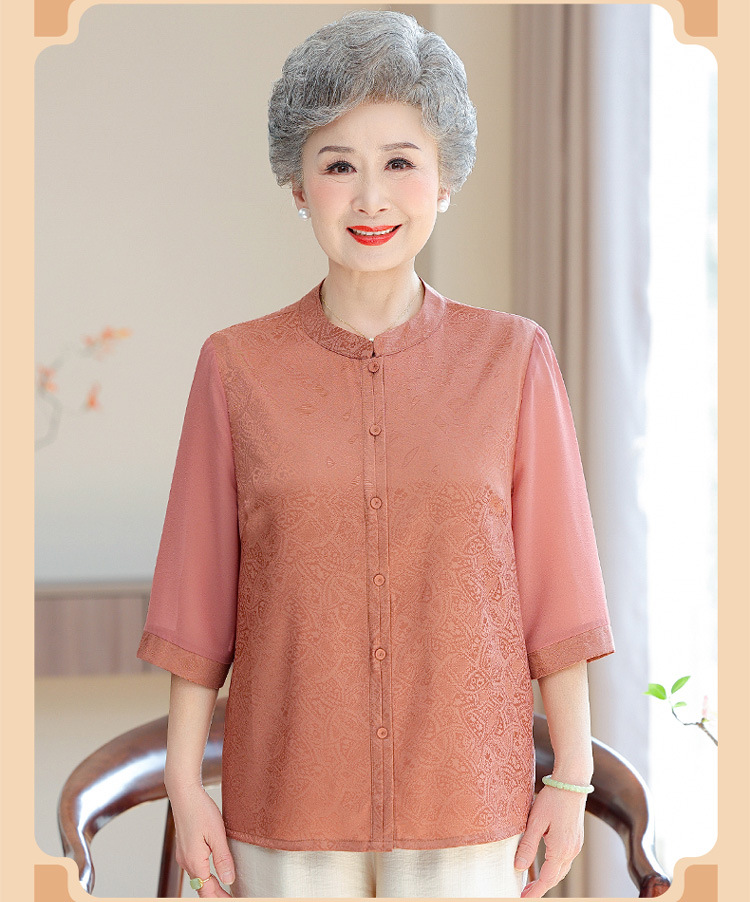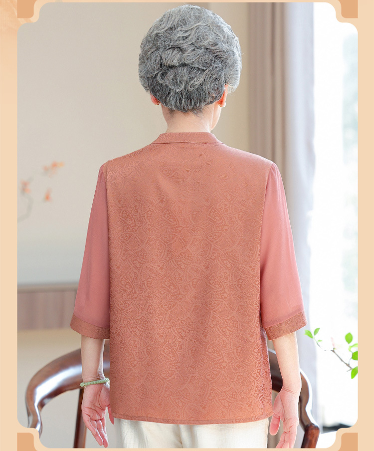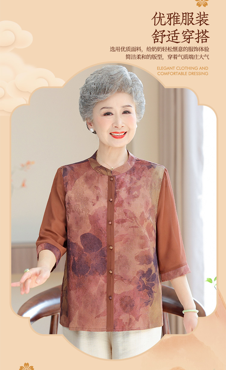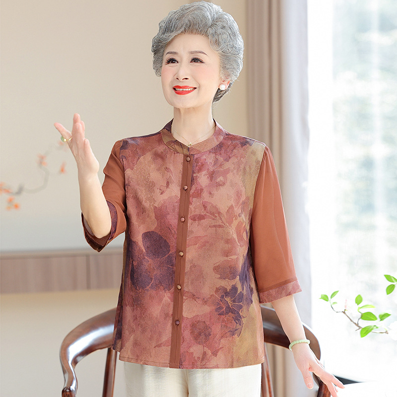 새로운 Guofeng 중년 및 노인 할머니의 7 점 소매 셔츠 카디건 봄과 여름 어머니의 여성 실크 셔츠 루즈 탑