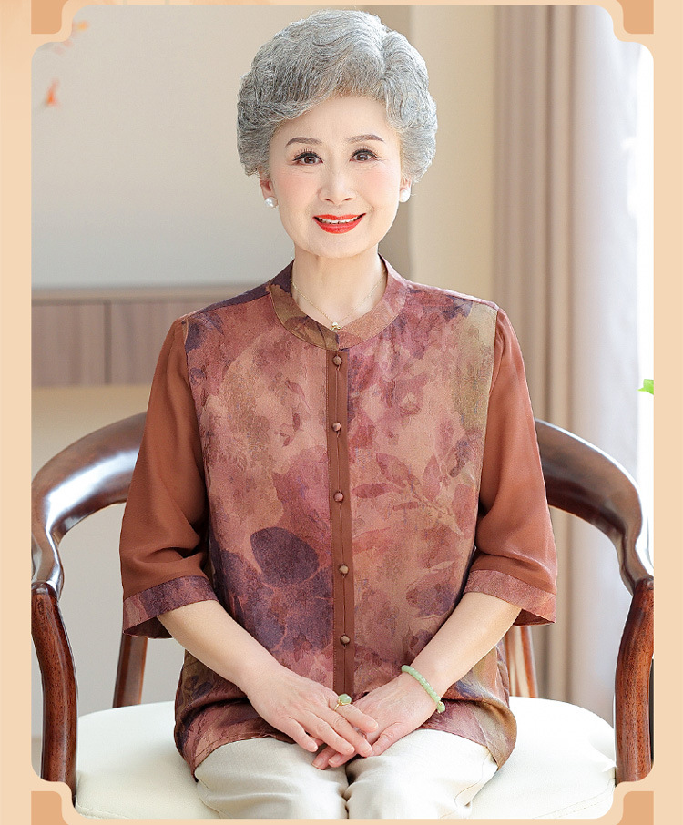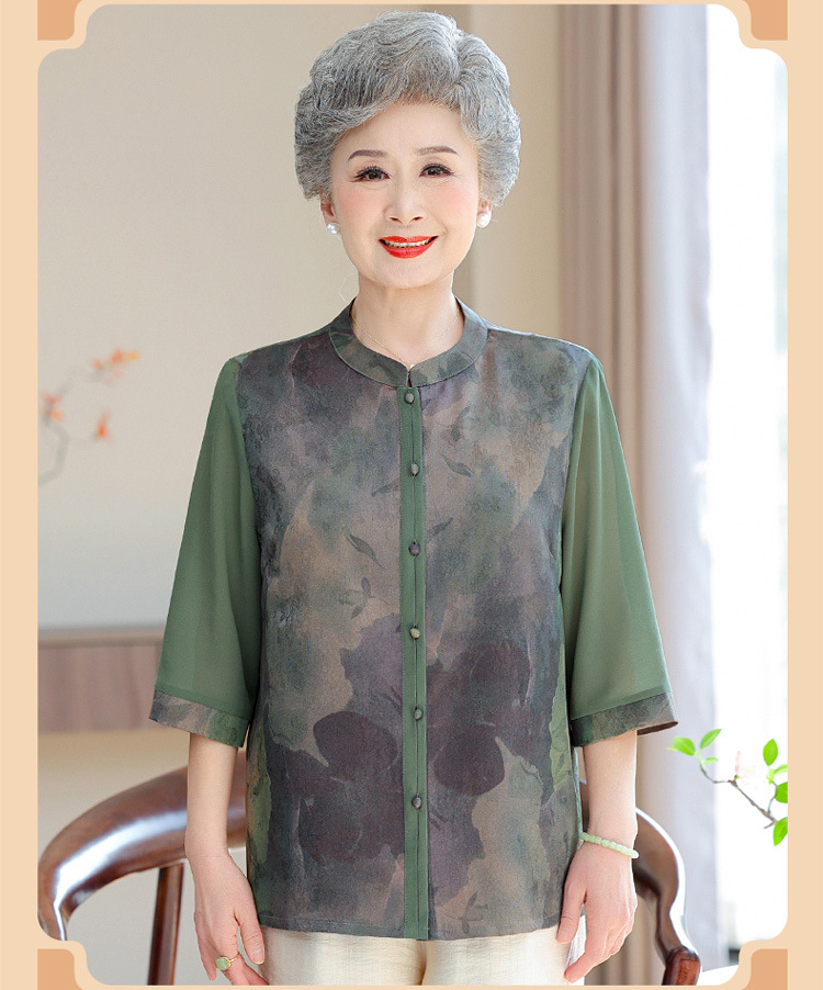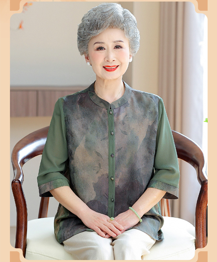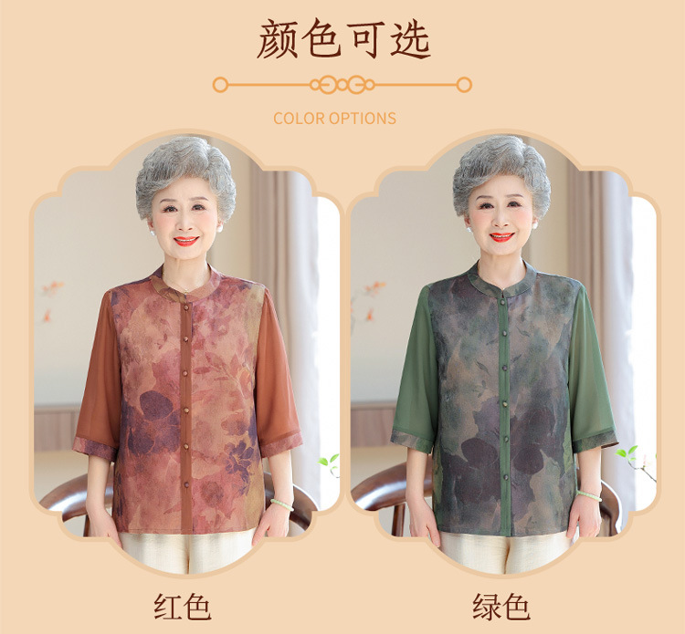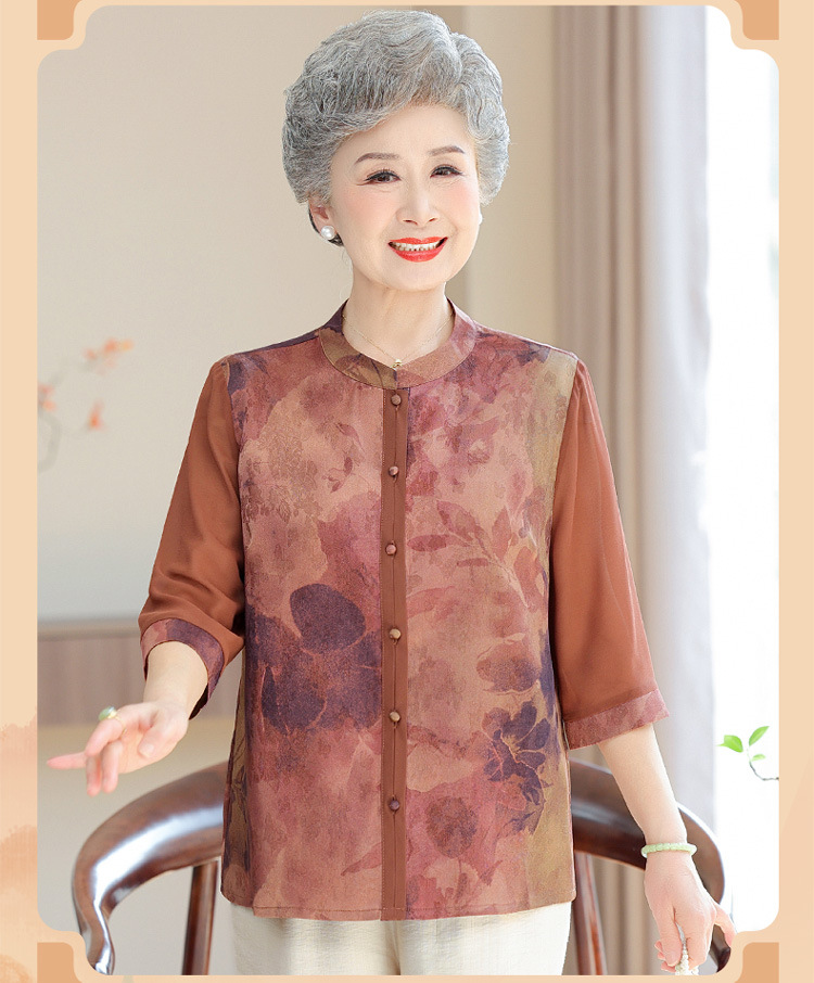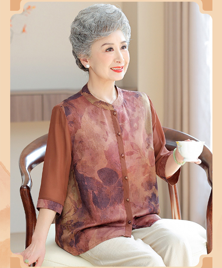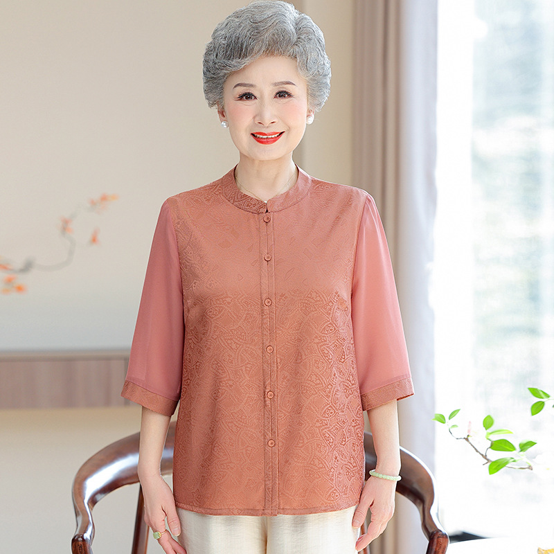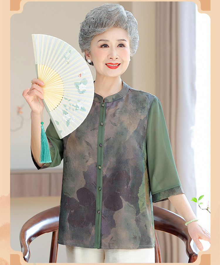 새로운 Guofeng 중년 및 노인 할머니의 7 점 소매 셔츠 카디건 봄과 여름 어머니의 여성 실크 셔츠 루즈 탑