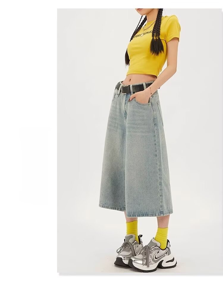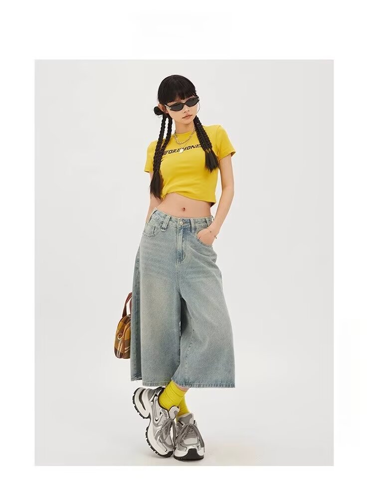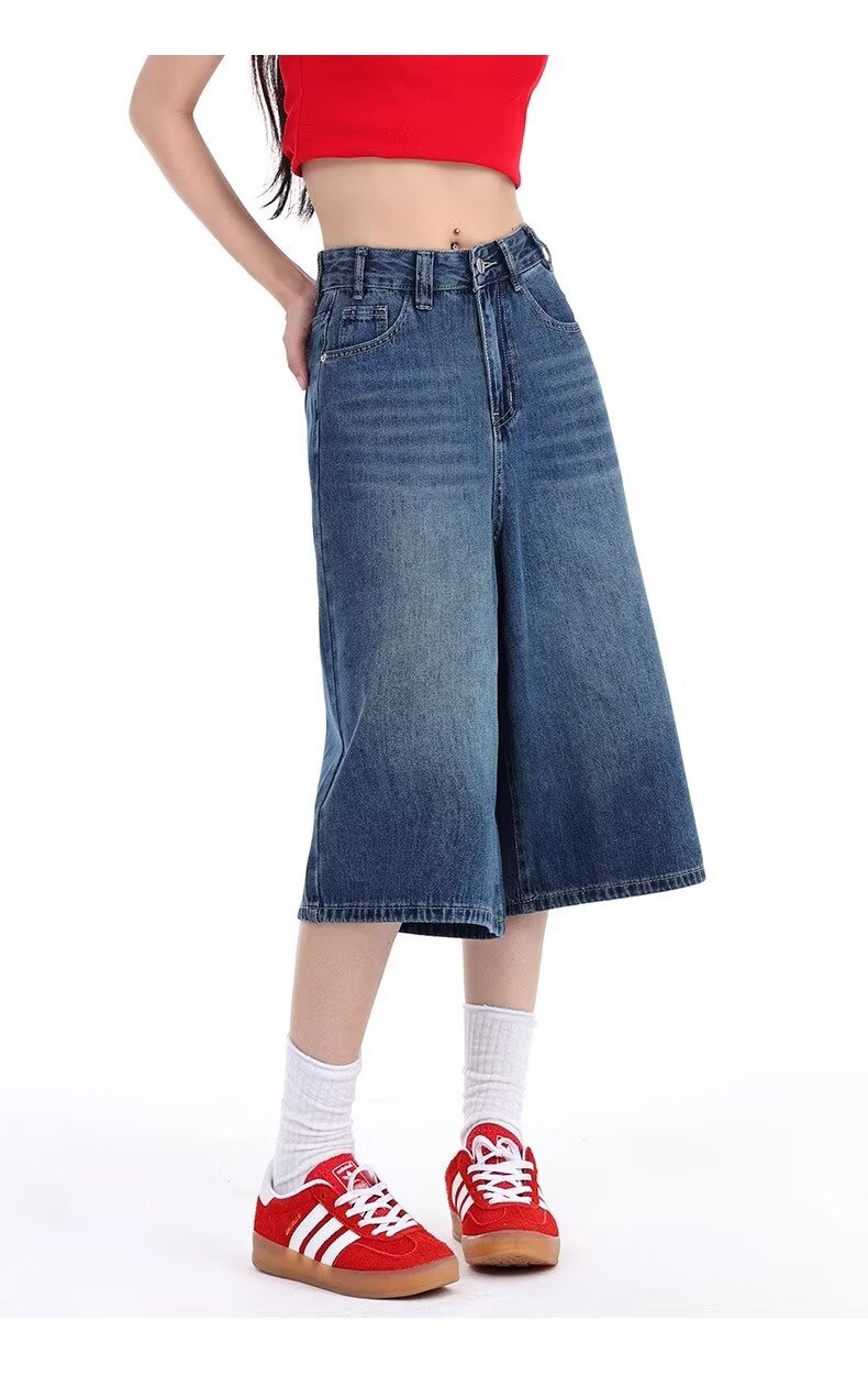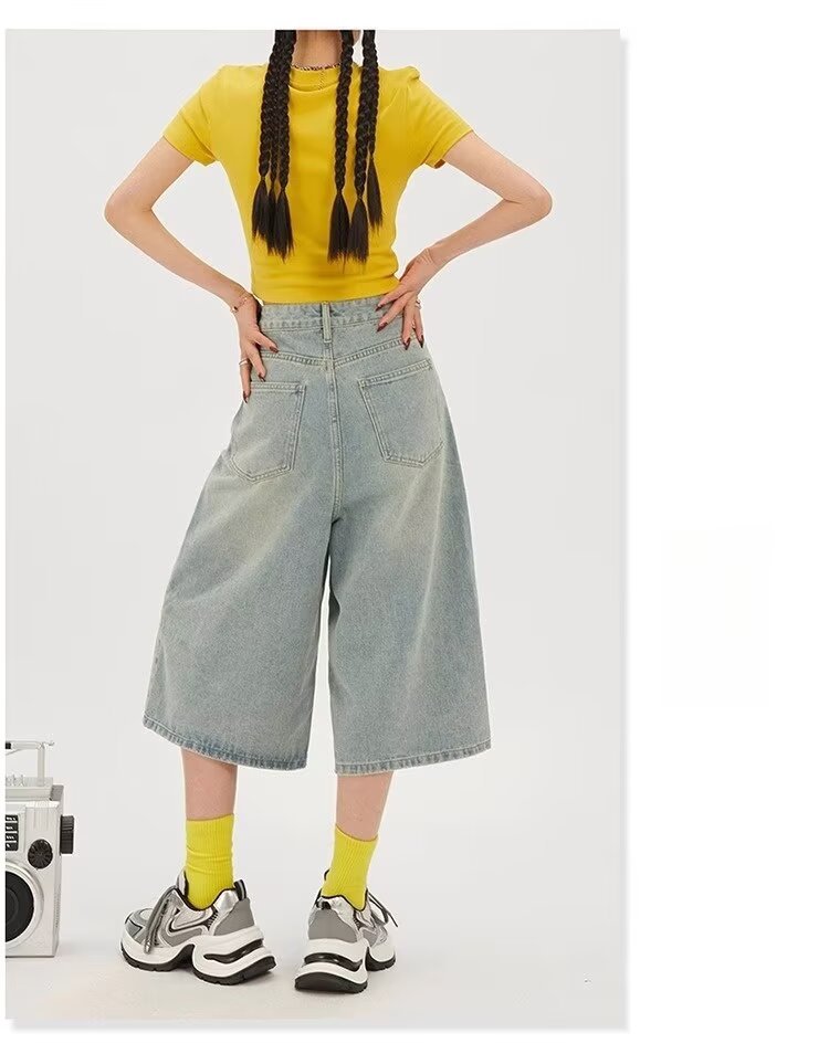 아메리칸 스타일 레트로 느슨한 넓은 다리 데님 자른 바지 여자 시즌 2025 여름 새로운 높은 허리 슬리밍 스트레이트 바지