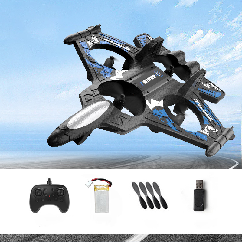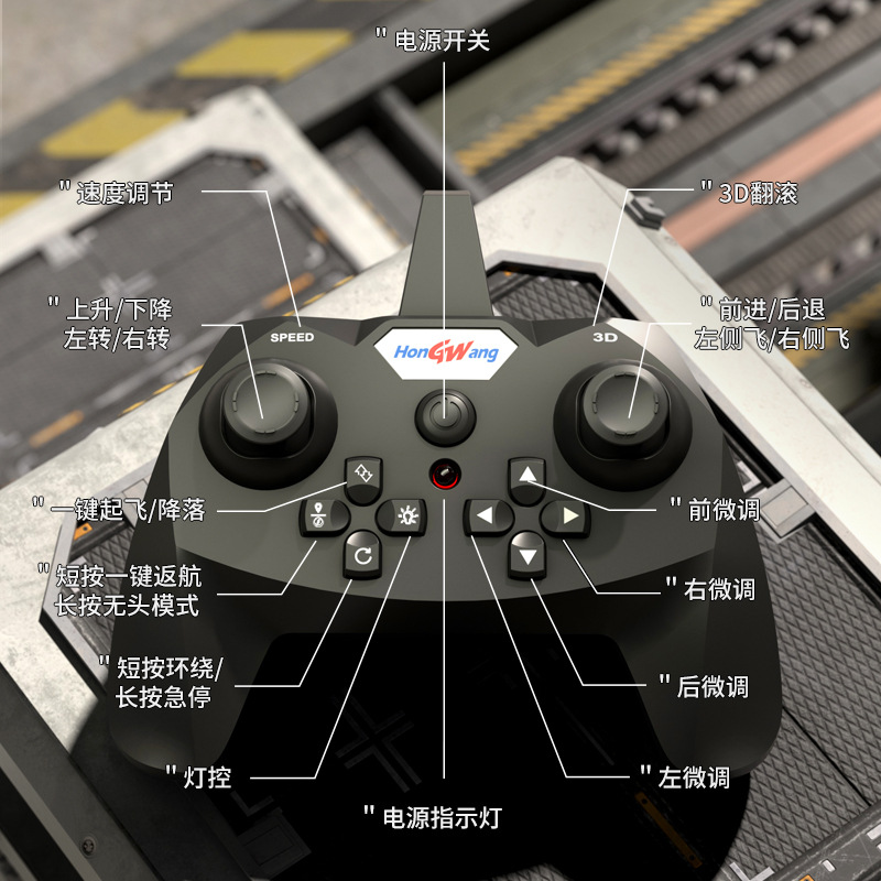 一键360°特技翻滚/定点环绕飞行“落叶飘”/ 气压定高/ 一键起飞/降落/上升/下降/左转/右转/前进/后退/一键返航/无头模式/急停功能/三挡速度调节。
