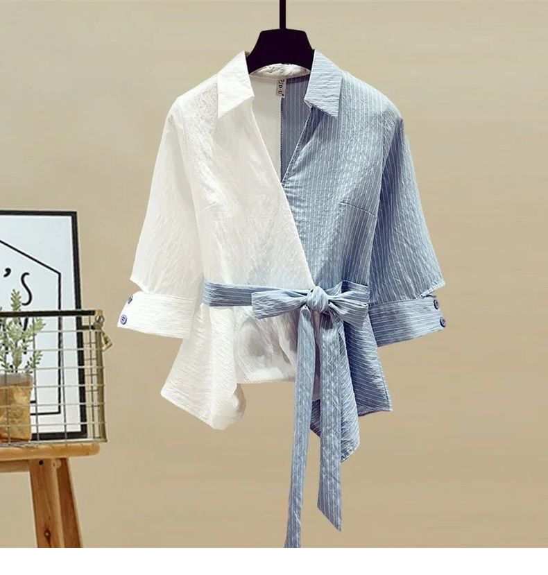 [1513 컬렉션] 플러스 사이즈 여자 100.00kg 뚱뚱한 언니 여름 세트 여성 줄무늬 바느질 셔츠 높은 허리스토어 가기