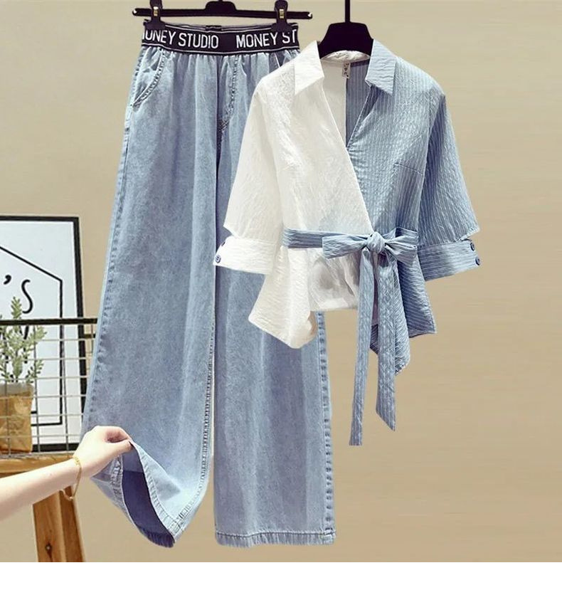 [1513 컬렉션] 플러스 사이즈 여자 100.00kg 뚱뚱한 언니 여름 세트 여성 줄무늬 바느질 셔츠 높은 허리