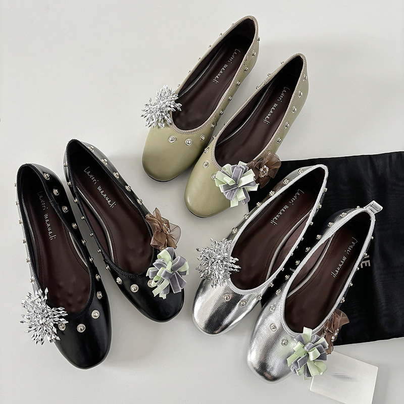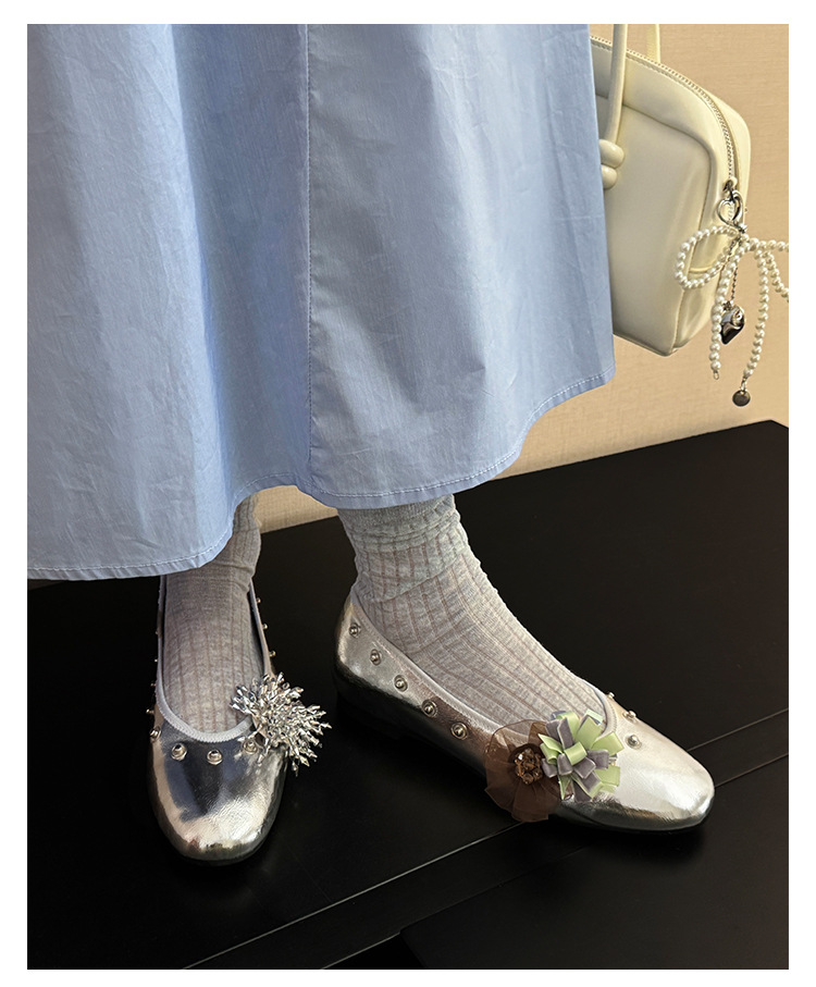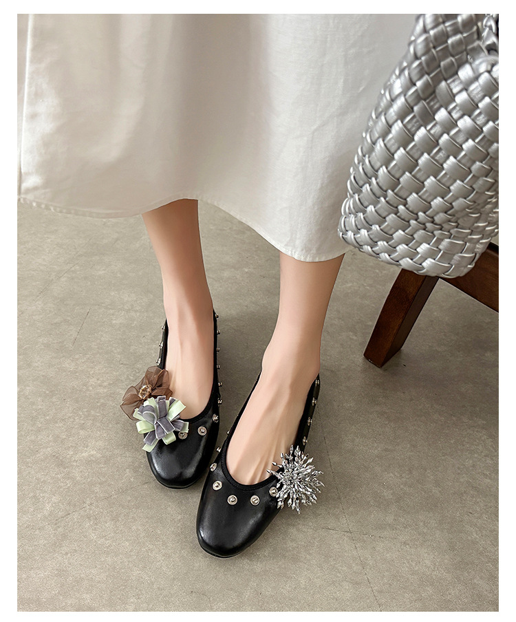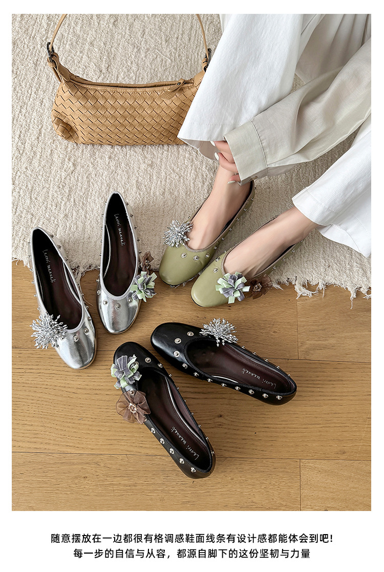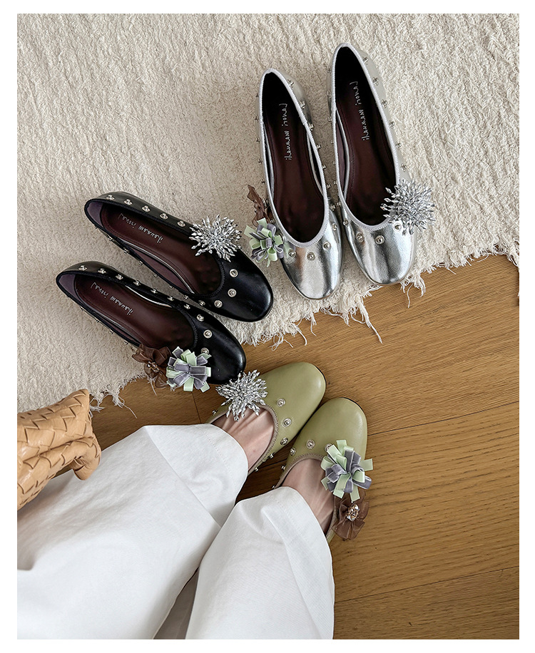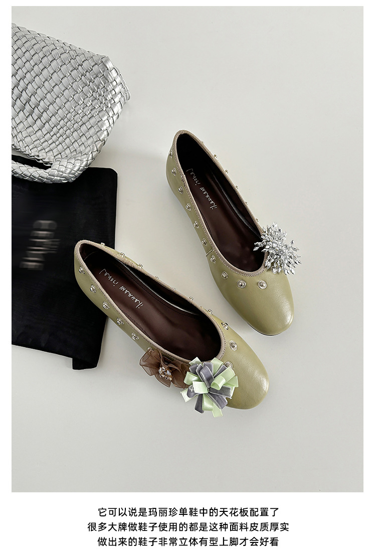 틈새 디자인 꽃 라인석 메리 제인 신발 요정 스타일 플랫 하단 라운드 머리 슬립 온 발레 신발 여성