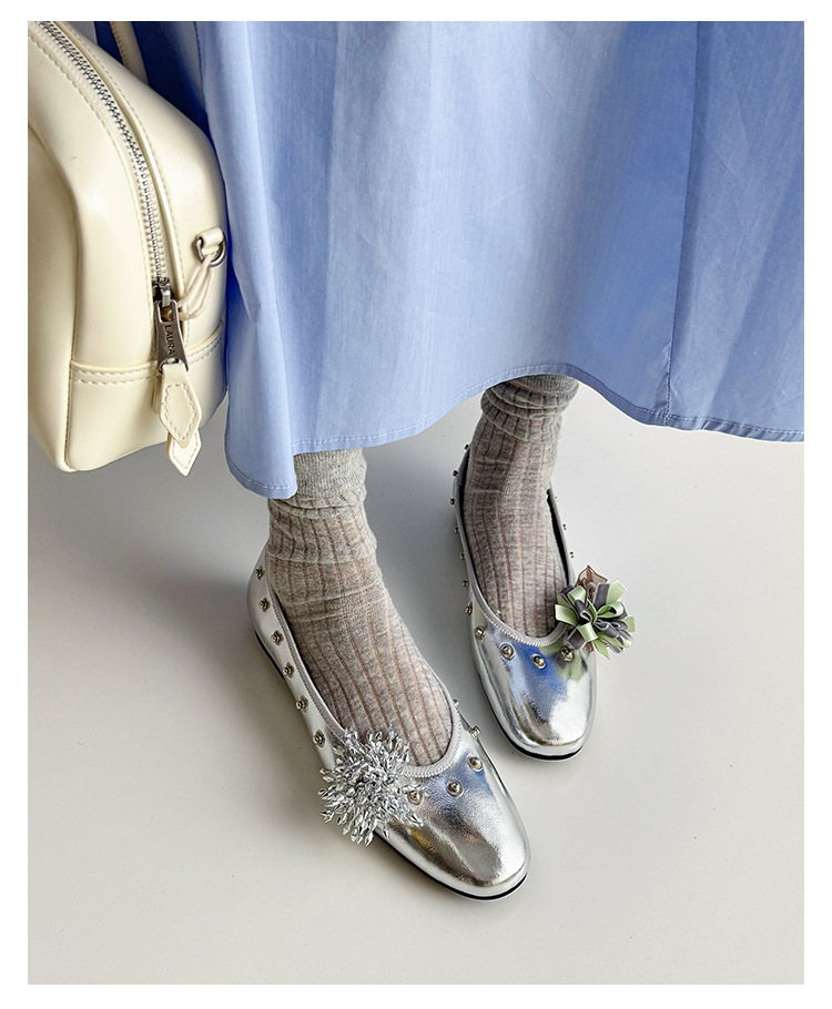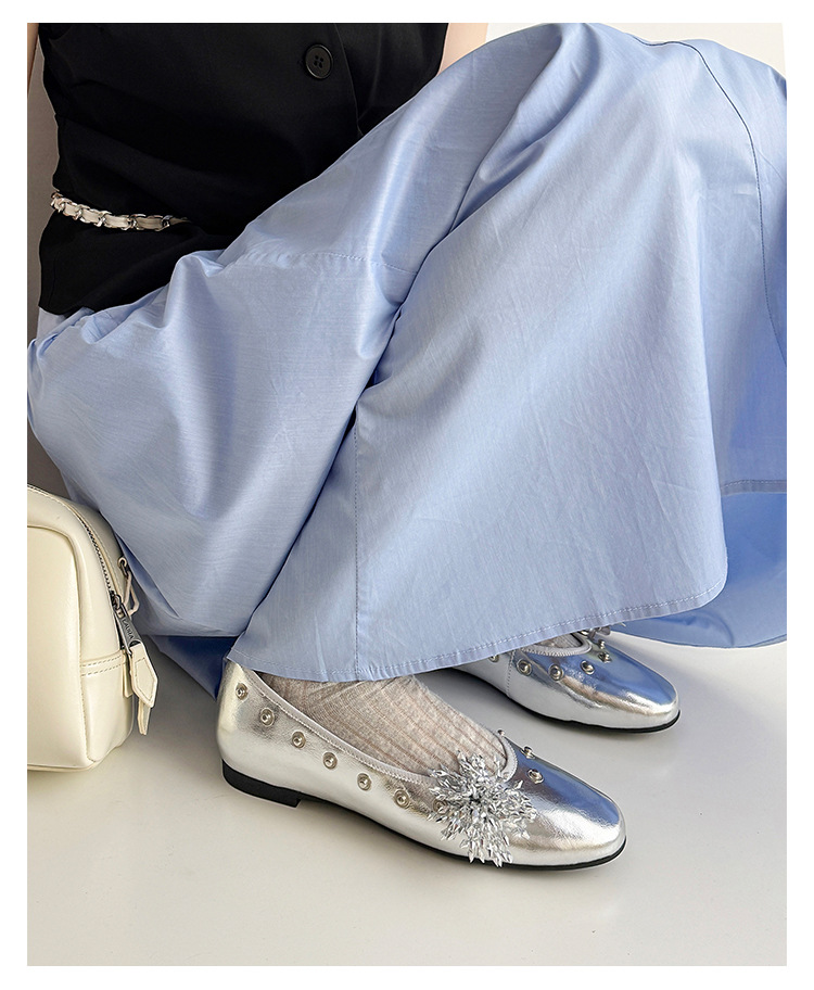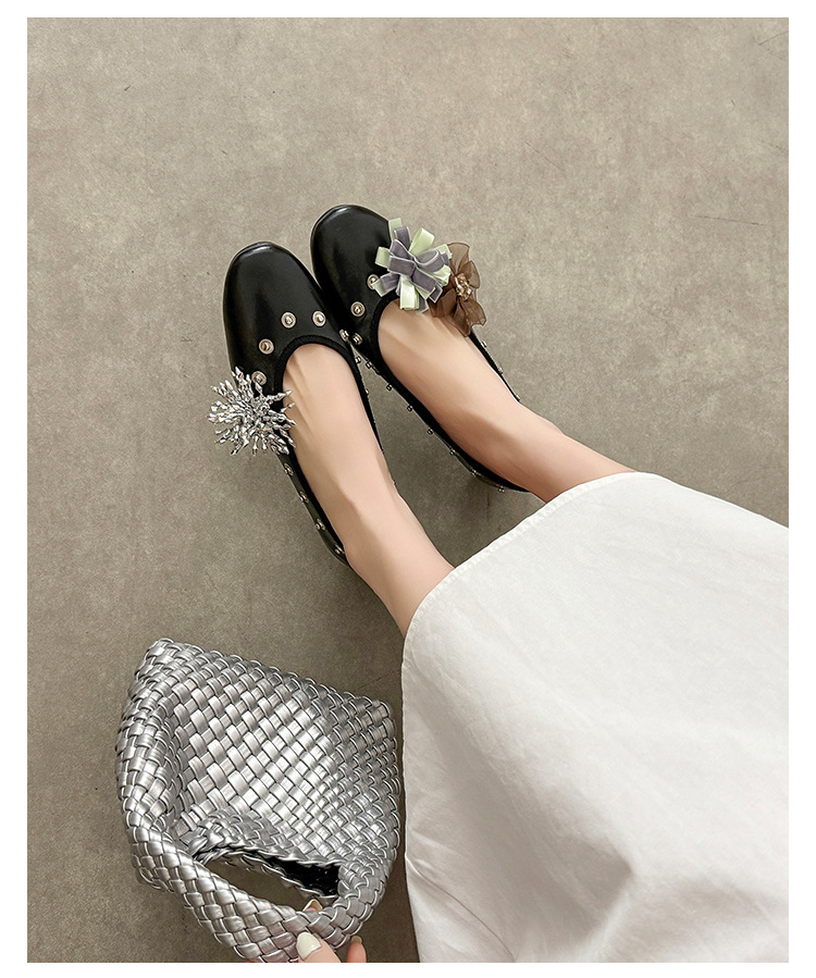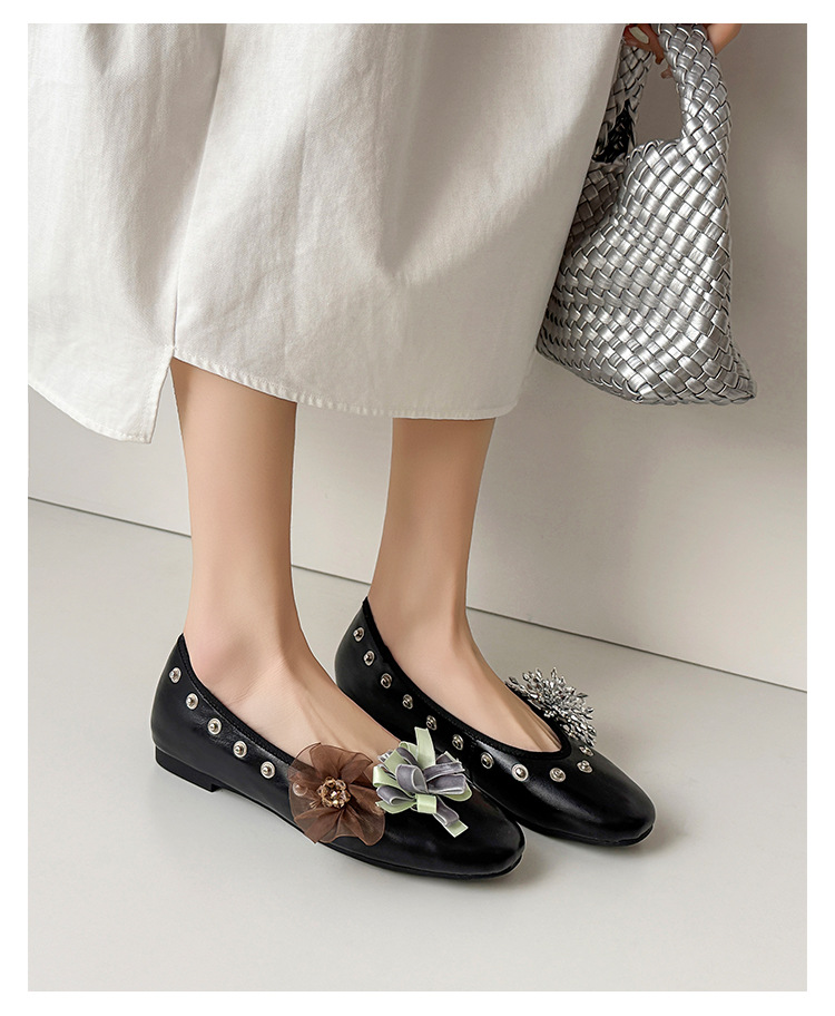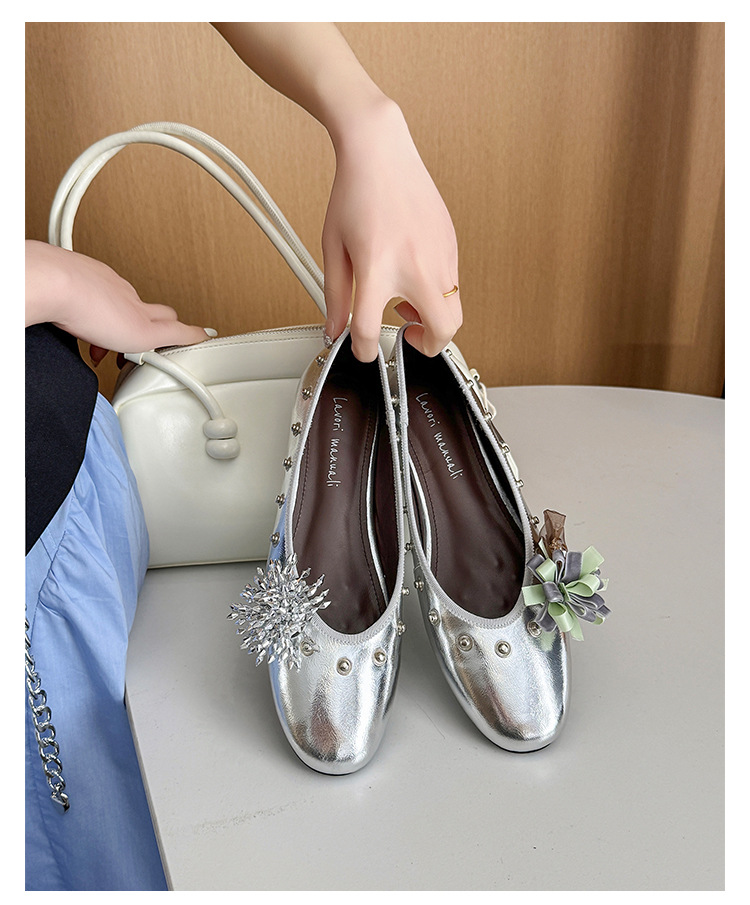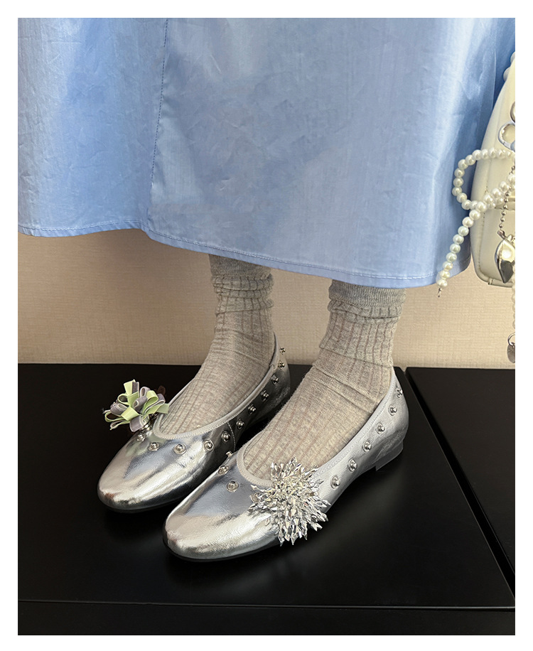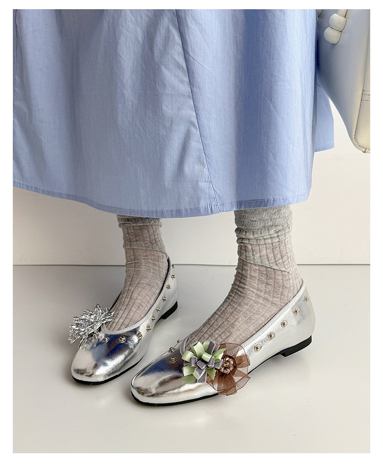 틈새 디자인 꽃 라인석 메리 제인 신발 요정 스타일 플랫 하단 라운드 머리 슬립 온 발레 신발 여성