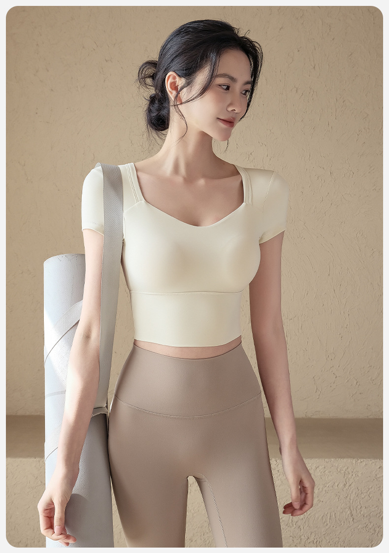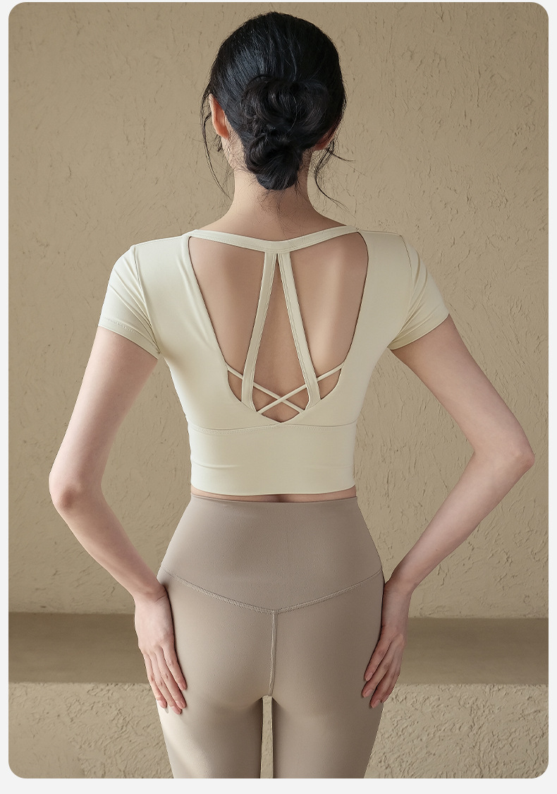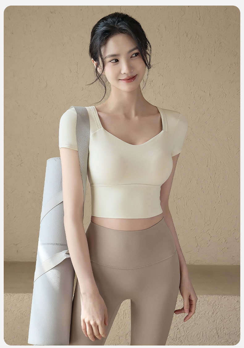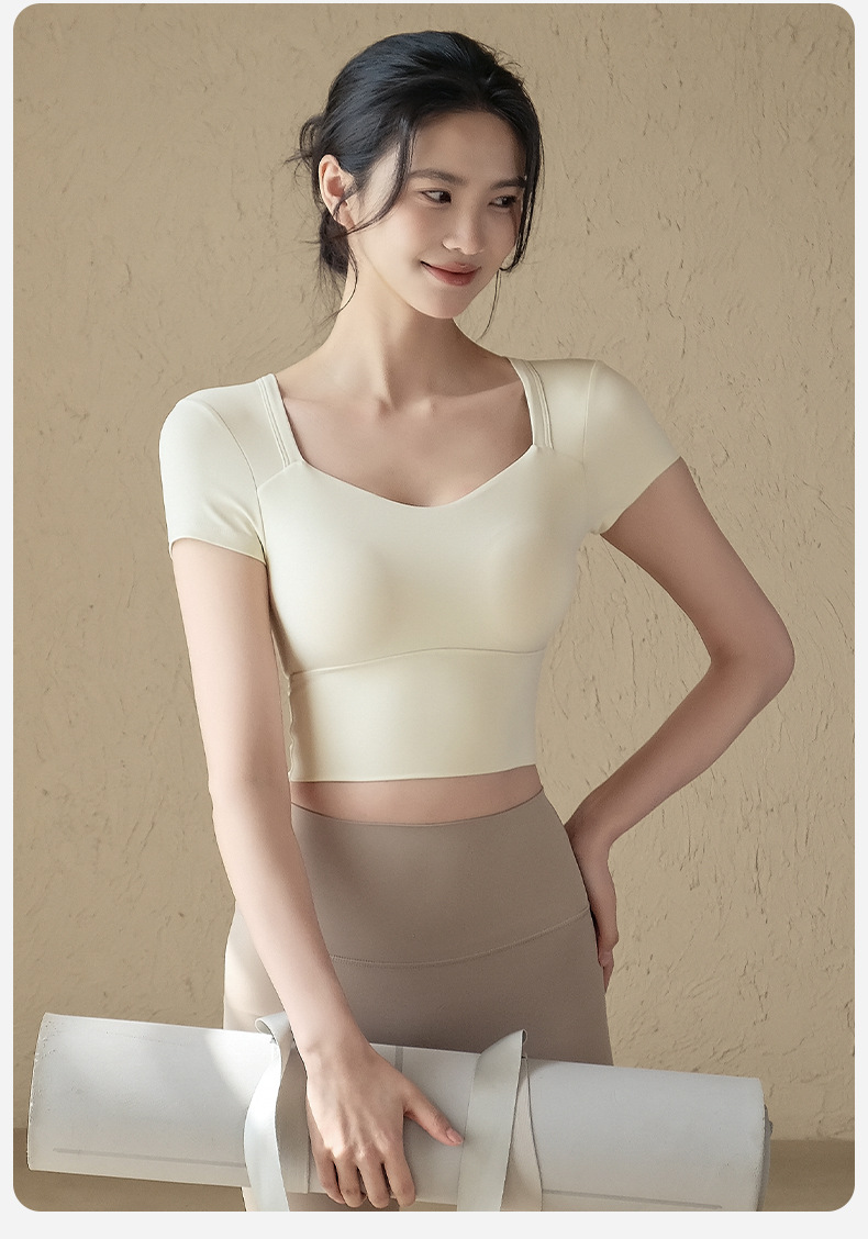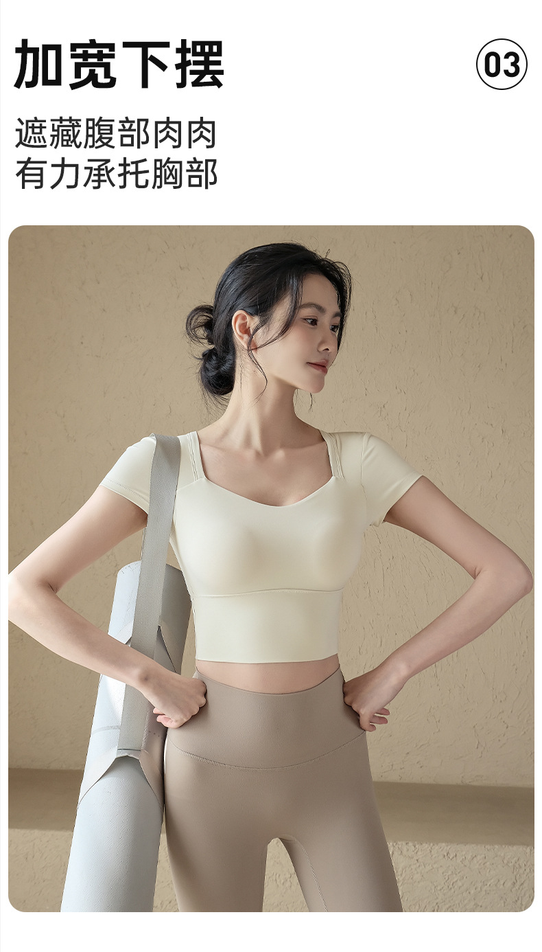 여름 허리 짧은 통기성 스포츠 티셔츠 필라테스 피트니스 훈련을위한 가슴 패드와 여성 요가 반팔 2025스토어 가기