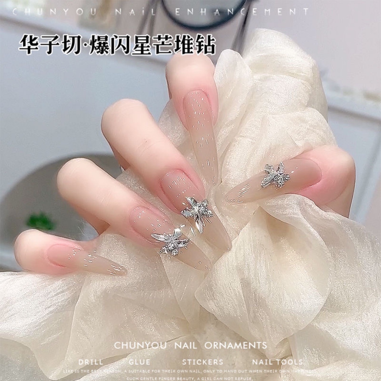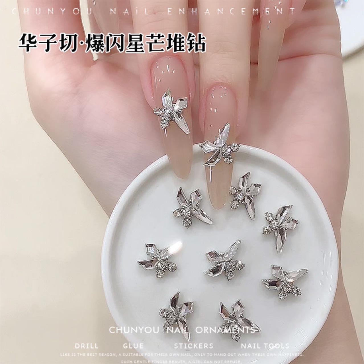 스타 awns 완성 된 파일 드릴 네일 아트 쥬얼리 금속 인레이 드릴 아이스 플래시 라이트 럭셔리 바람 착용 갑옷 장식 도매스토어 가기