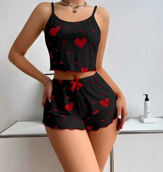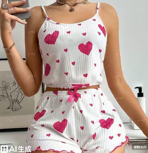 여름 새로운 유럽과 미국의 2024 니트 핏 스트립 사랑 인쇄 디자인 달콤한 슬링 반바지 순수 파자마스토어 가기