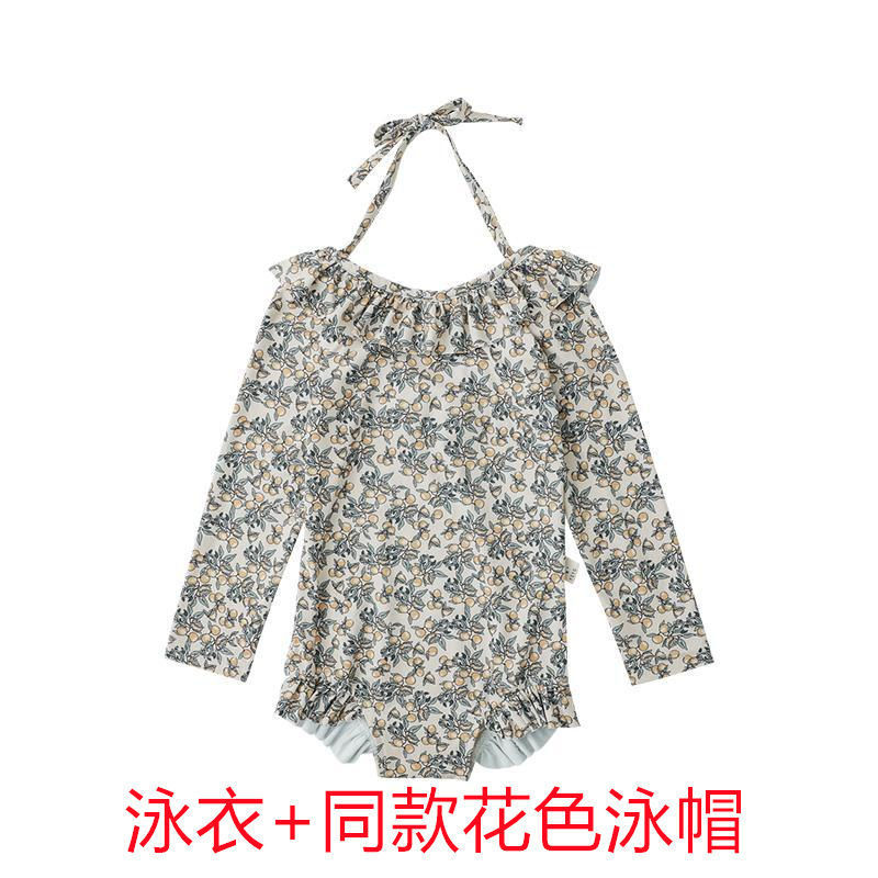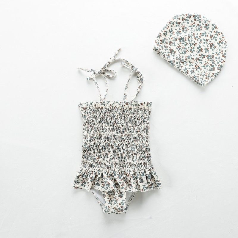 • 흰색 꽃무늬 수영복 멜빵 + 수영모