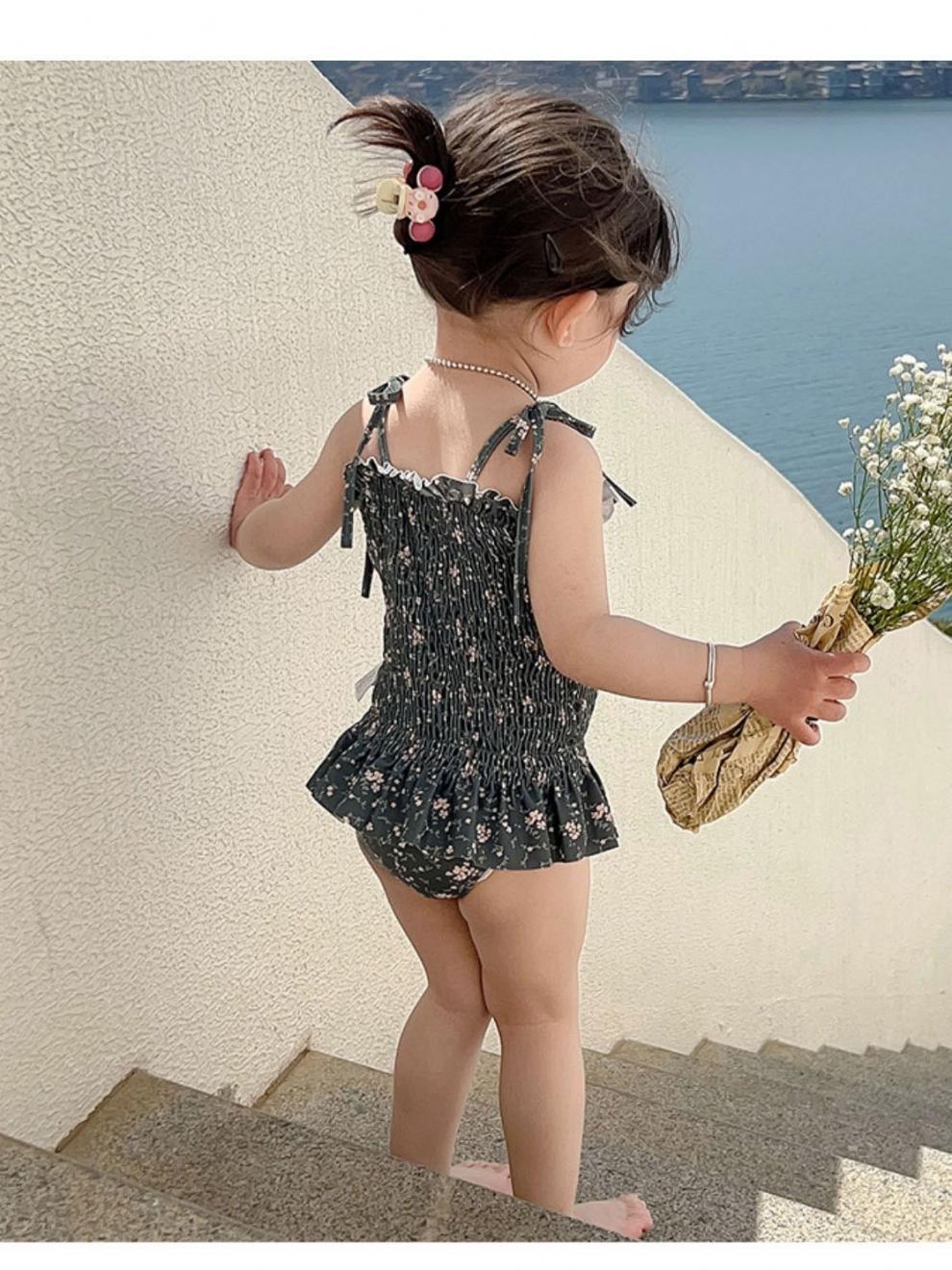 • 짙은 녹색 꽃무늬 수영복 멜빵