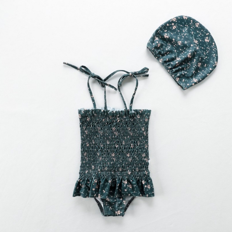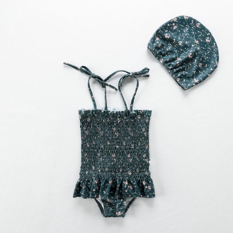 • 짙은 녹색 꽃무늬 수영복 멜빵 + 수영모