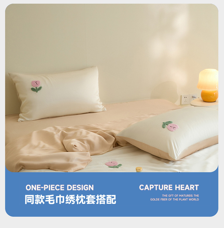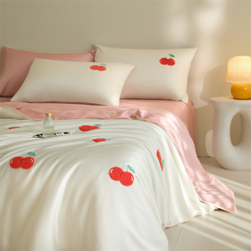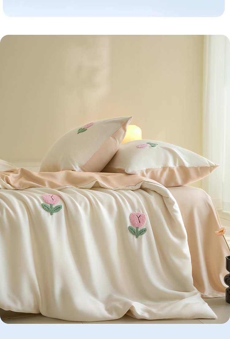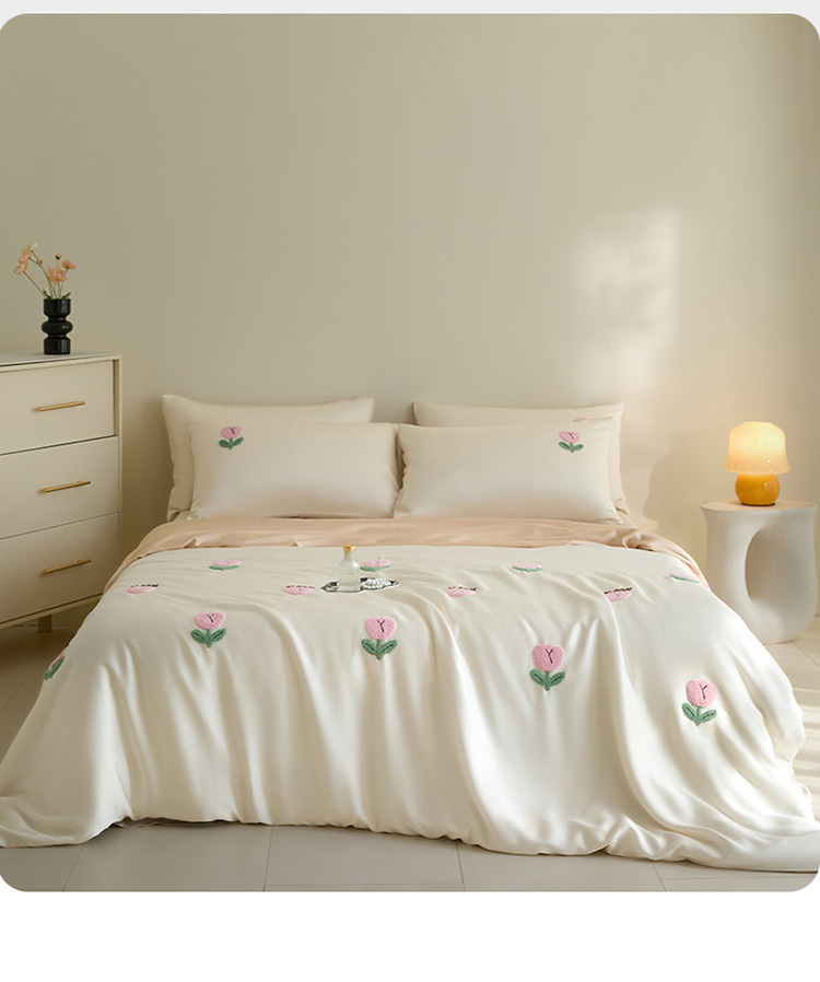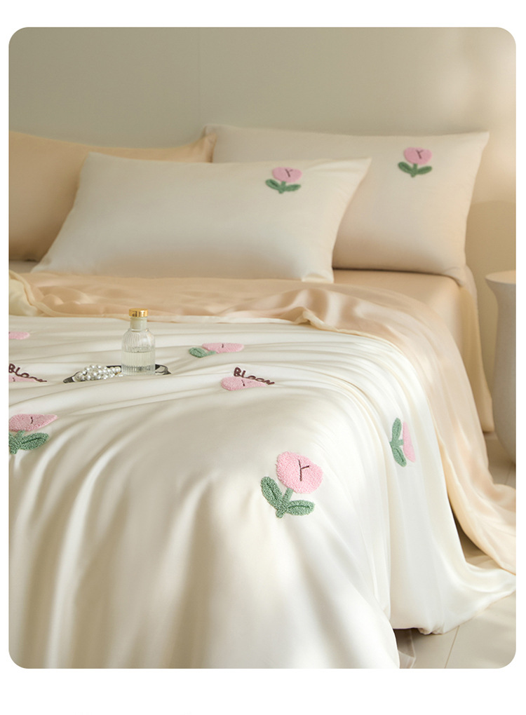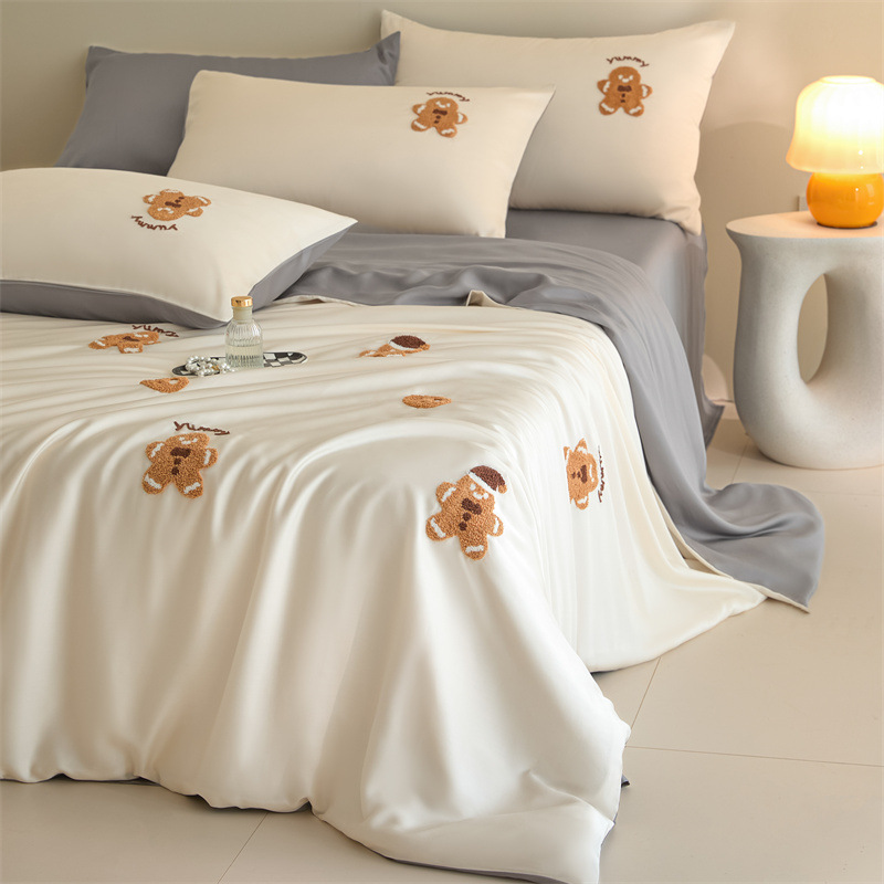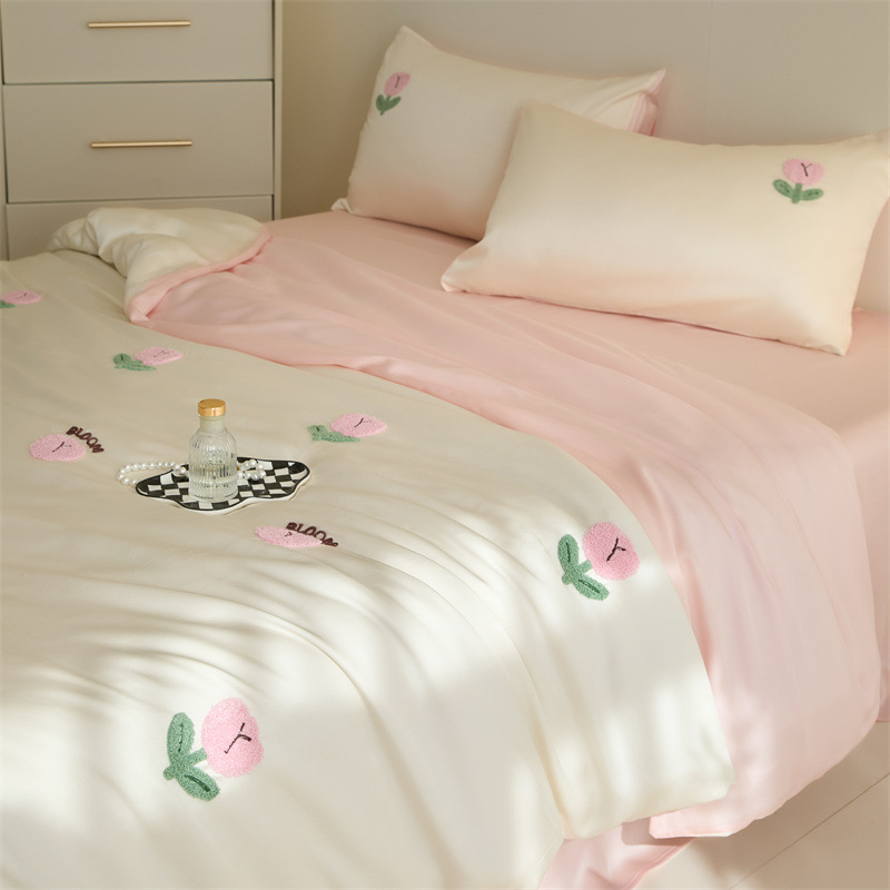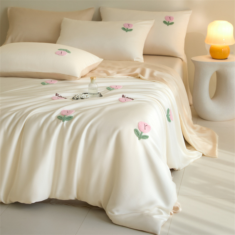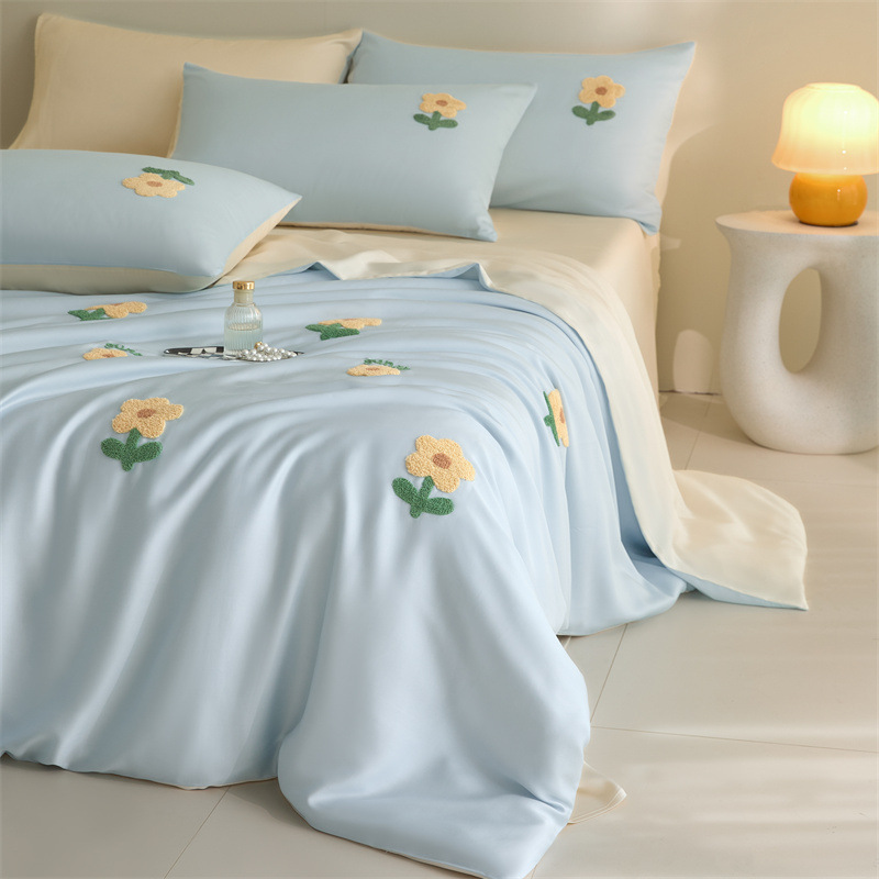 워시드 아이스 실크 수건 자수 4종 세트 시원한 에어컨 이불 커버 피부 친화적 통기성 세탁기 사용 가능 침구 세트 도매