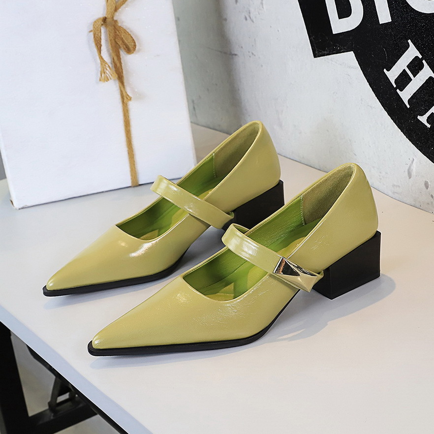 2838-2 유럽과 미국의 복고풍 얕은 입 Mary Jane 여성 신발 기질 발 뒤꿈치 싱글 슈즈와 두꺼운 뒤꿈치 뾰족한 금속 버클 단어