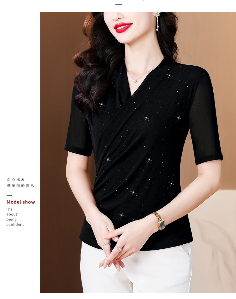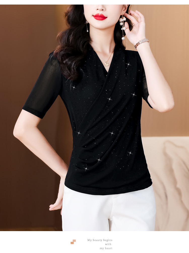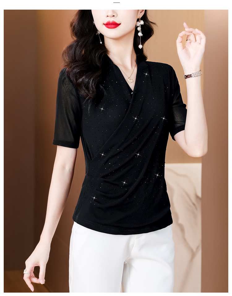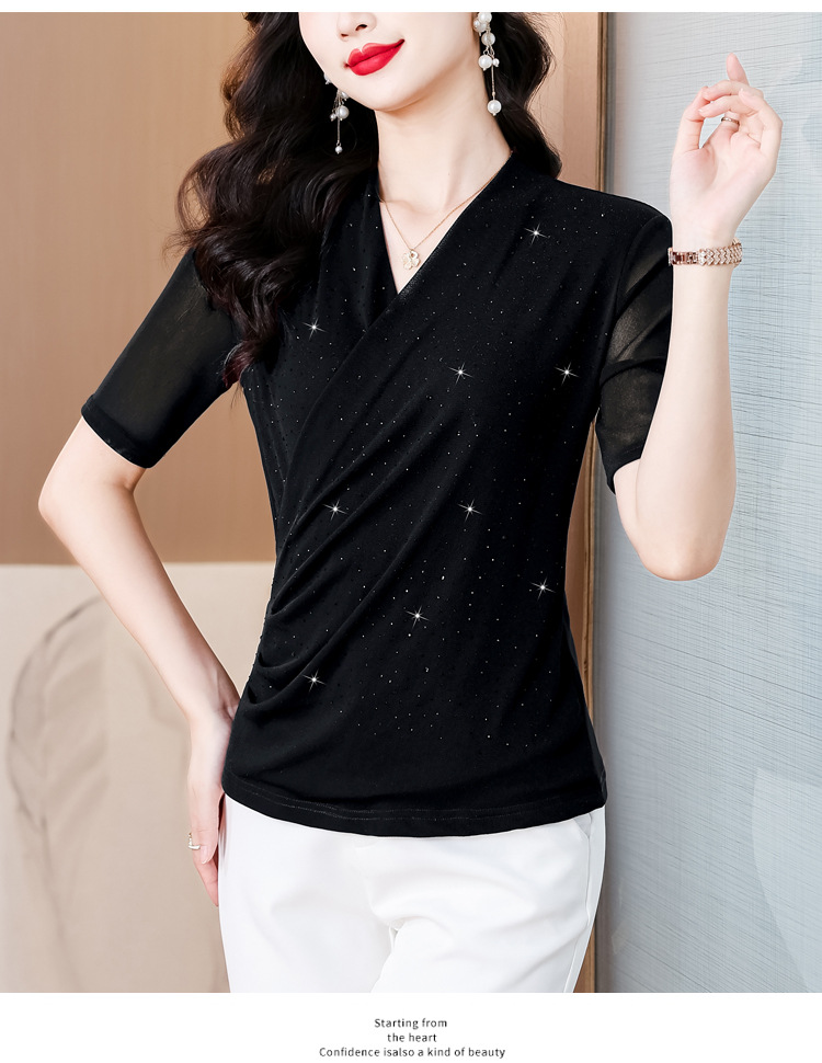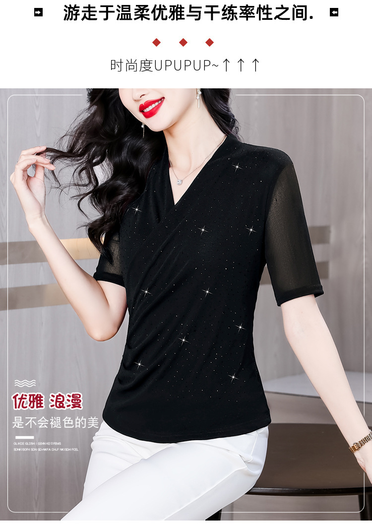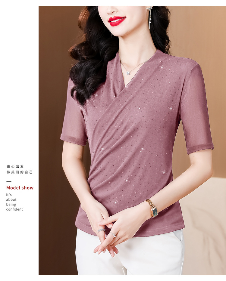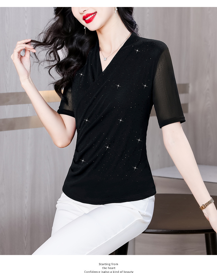 여름 새로운 핫 드릴링 패션 세련된 올매치 우아한 긴 소매 작은 셔츠 메쉬 슬리밍 여성용 V 넥 베이스 셔츠