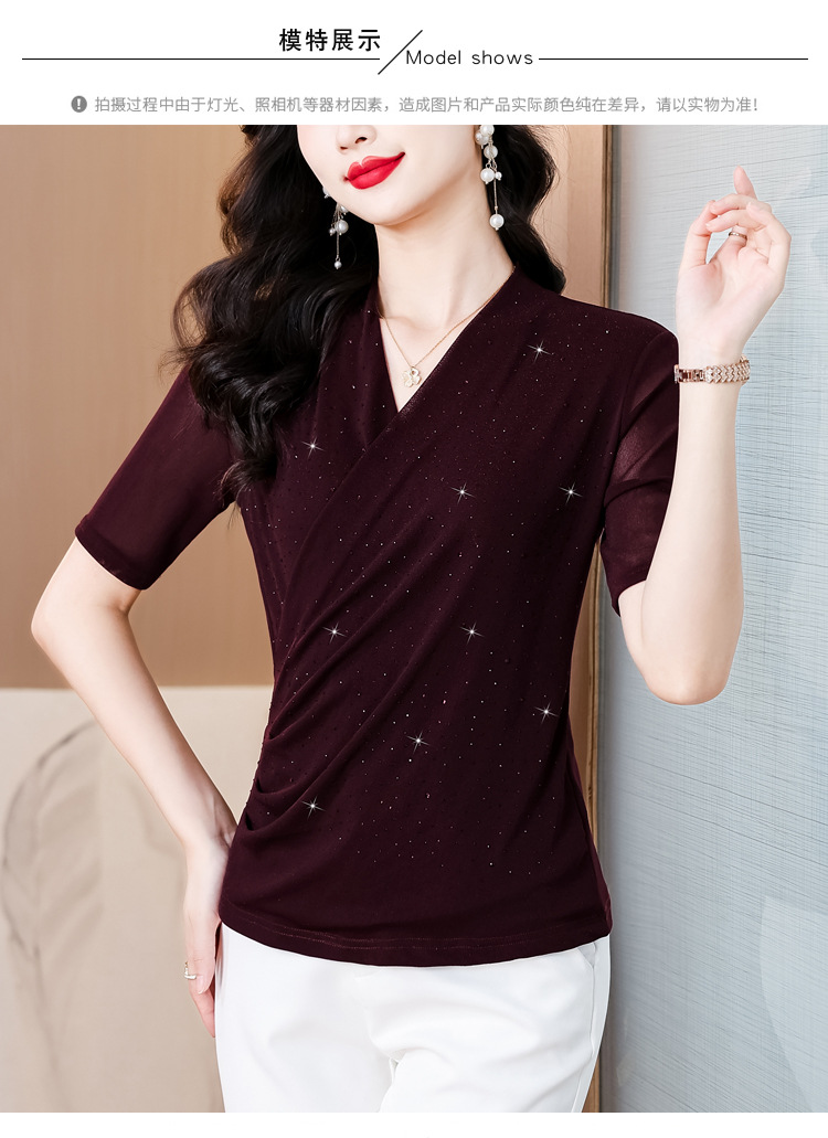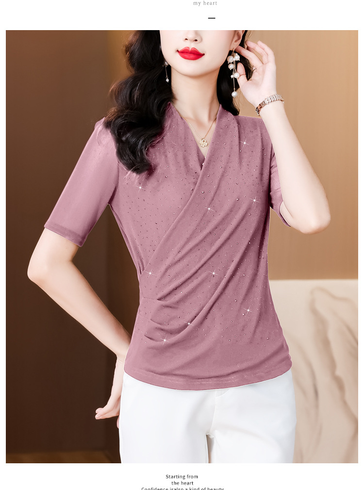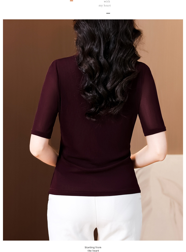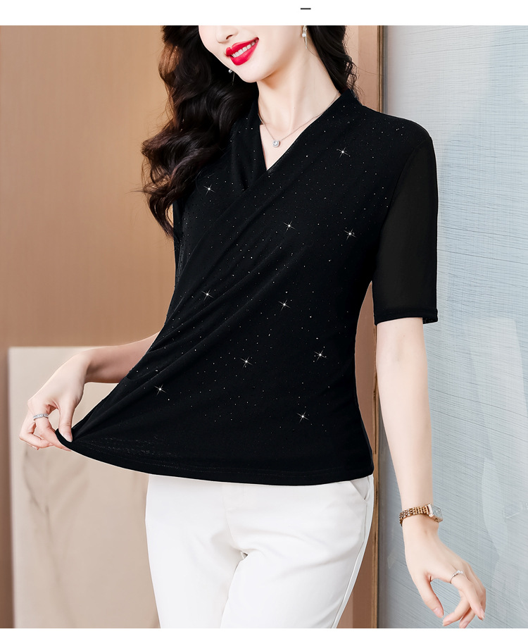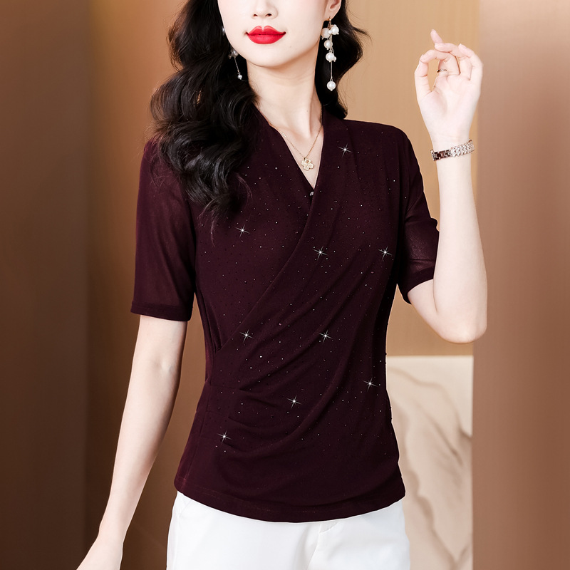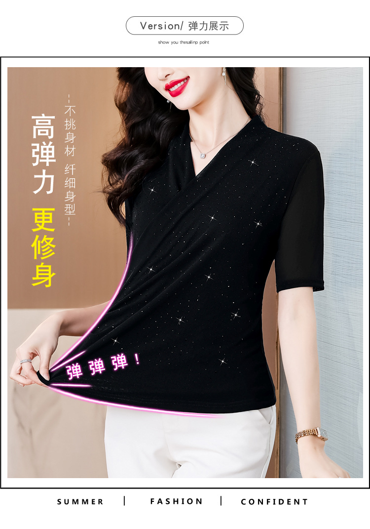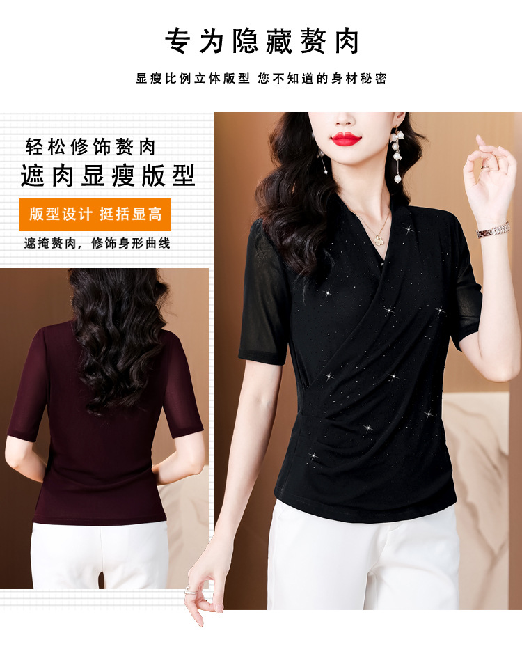 여름 새로운 핫 드릴링 패션 세련된 올매치 우아한 긴 소매 작은 셔츠 메쉬 슬리밍 여성용 V 넥 베이스 셔츠
