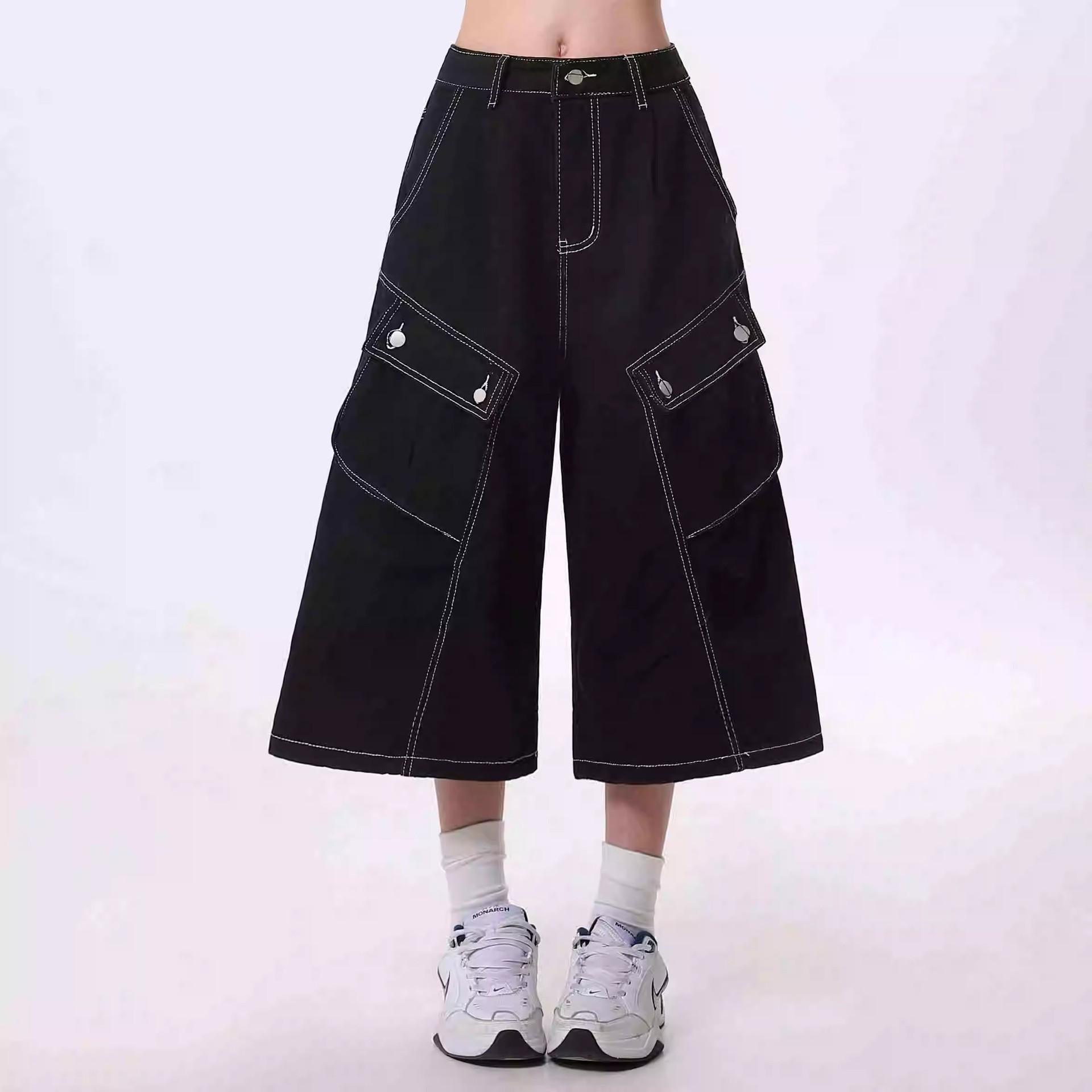 미국 스타일의 레트로 대형 포켓 크레인 바지 남성과 여성을위한 여름 디자인 센스 오픈 라인 느슨한 넓은 다리 자른 데님 바지스토어 가기