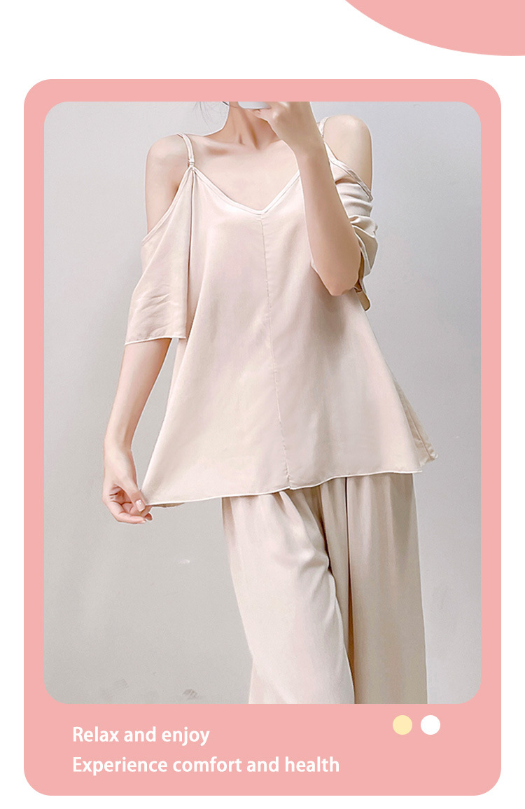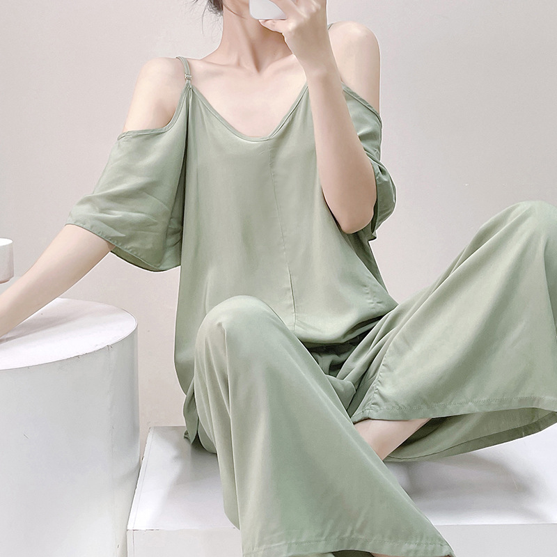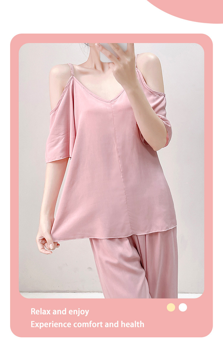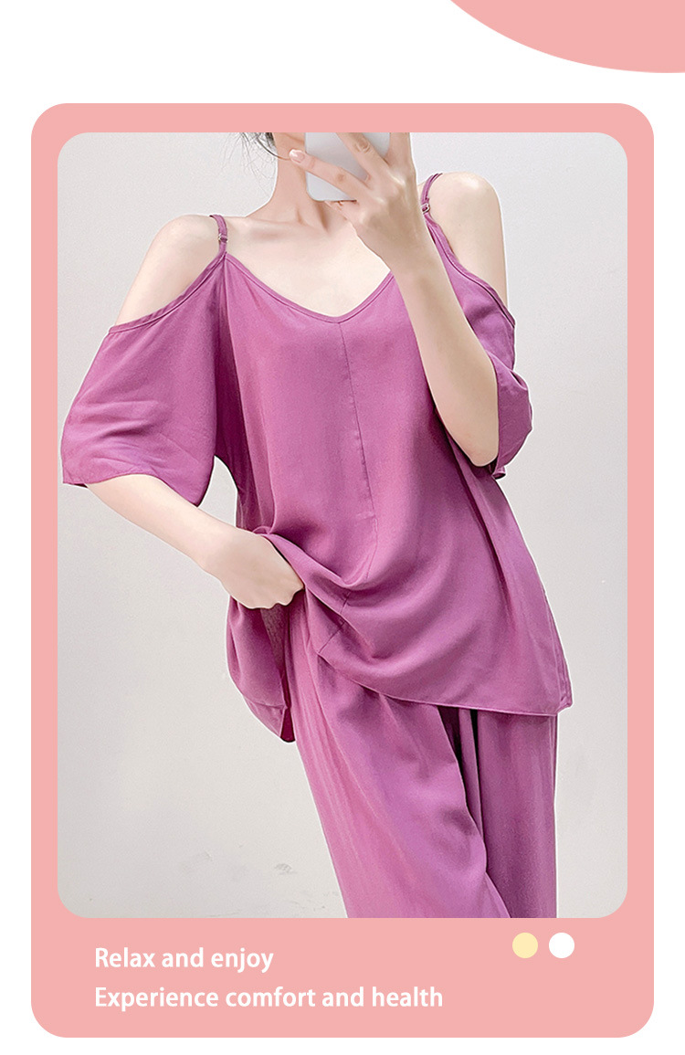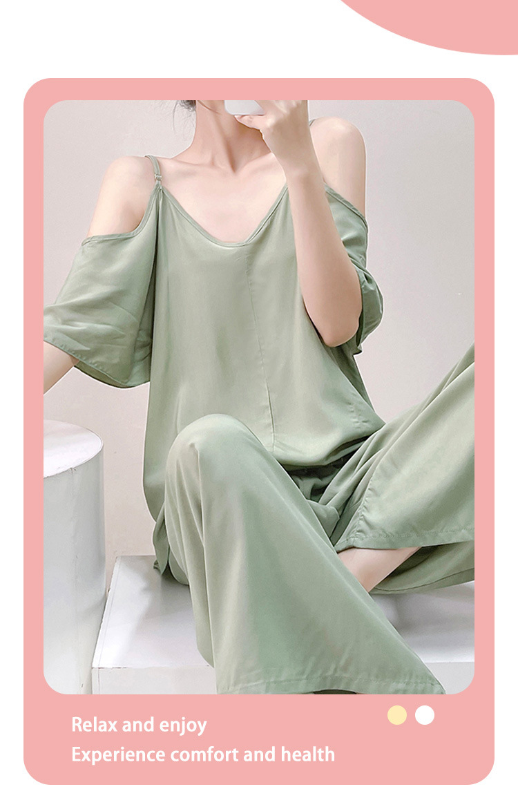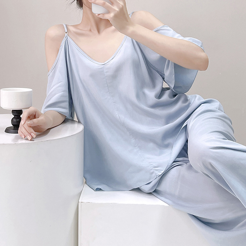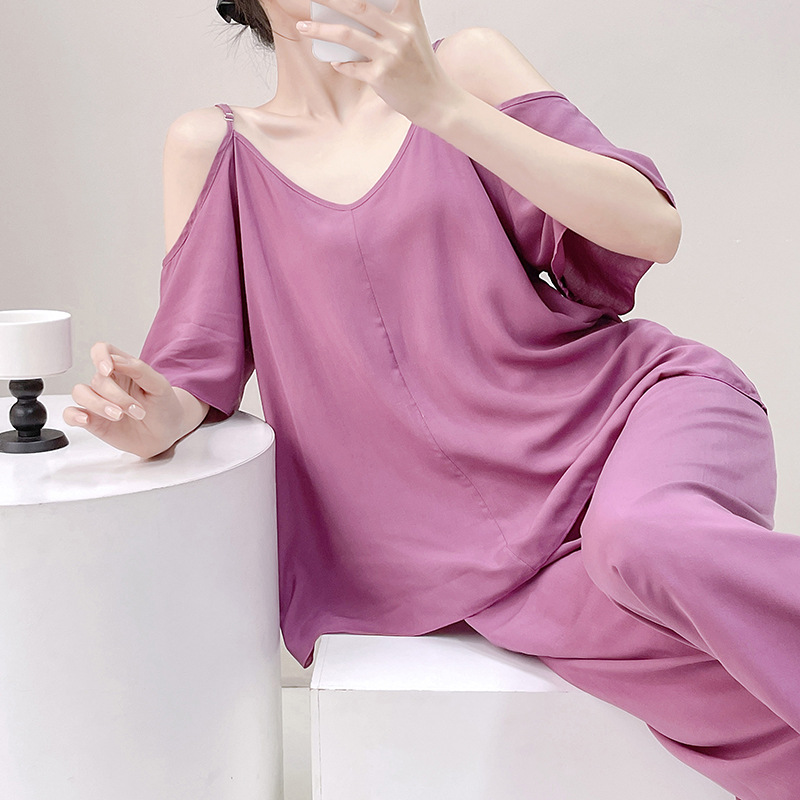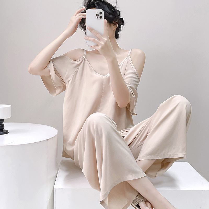 여름 여성용 오프숄더 잠옷, 고급 단색 면 실크 홈웨어 세트, 야외에서 착용 가능, 캐주얼 투피스 얇은 슈트스토어 가기