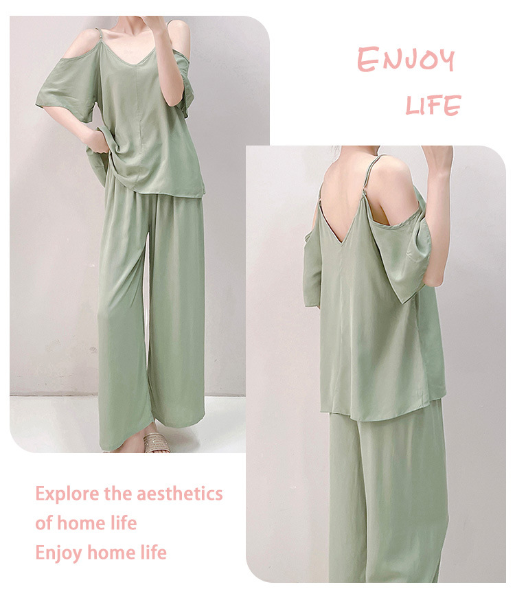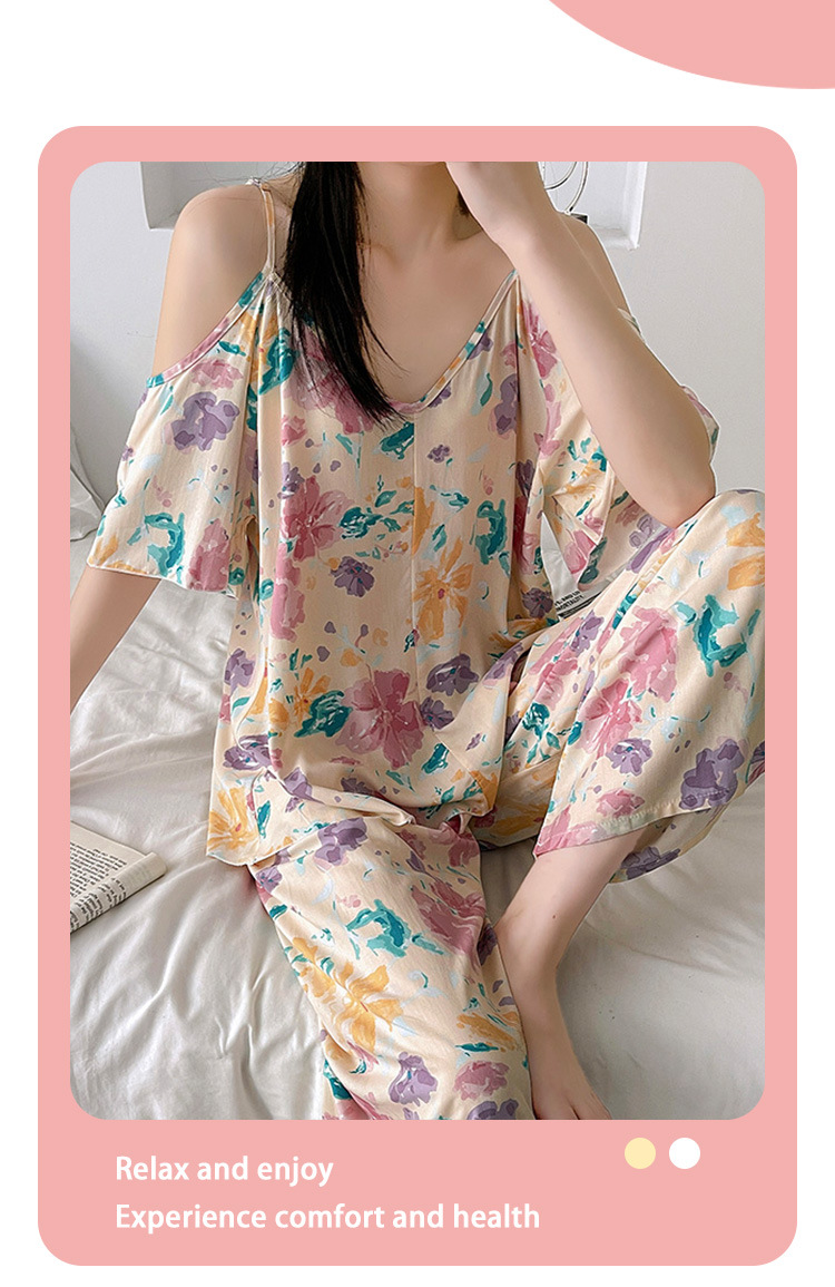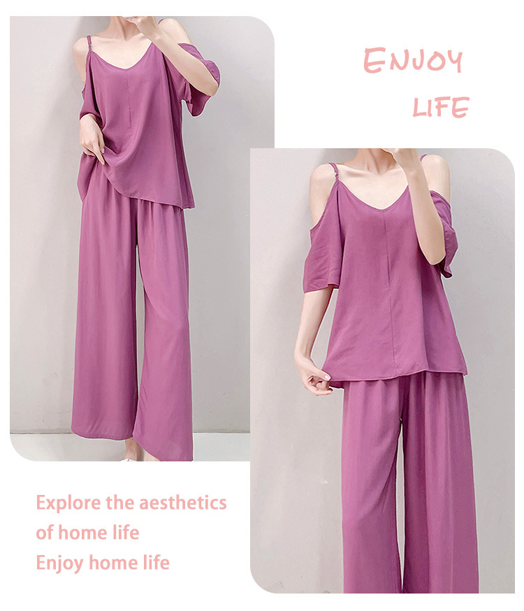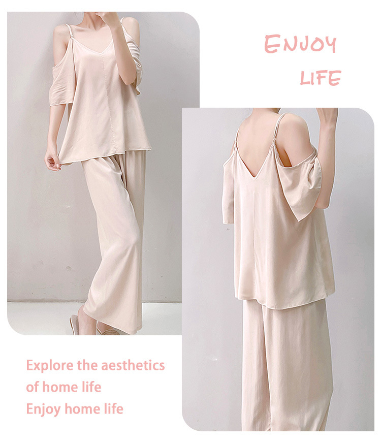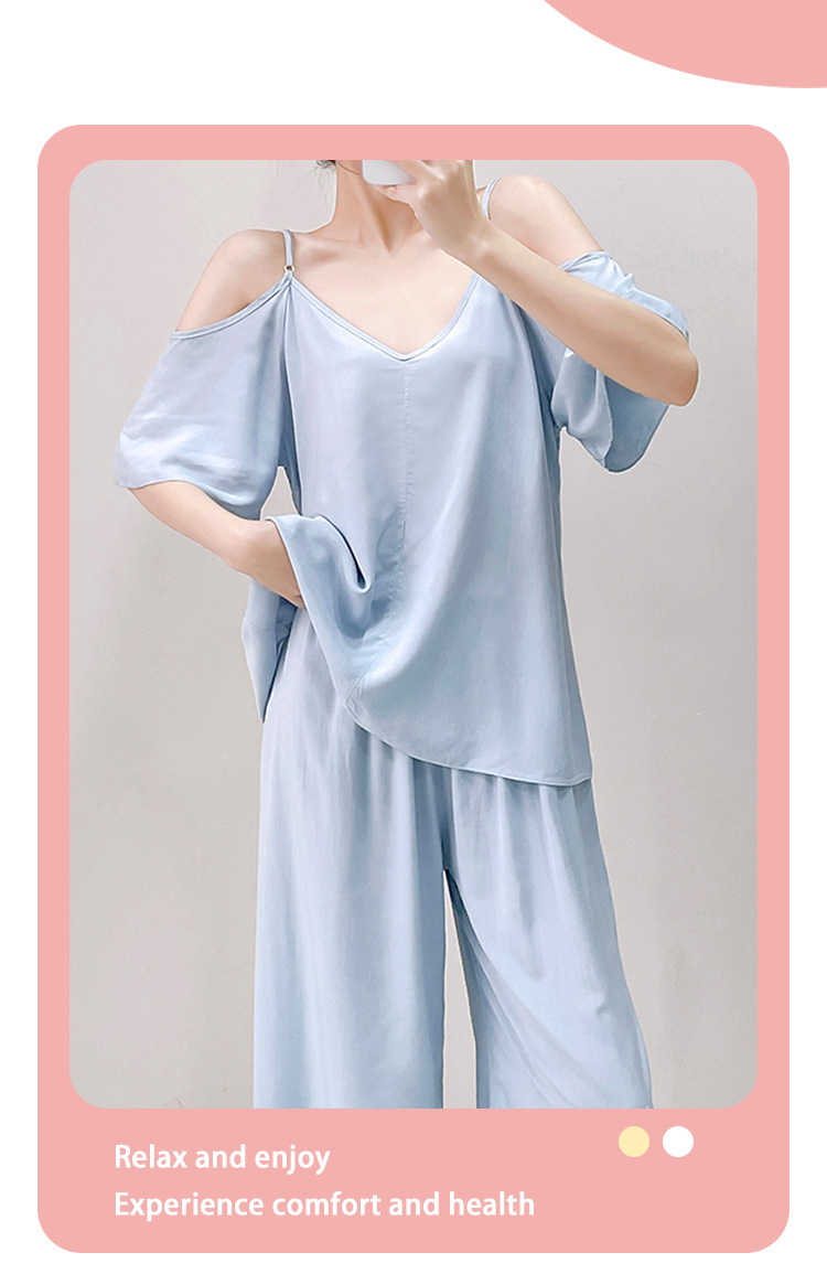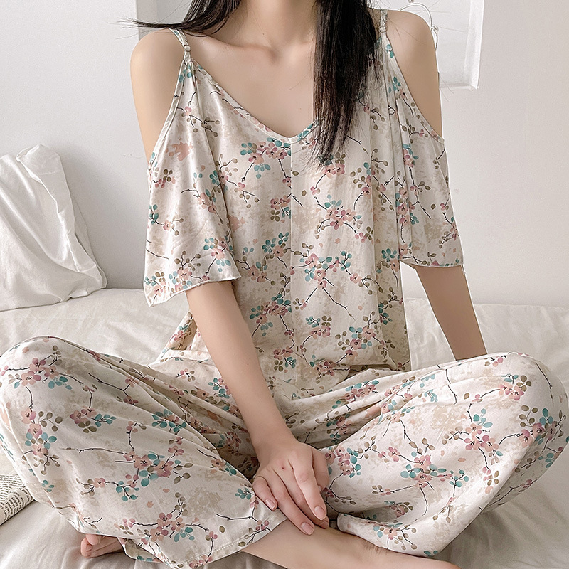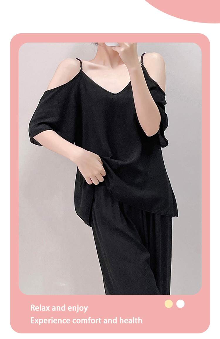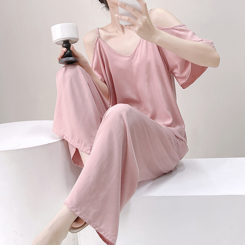 여름 여성용 오프숄더 잠옷, 고급 단색 면 실크 홈웨어 세트, 야외에서 착용 가능, 캐주얼 투피스 얇은 슈트스토어 가기