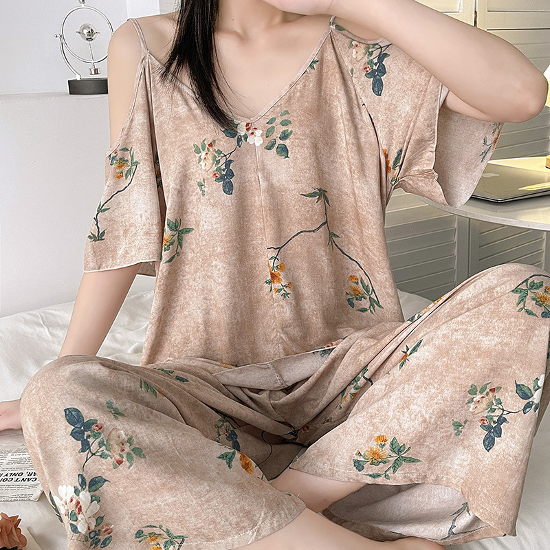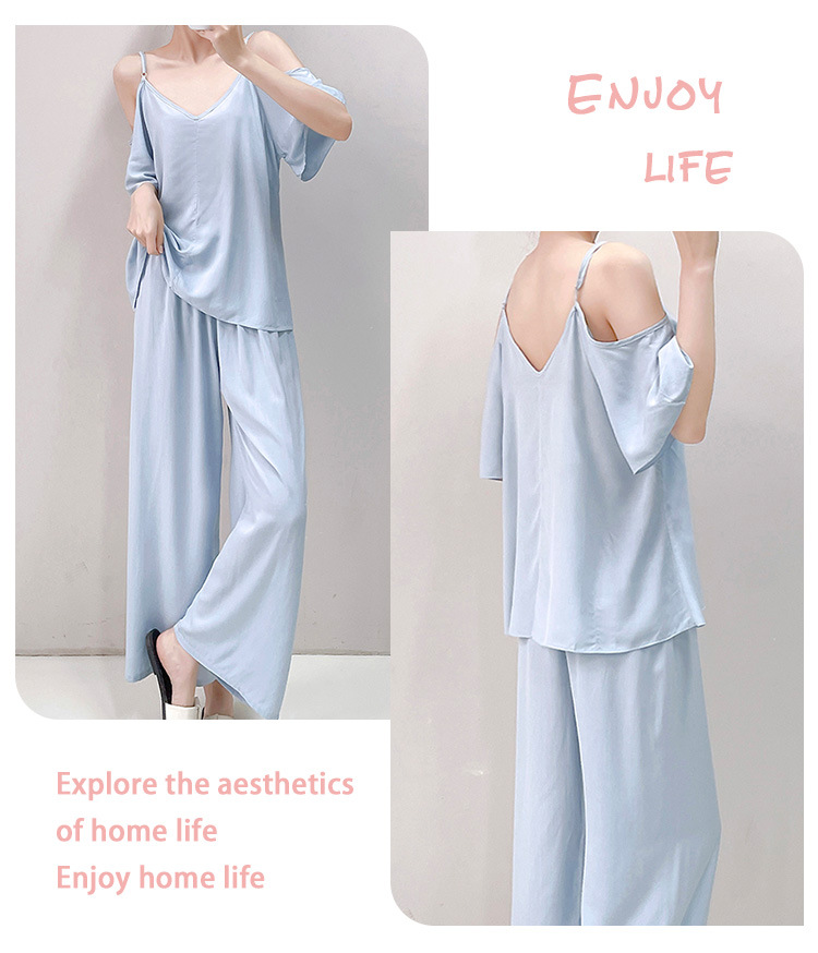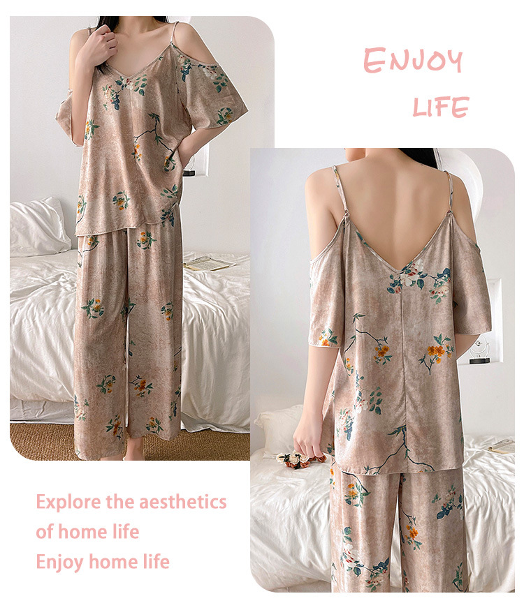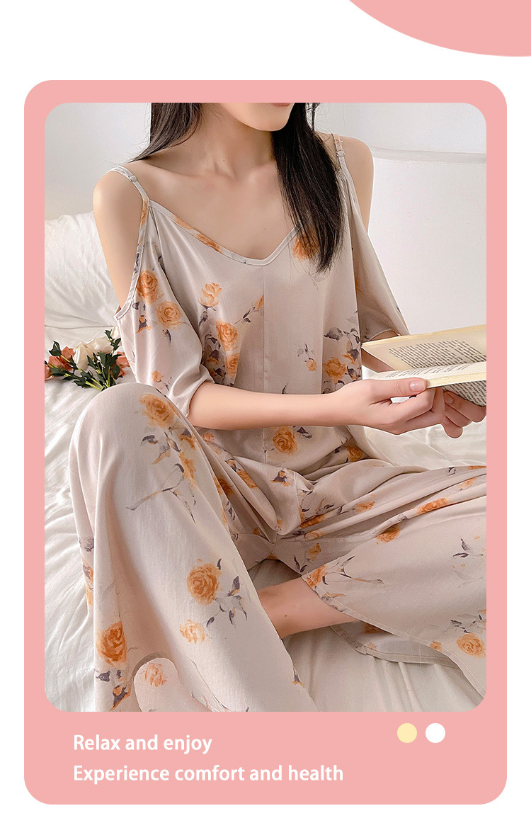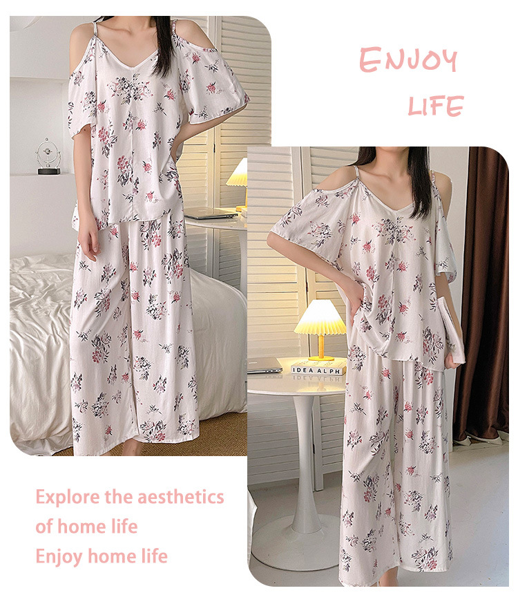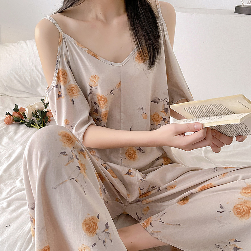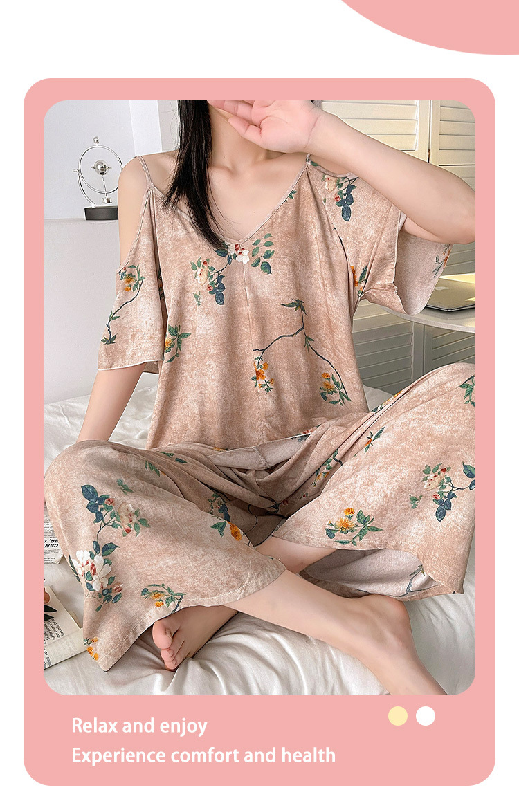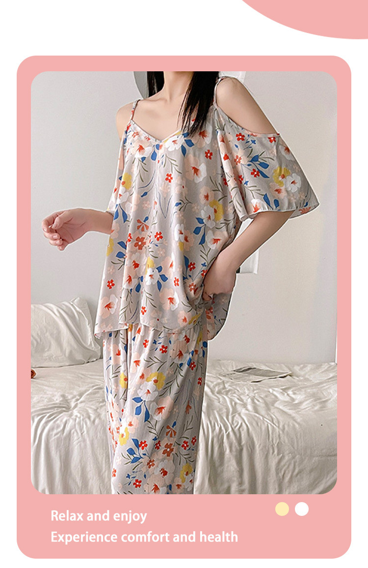 여름 여성용 오프숄더 잠옷, 고급 단색 면 실크 홈웨어 세트, 야외에서 착용 가능, 캐주얼 투피스 얇은 슈트스토어 가기