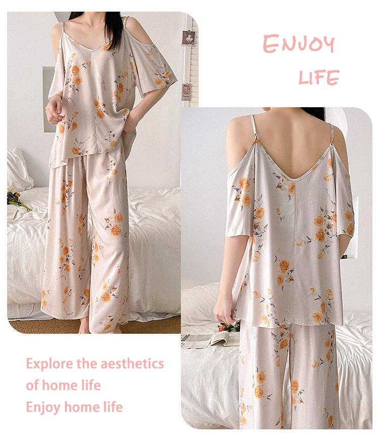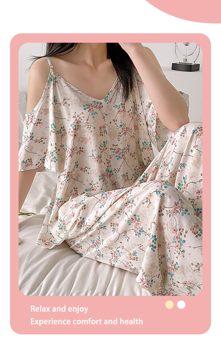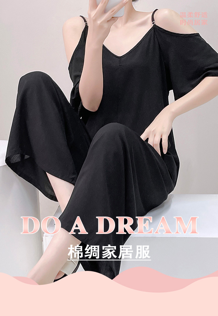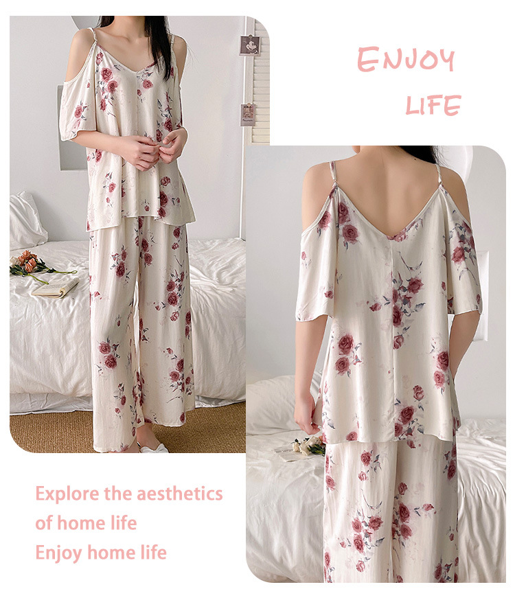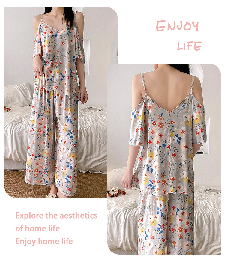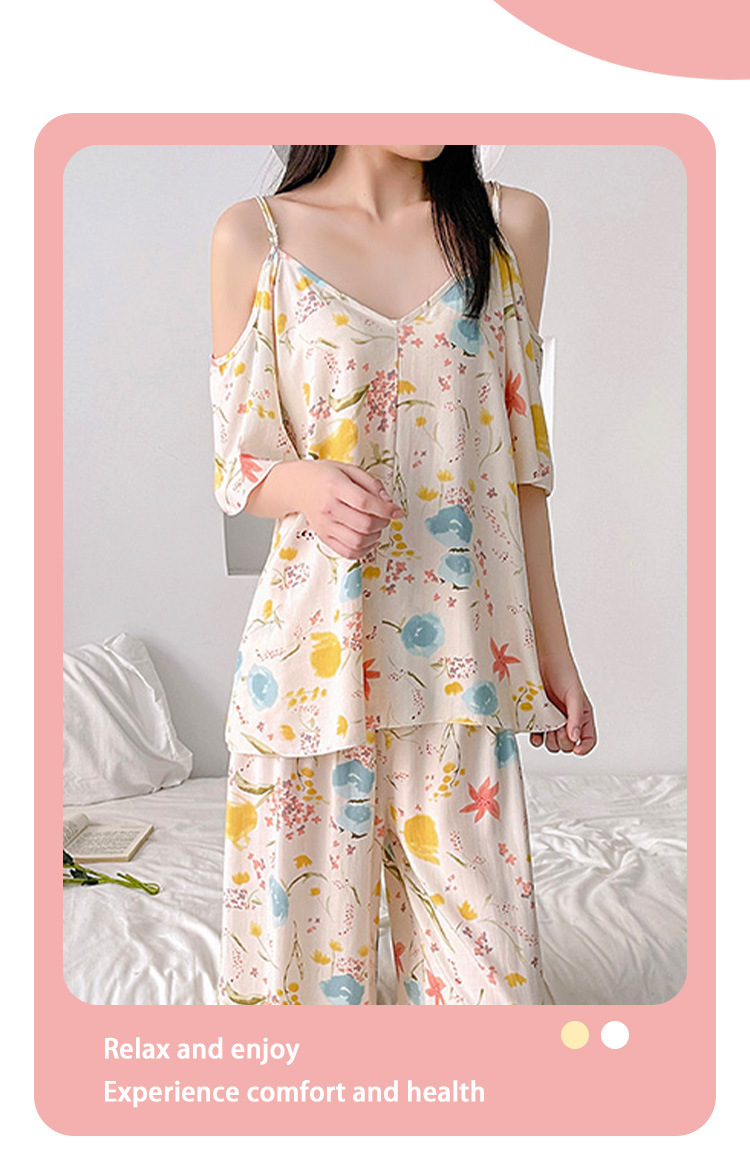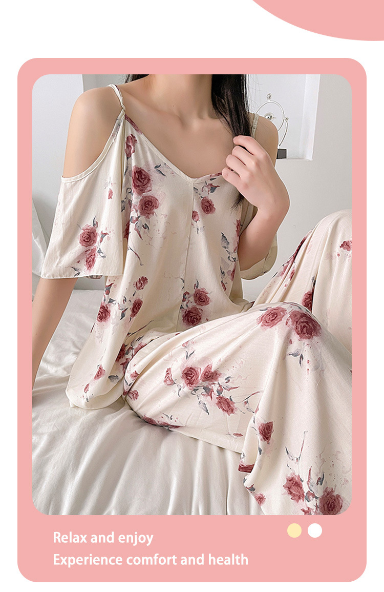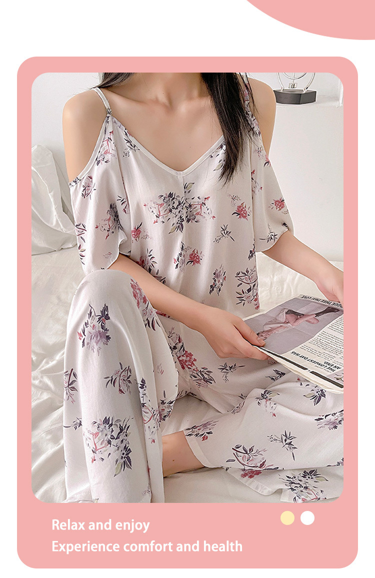 여름 여성용 오프숄더 잠옷, 고급 단색 면 실크 홈웨어 세트, 야외에서 착용 가능, 캐주얼 투피스 얇은 슈트스토어 가기