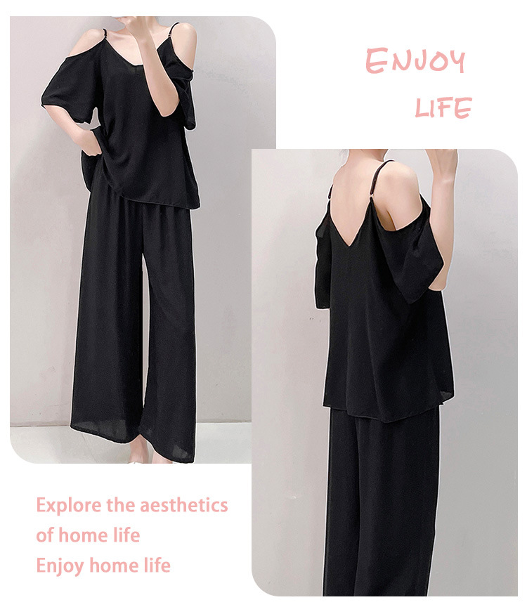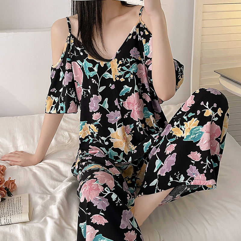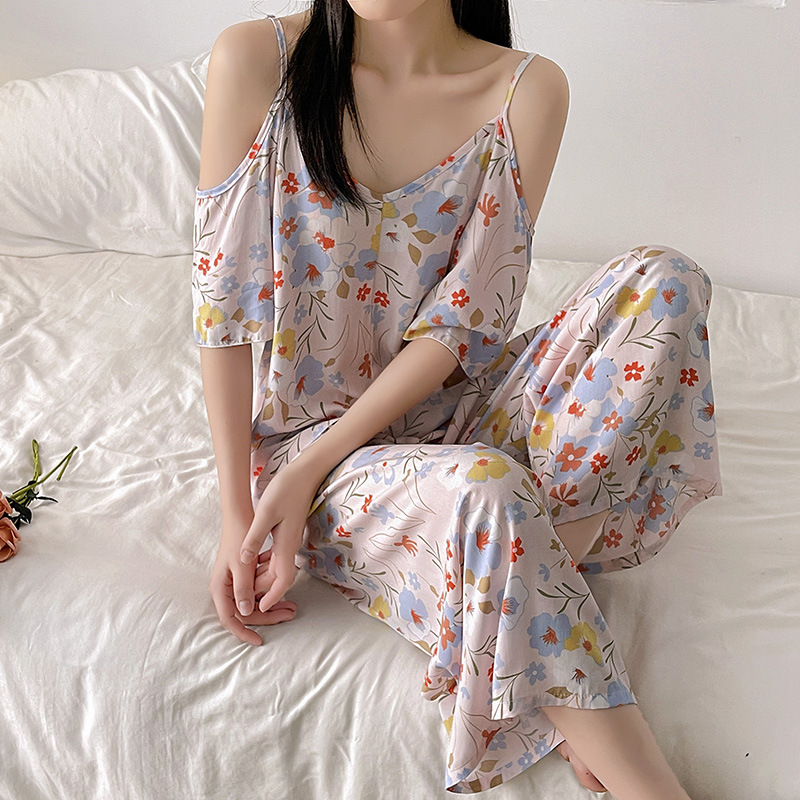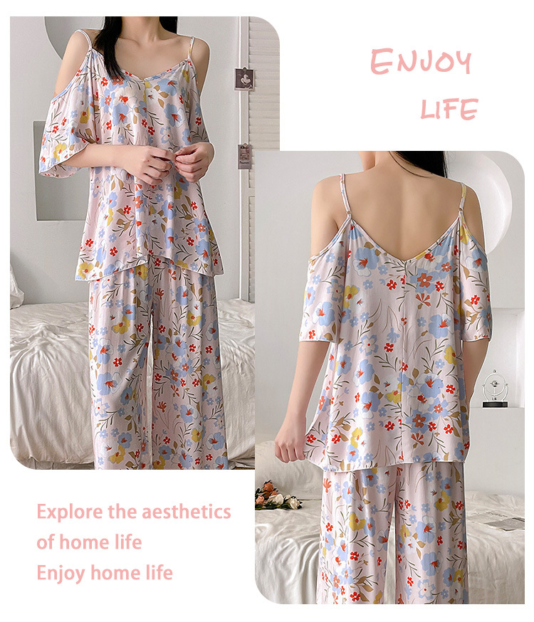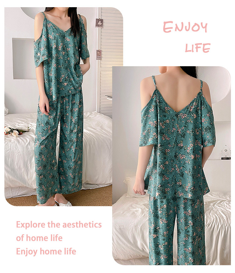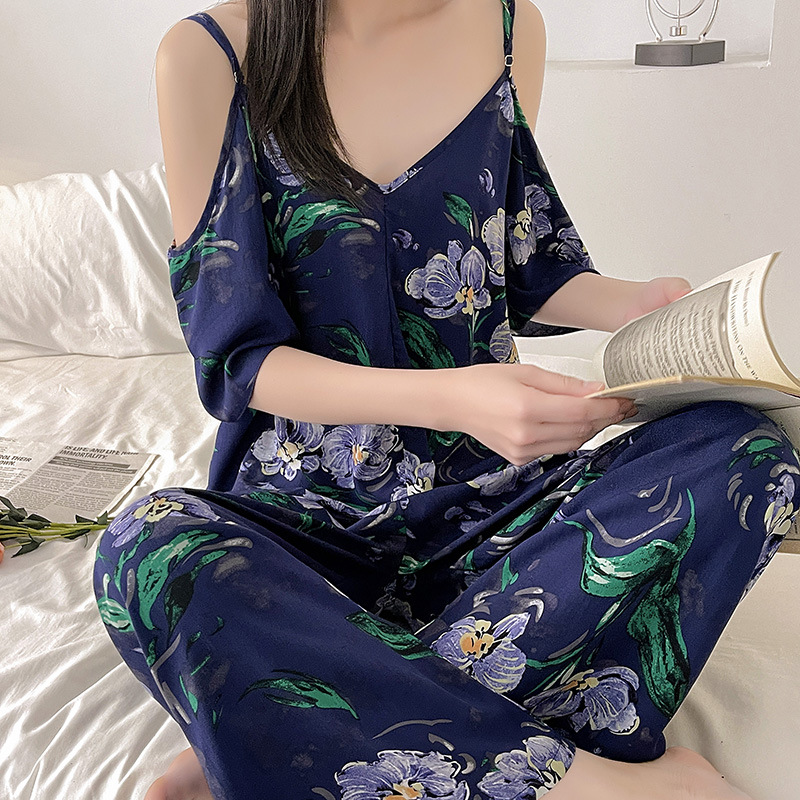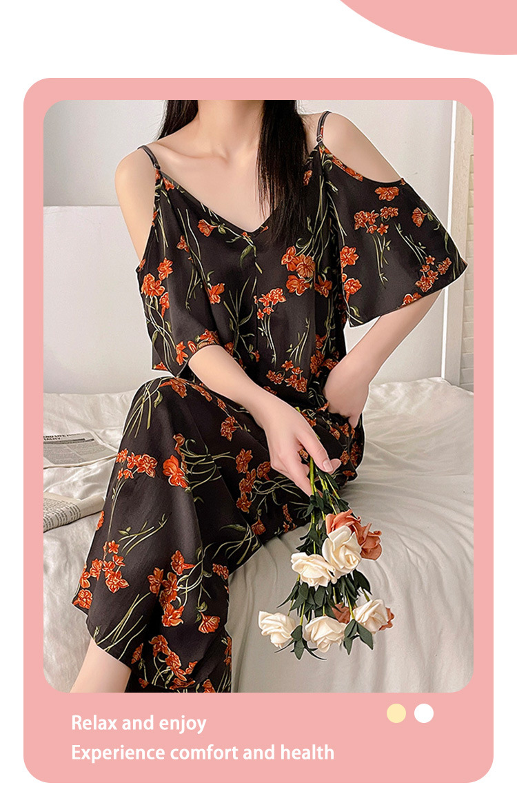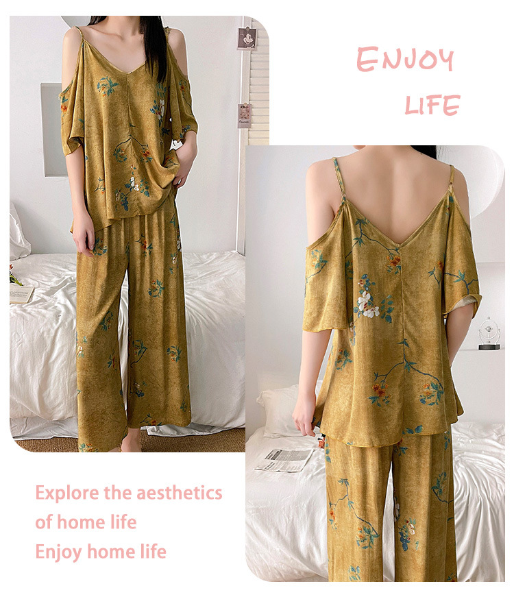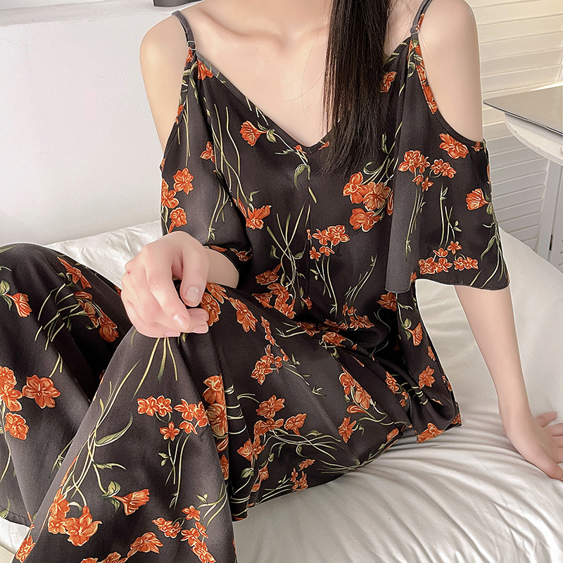 여름 여성용 오프숄더 잠옷, 고급 단색 면 실크 홈웨어 세트, 야외에서 착용 가능, 캐주얼 투피스 얇은 슈트스토어 가기