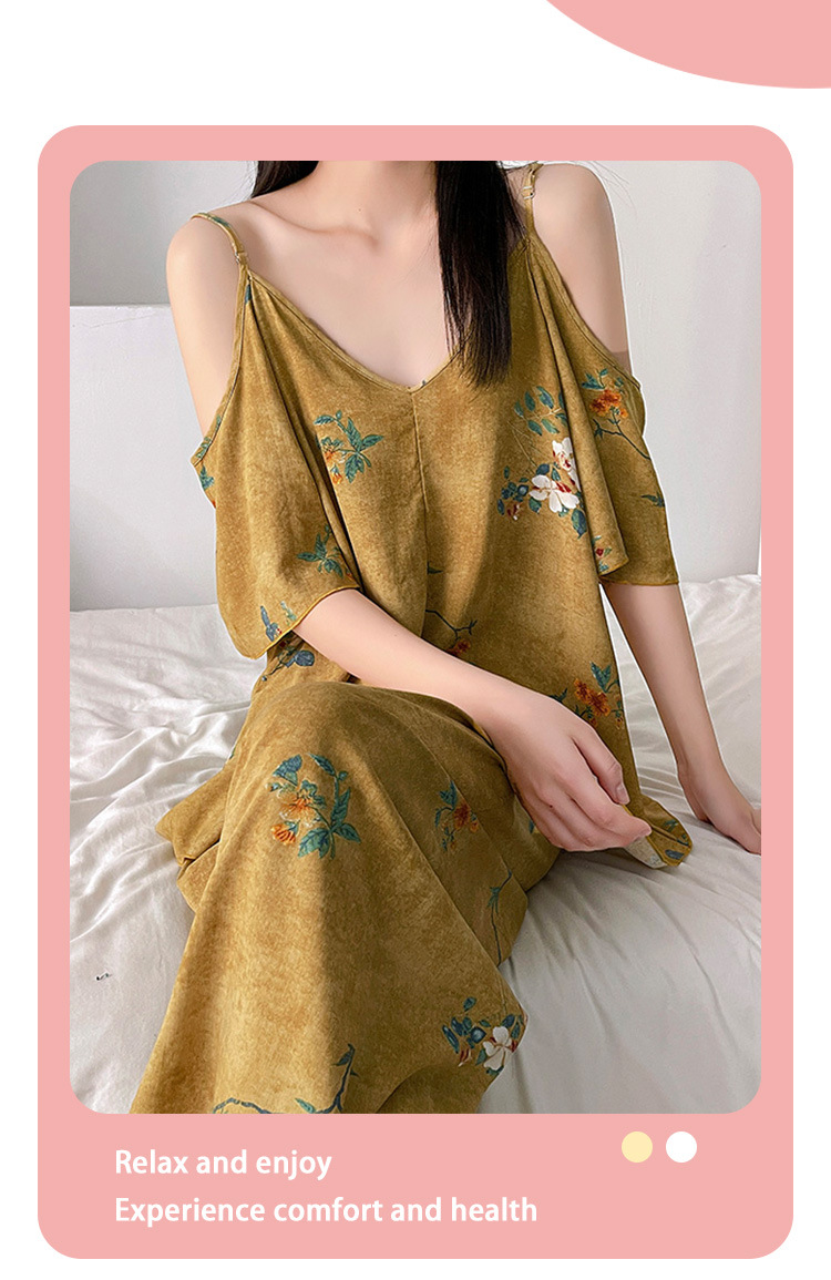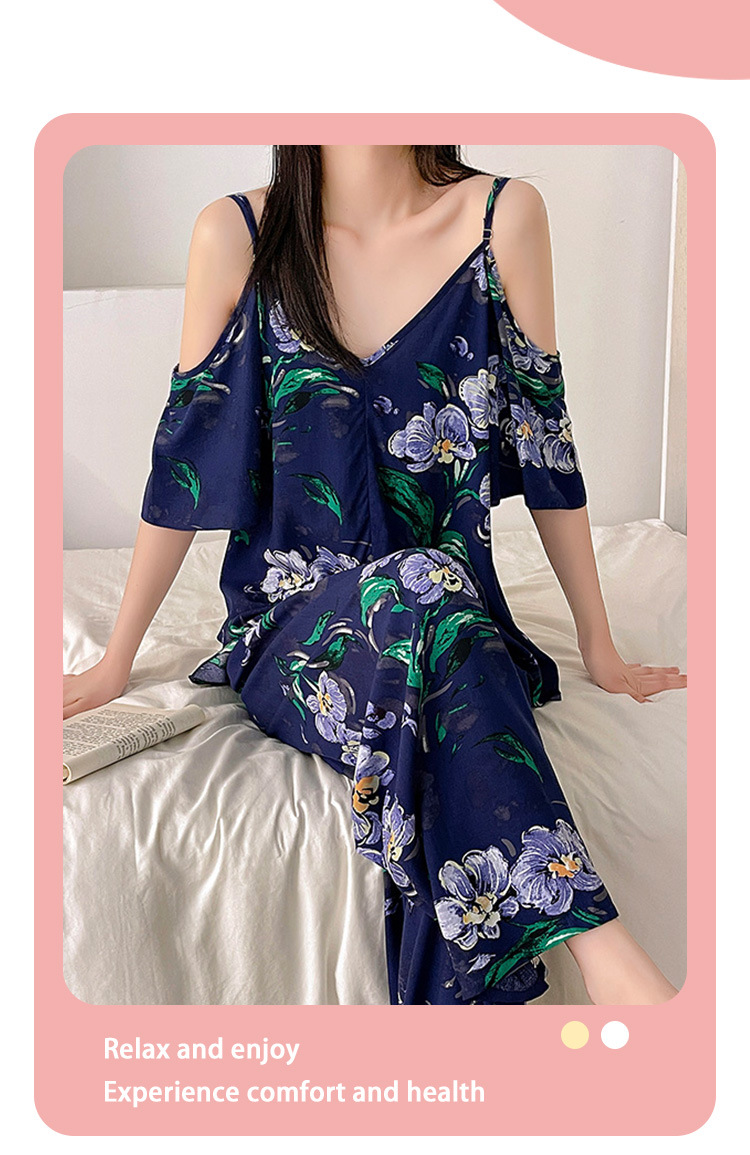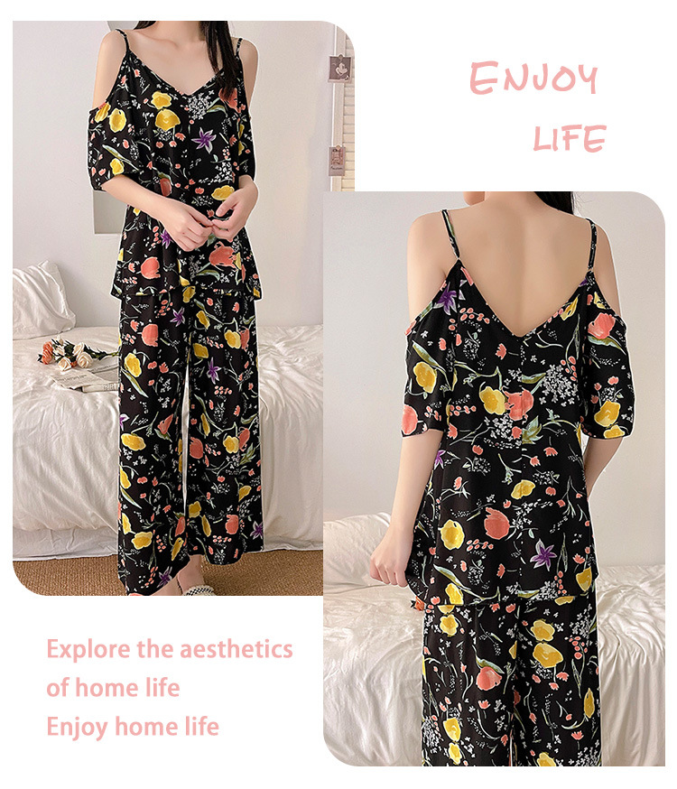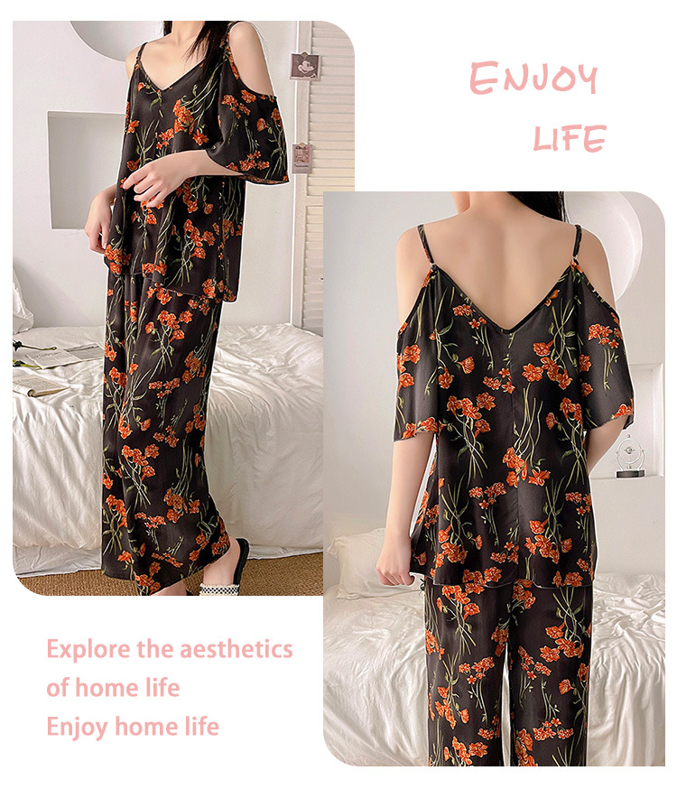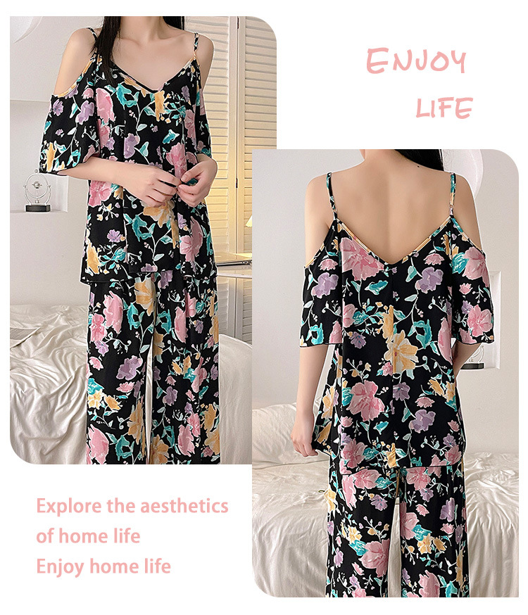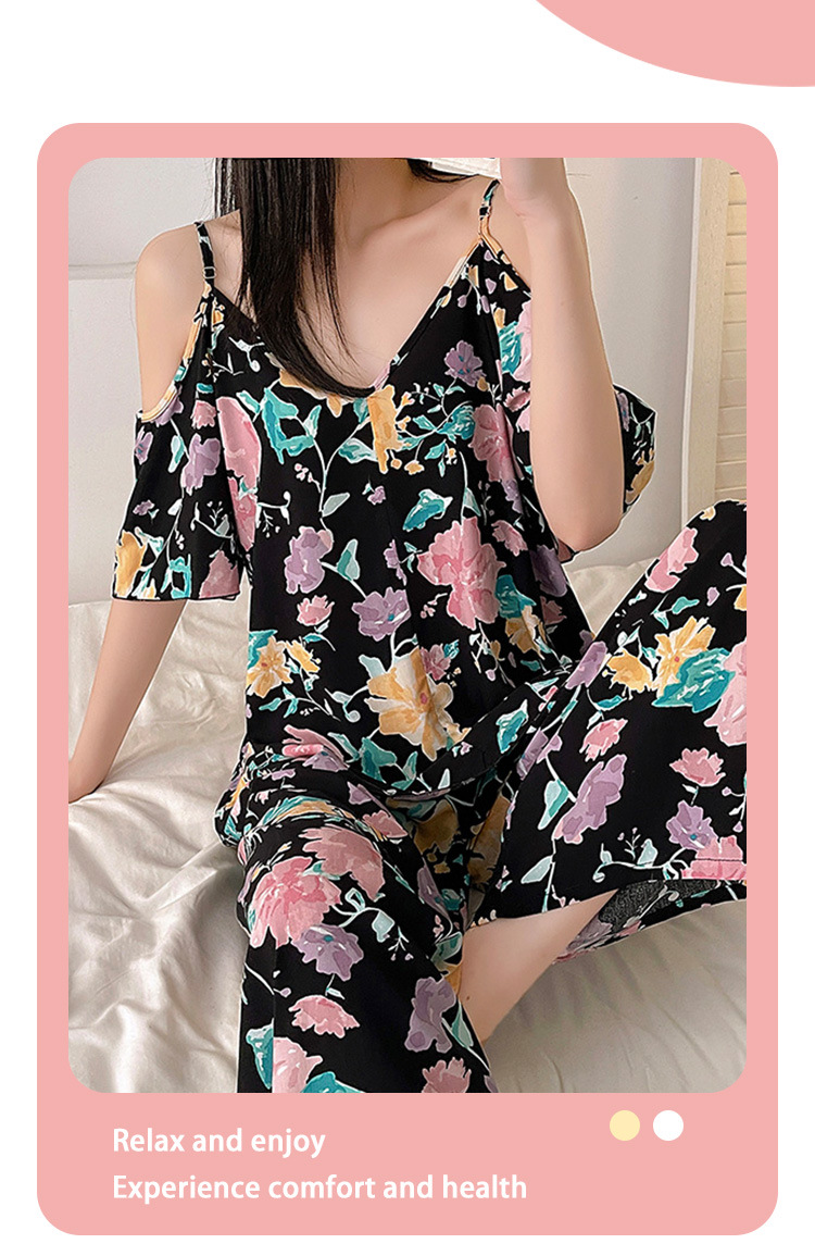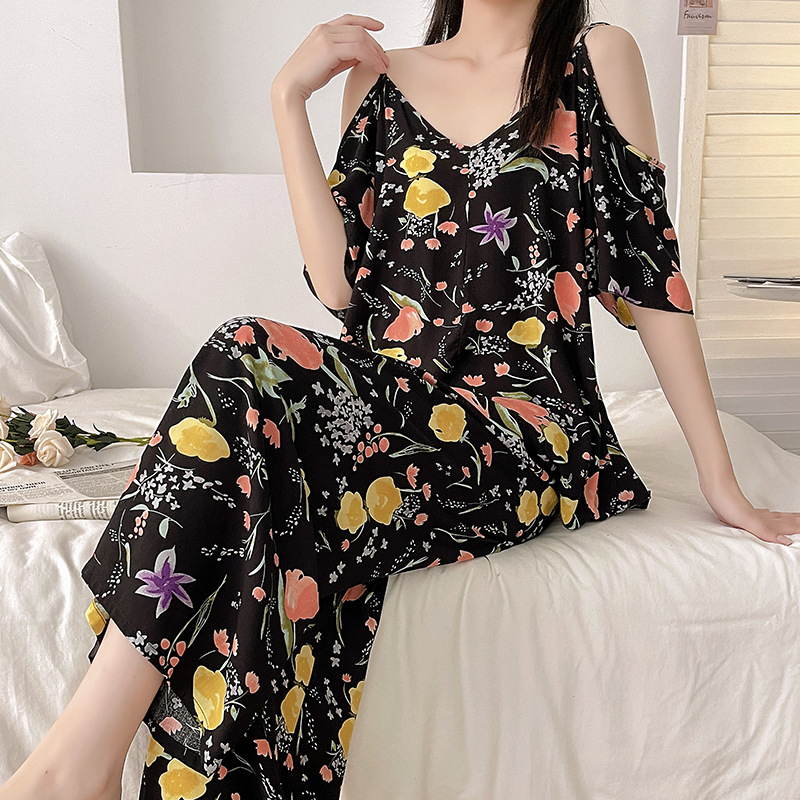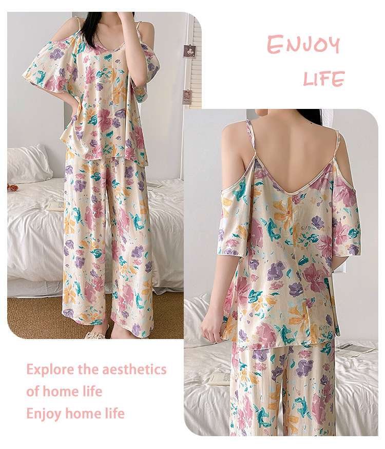 여름 여성용 오프숄더 잠옷, 고급 단색 면 실크 홈웨어 세트, 야외에서 착용 가능, 캐주얼 투피스 얇은 슈트스토어 가기