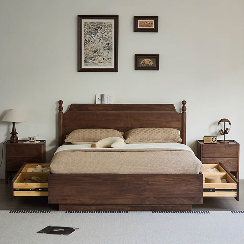 북미 검은 호두 단단한 나무 높은 상자 저장 침대 체리 나무 중세 스타일 1.68m 공기압 서스펜션 더블 침대