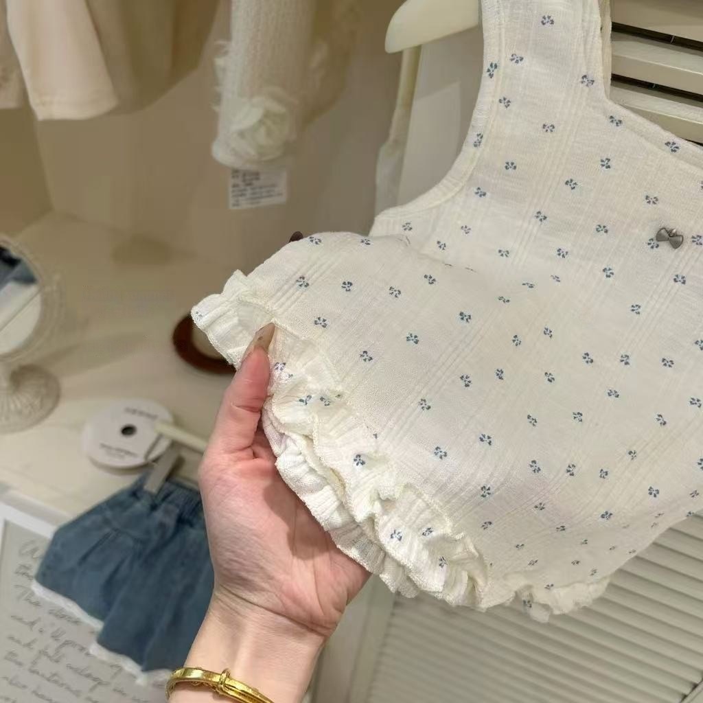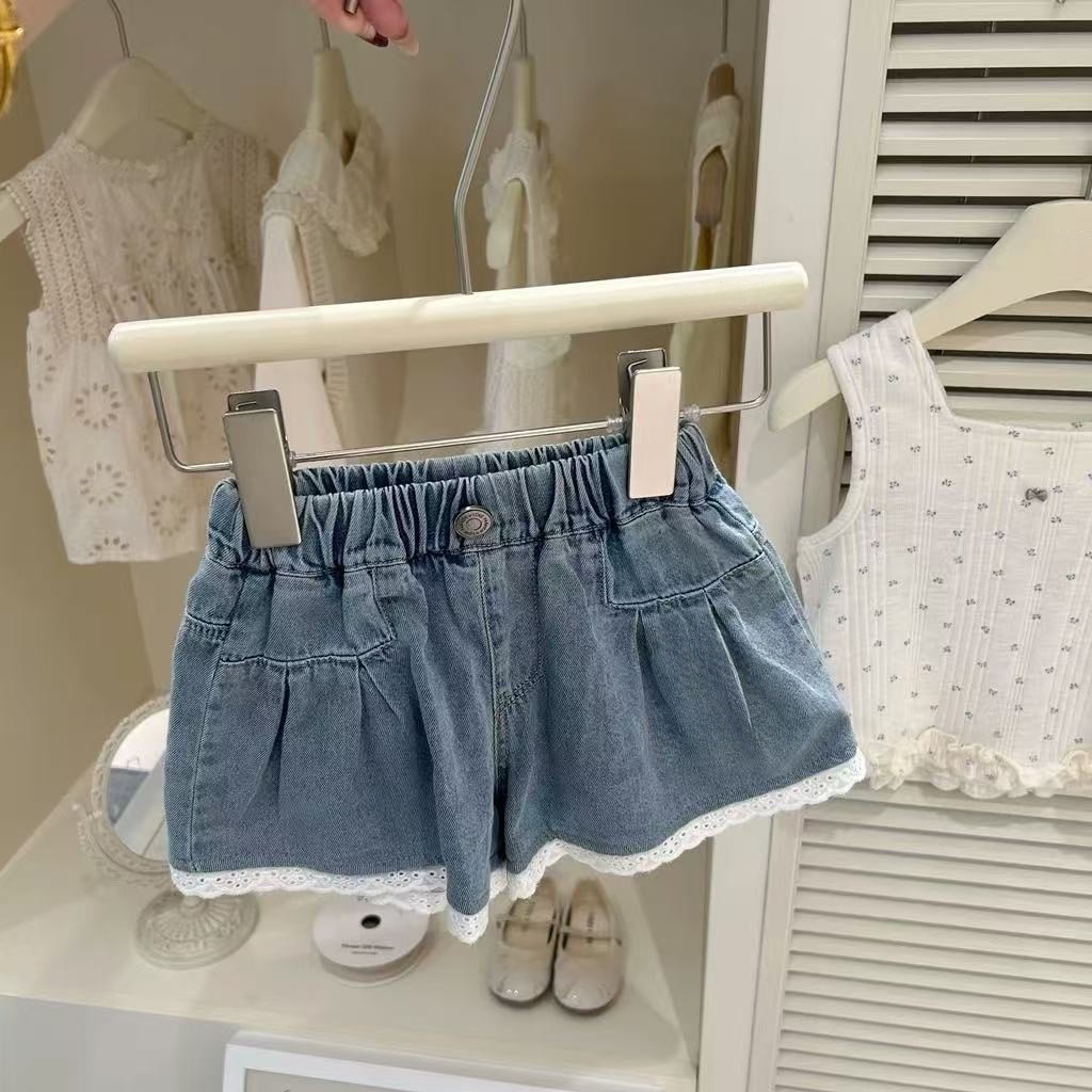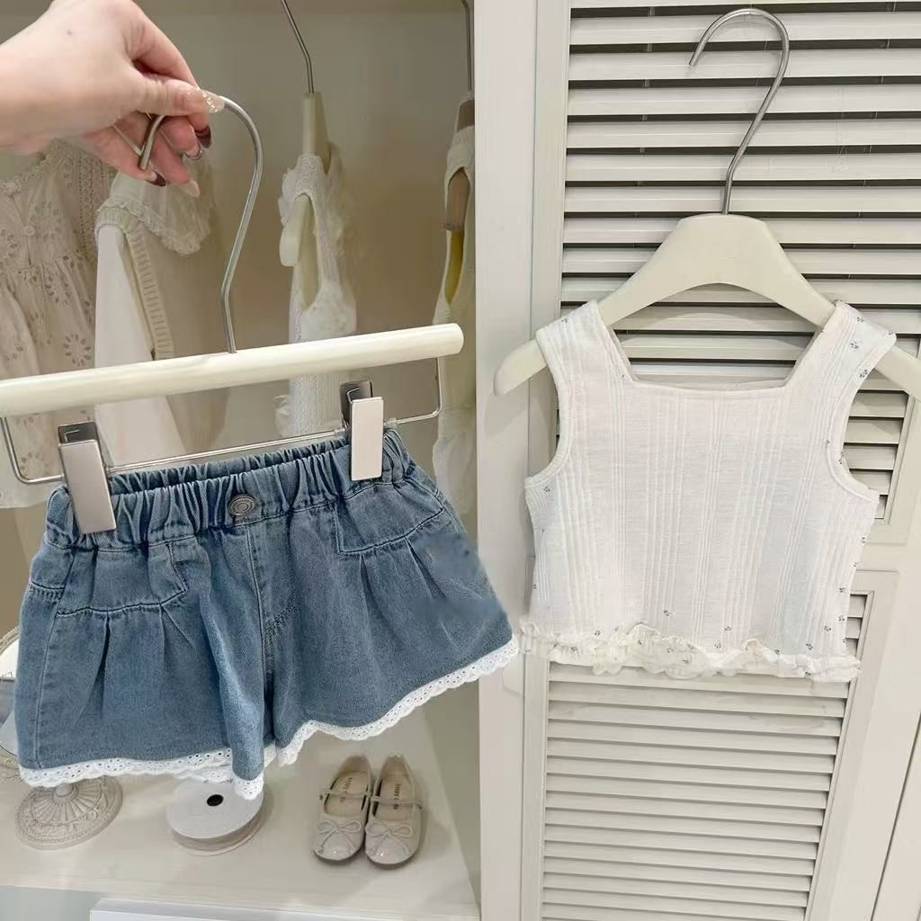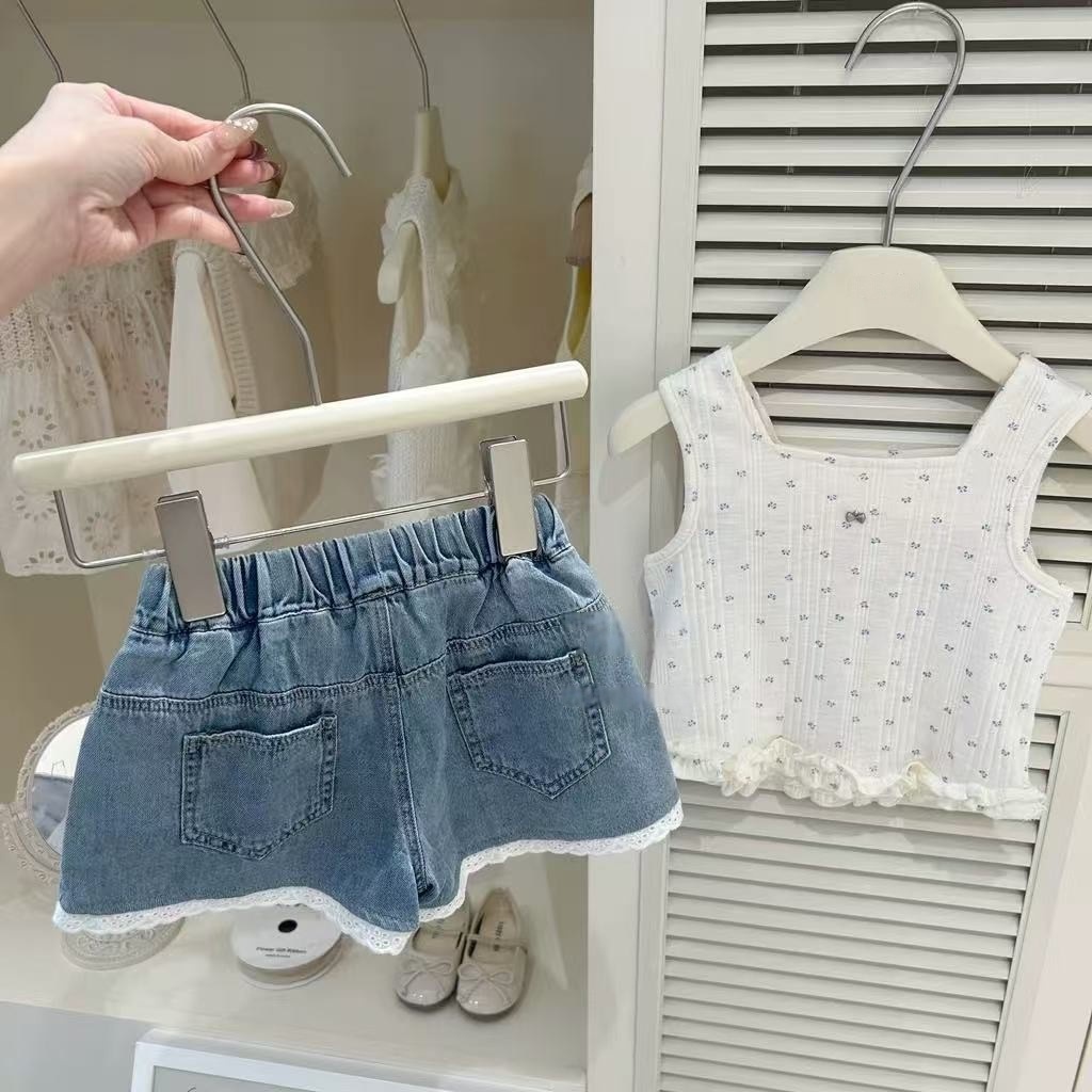 [어린이 스타서클] 2025 년 여름 소녀 꽃 레이스 니트 조끼 데님 반바지 아기 서양식 투피스 세트